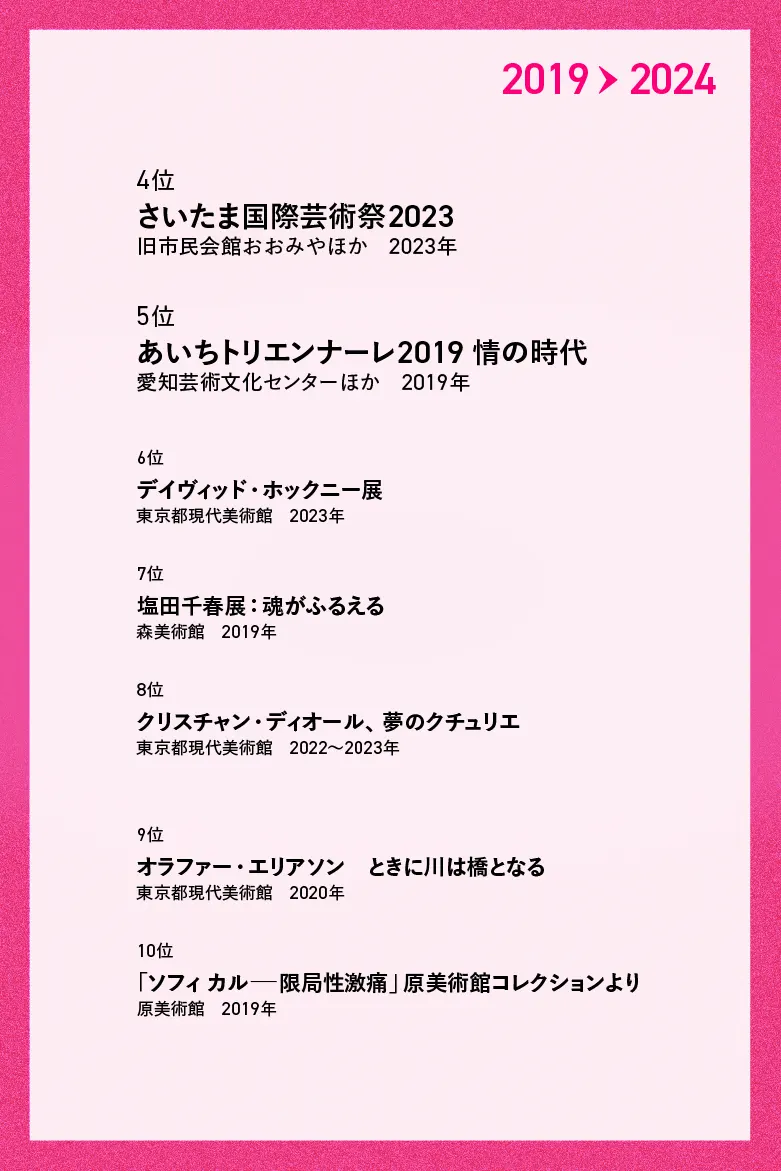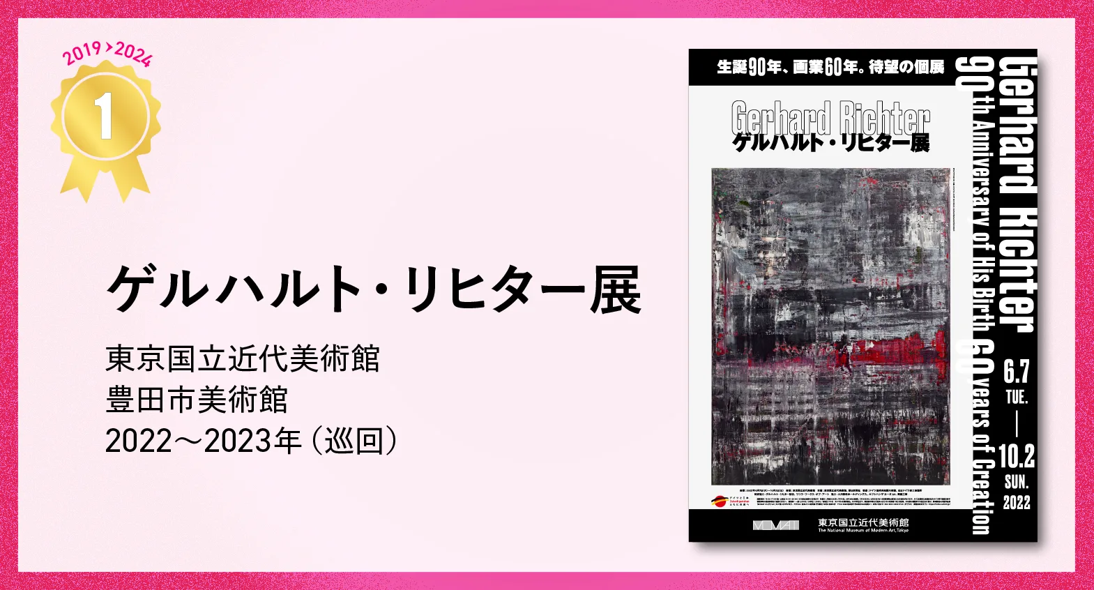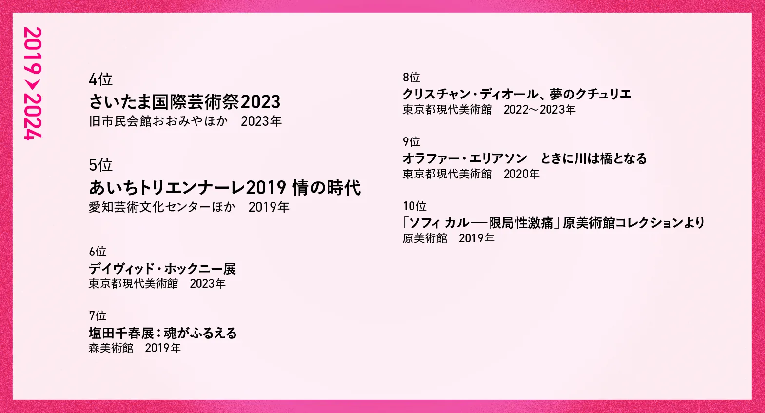 ユーザー投票をオンラインフォームで実施。400件の候補展覧会を①2004〜08年開幕、②2009〜13年開幕、③2014〜18年開幕、④2019〜24年6月開幕の4期間にわけ、お一人につき1期間5件まで投票可とした。合わせて投票した展覧会に関するコメントも募集。(詳細はこちら)④アワード結果発表:8月31日