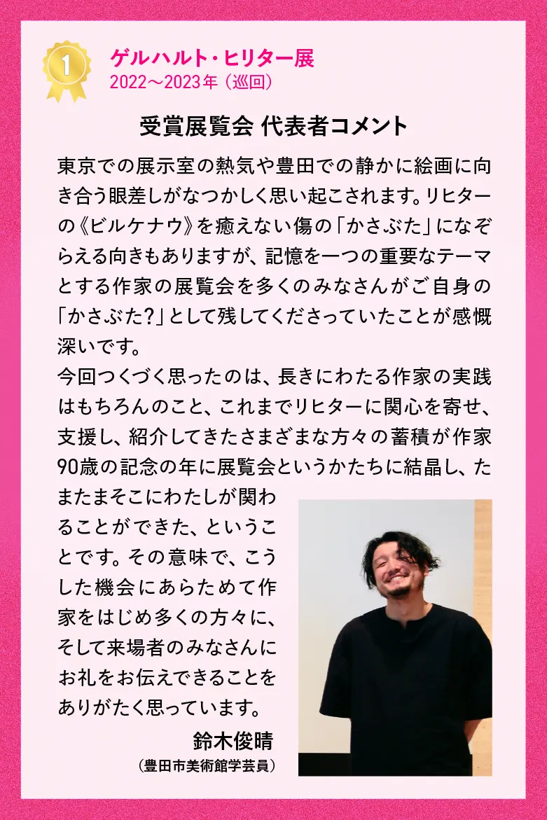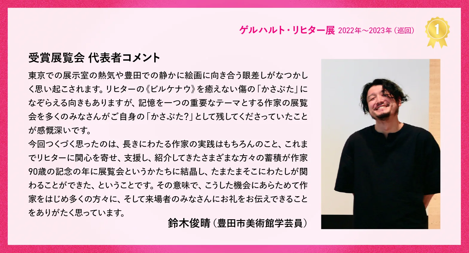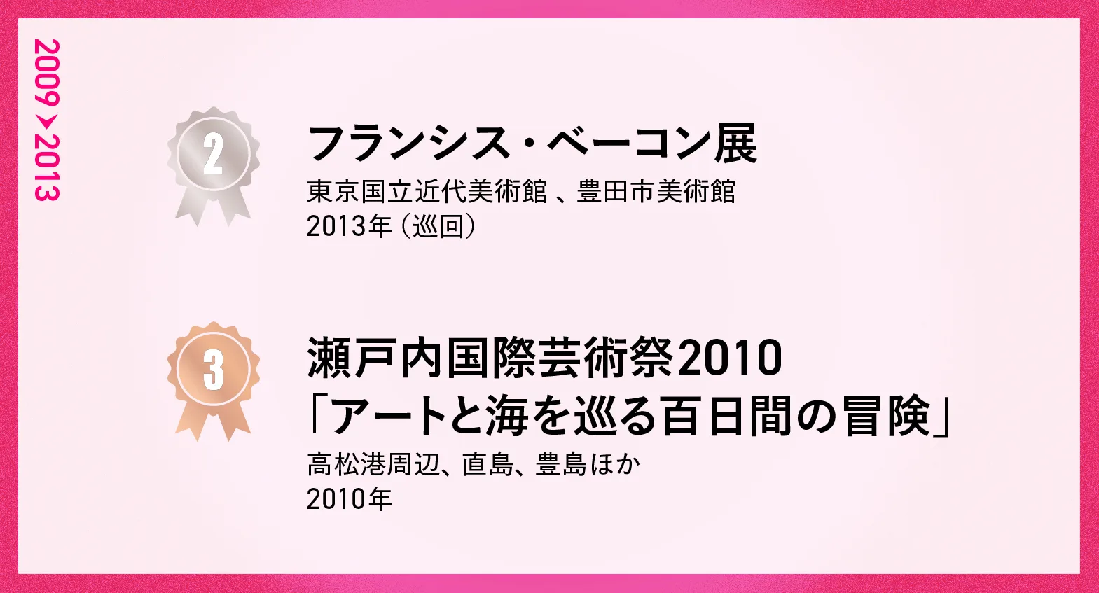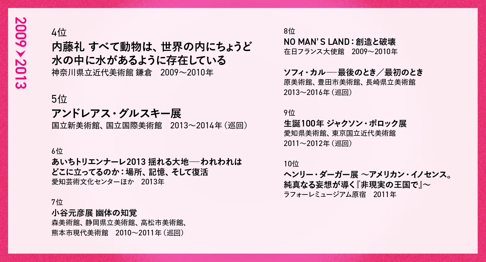 ユーザー投票をオンラインフォームで実施。400件の候補展覧会を①2004〜08年開幕、②2009〜13年開幕、③2014〜18年開幕、④2019〜24年6月開幕の4期間にわけ、お一人につき1期間5件まで投票可とした。合わせて投票した展覧会に関するコメントも募集。(詳細はこちら)④アワード結果発表:8月31日