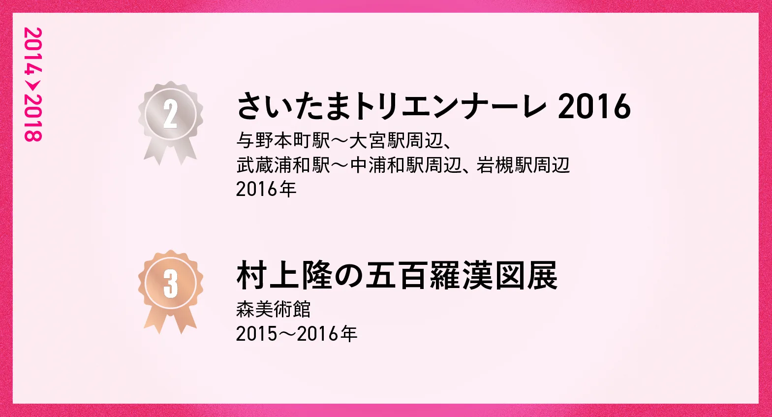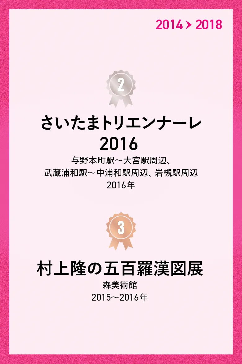 「未来の発見!」をテーマに掲げた「さいたまトリエンナーレ2016」が第2位、そして全長100mに及ぶ超大作《五百羅漢図》が日本で初公開された「村上隆の五百羅漢図展」が第3位に輝きました。