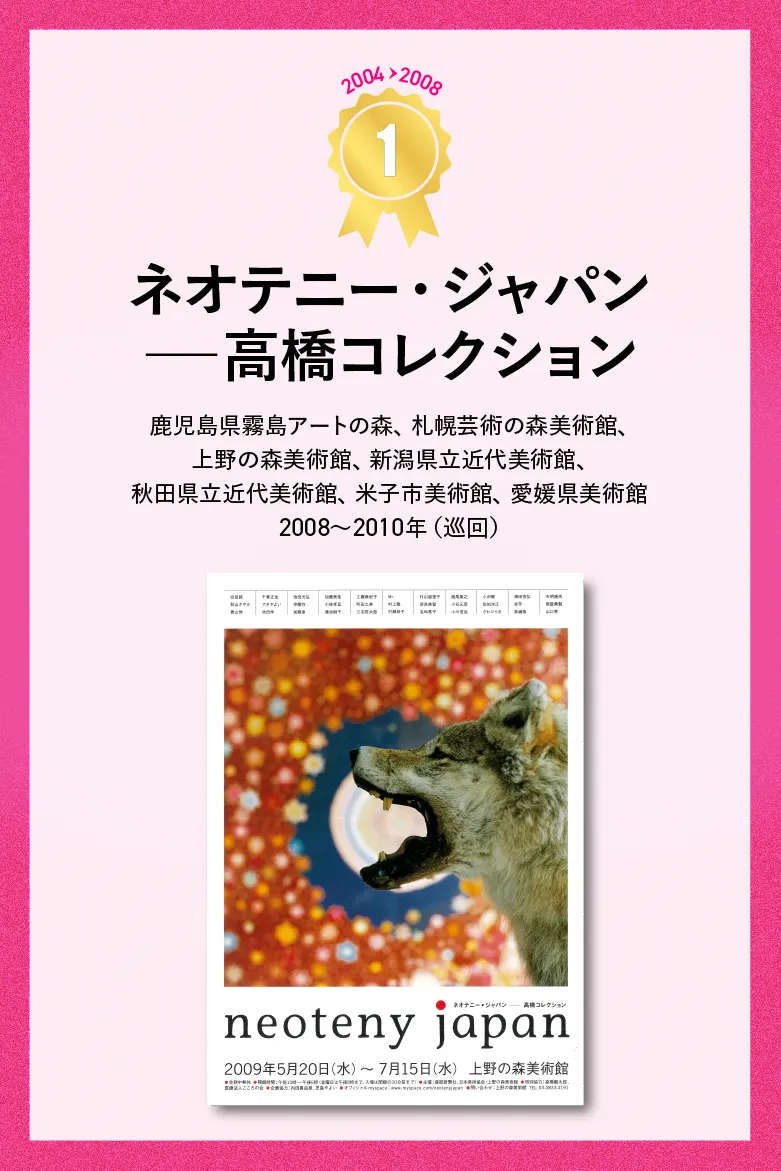 2008年7月に鹿児島県霧島アートの森でスタートし、2010年の愛媛県美術館に至るまで7館を巡回。「neoteny(幼形成熟の意)」をキーワードに、奈良美智さん、村上隆さんをはじめとする30人以上の作家の作品から構成されました。本展を見て日本の現代アートに興味を持ったという人も多いのではないでしょうか。