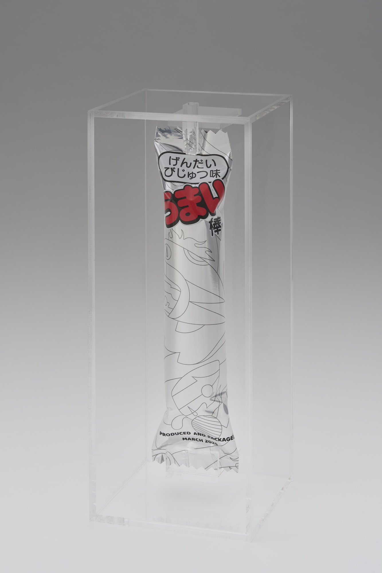 ニューヨークを拠点に活動し、2025年3月〜5月に麻布台ヒルズ ギャラリーで東京で初となる大規模個展「松山智一展 FIRST LAST」を開催した松山智一。「うまい棒」《げんだいびじゅつ味》は、同展のサテライト企画のひとつとして開発された作品だ。15円(かつては10円)という安価な設定で知られる国⺠的な駄菓⼦「うまい棒」を、発売当初の価格の1万倍となる10万円の“げんだいびじゅつ味”として、限定50個で販売した。