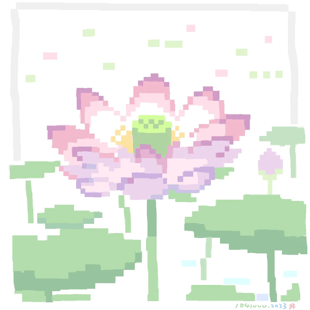 豊井は2015年頃からピクセルアートではなく、デジタルのペンによる絵の制作も行ったり、ほかにも切り絵や3DCGや360°画像にも挑戦している。gnckは作品集に寄せた論考のなかで、このような姿勢をメディウムであるピクセルそれ自体を再定義する仕事として「ピクセル・インパーフェクト(*6)」と呼んでいる。gnckも述べるように《はす》(2023)において豊井は、ピクセル的に描く花托と、有機的な手描き感を残しながら描く部分を共存させている。