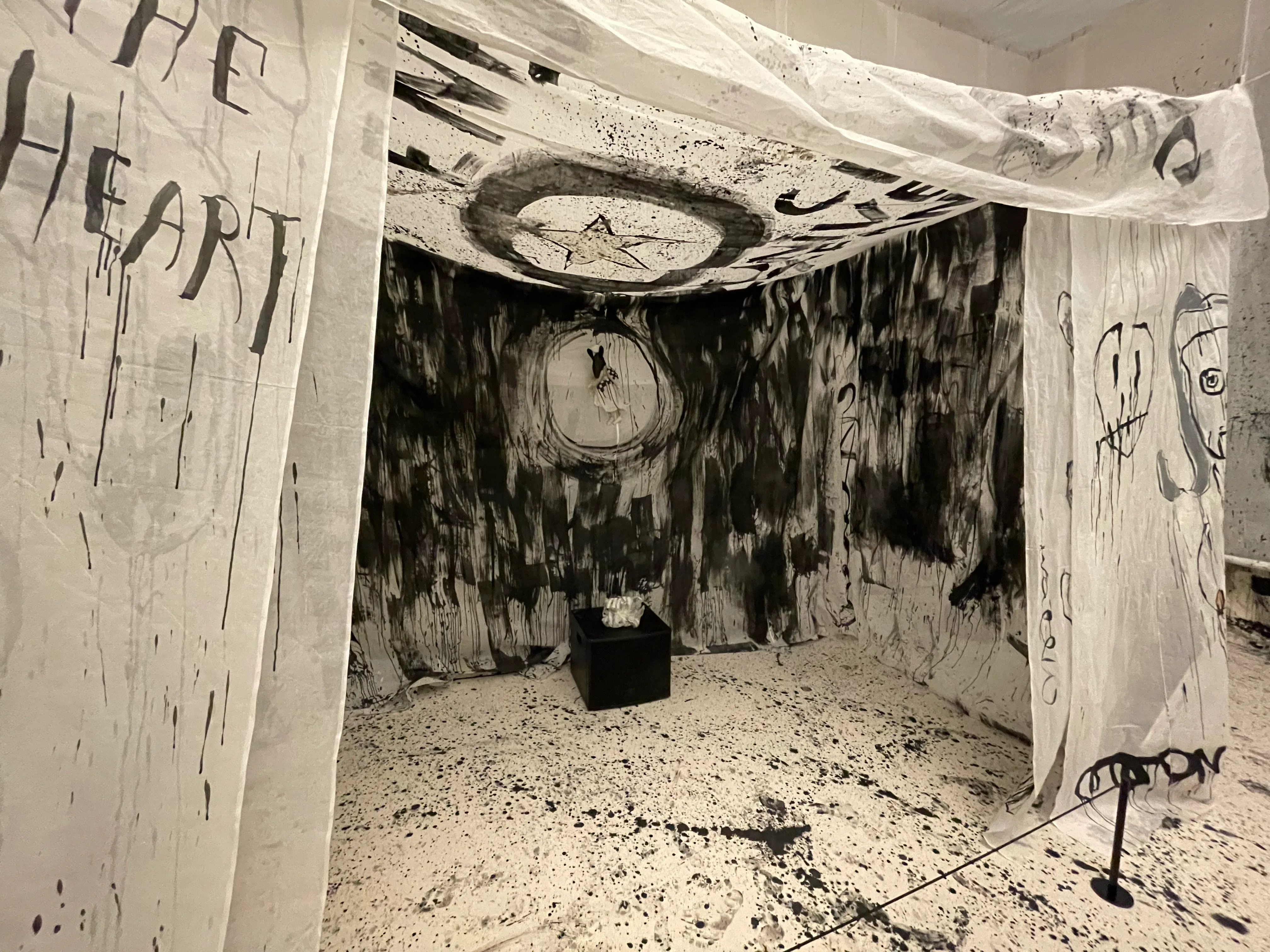 第1の部屋「混沌 (Chaos)」の入口でチャールズ・ディケンズの小説『クリスマス・キャロル』に出てくる亡霊マーレイに迎えられた鑑賞者は、その後オカルティックな祭壇を目撃する。オーガンジーで仕切られたテントからは謎めいた激しい音楽が流れ、死者復活の儀式をとり行っているような切迫感と混乱は、まさしくカオスだ。