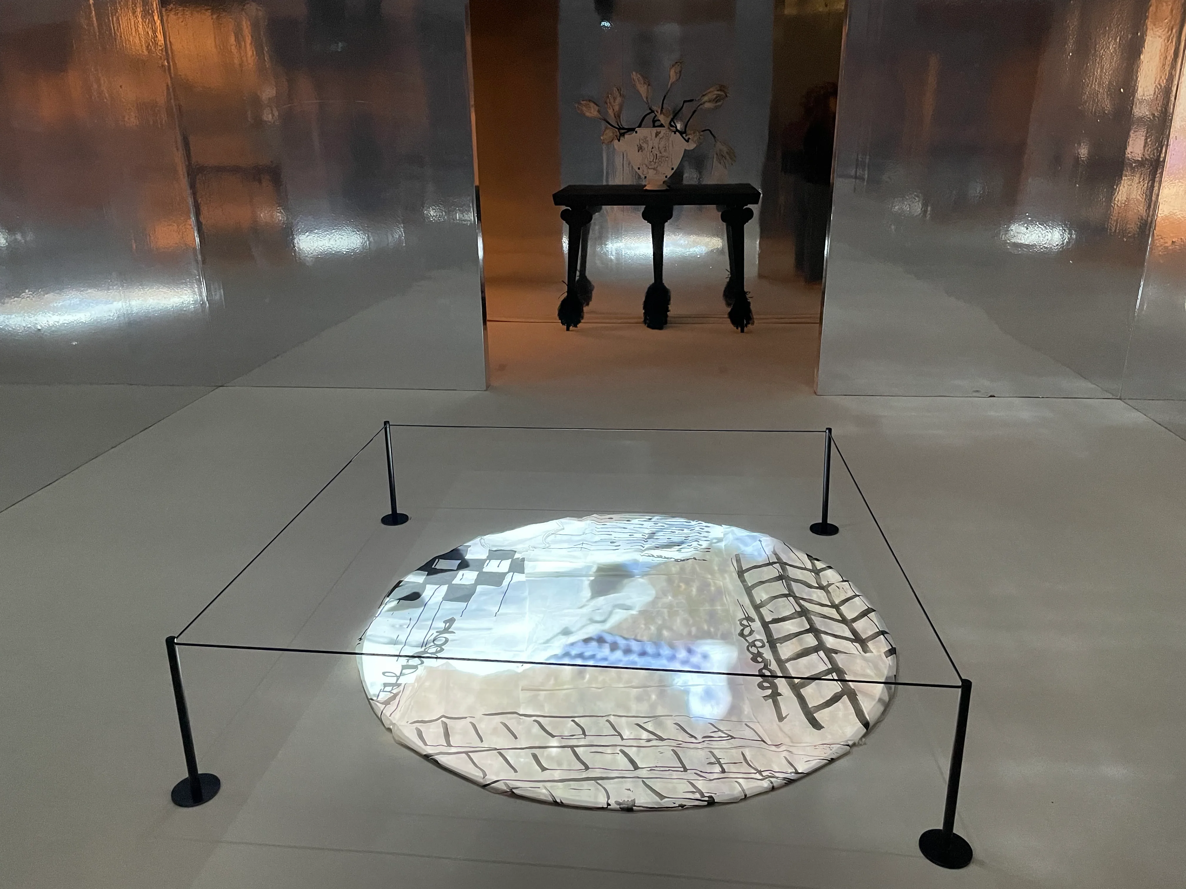 第2の部屋「黙想(Reflection)」は、アルミ箔反射シートが壁一面を覆い、静謐でミステリアスな雰囲気に一変する。さながら生者と死者が交わる場といったところだろうか。湖に浮かぶ月を覗き込むように、ふたりの人物(ひとりは頭部に馬のマスクを被っている)が野原を駆ける映像作品《Incipit Vita Nova》(2023)が鎮座する。