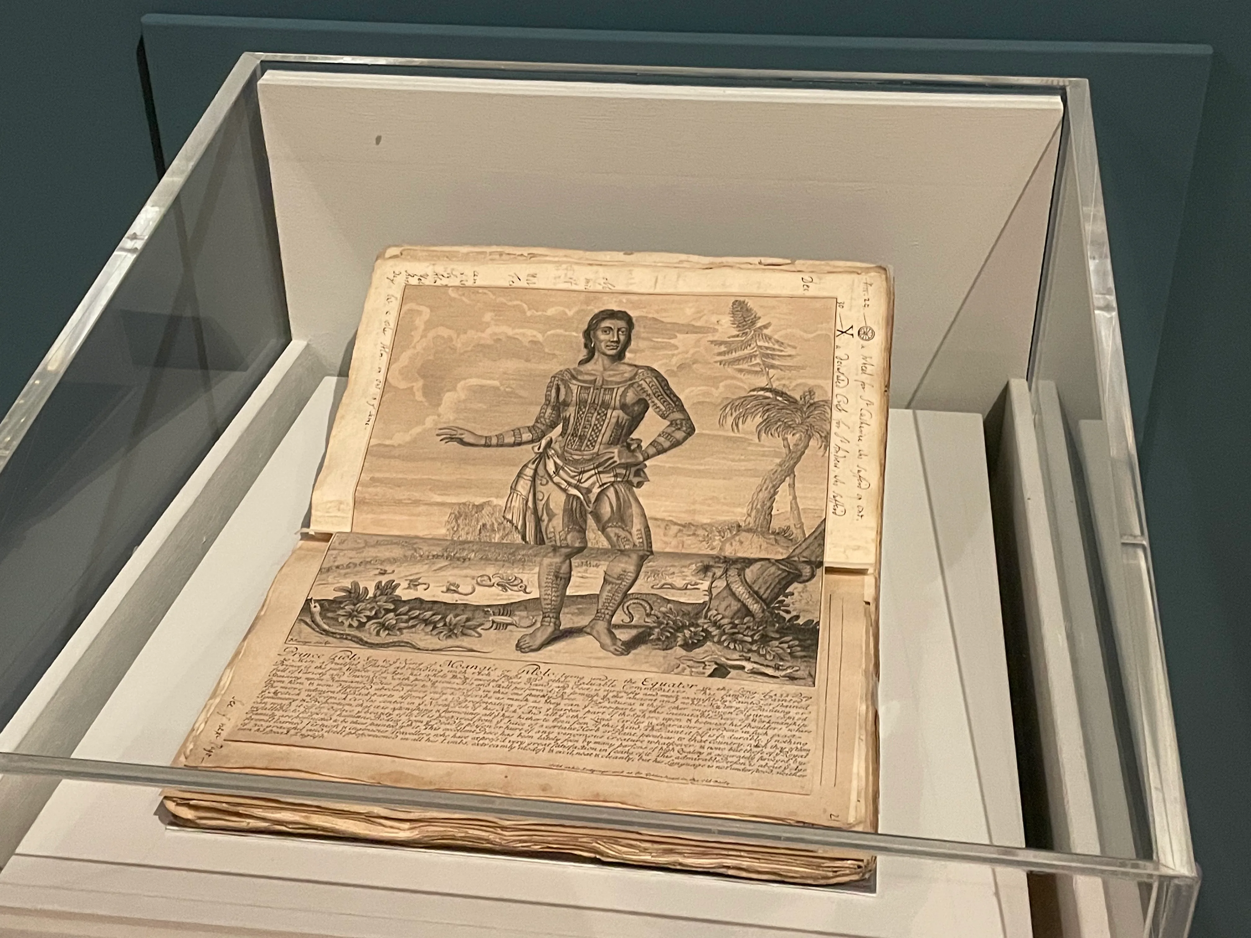 ここでは美術館よろしく、展示物のすべてに作家が書き下ろしたキャプションがついている。たとえばこの1962年に制作された銅版画は、奴隷としてイギリスに連れてこられたジオロと呼ばれる刺青をしたフィリピン人だという。天然痘で逝去したのち、皮膚を採取され、オックスフォードのボドリアン図書館に展示された。その反人道的な顛末がアバドによって明らかにされる。