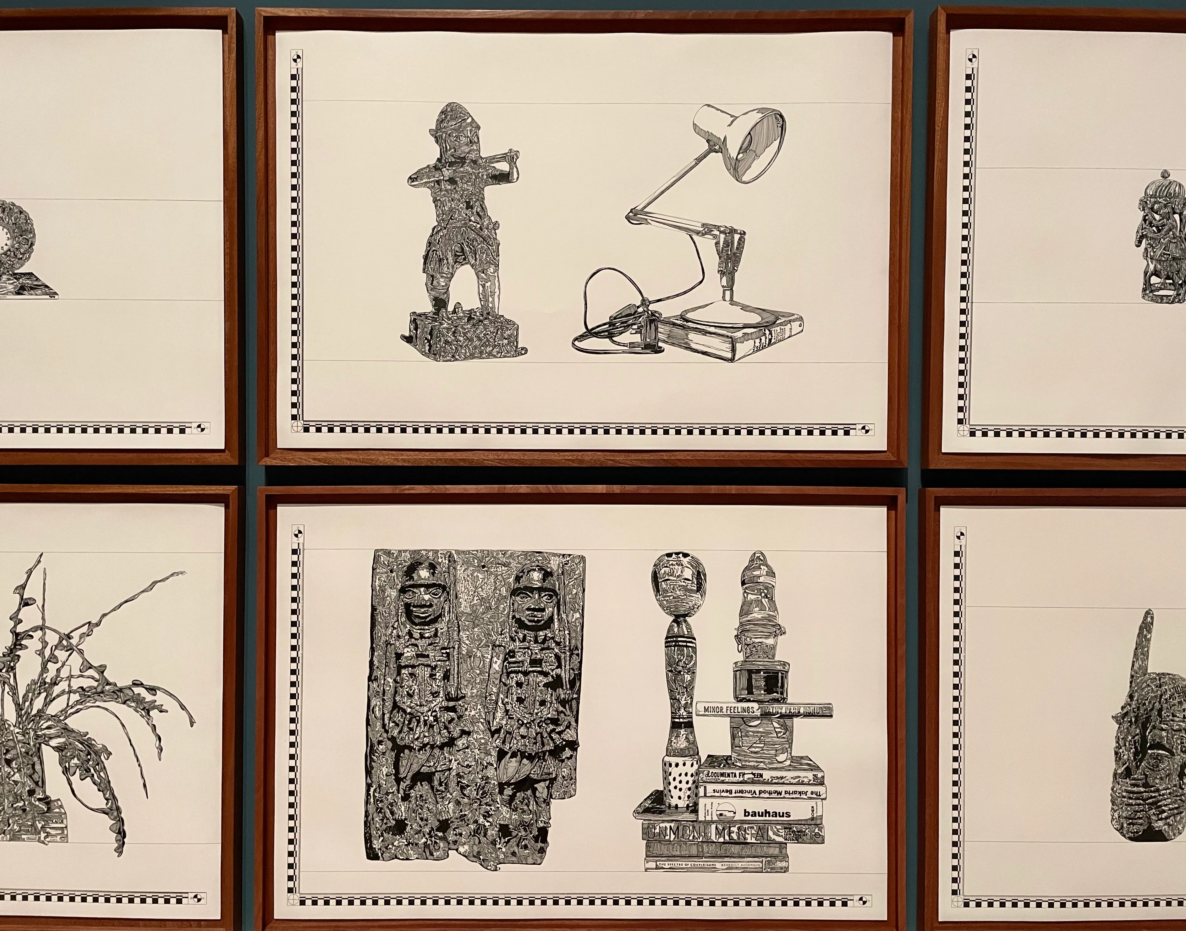 壁一面にずらりと並んだ《1897.76.36.18.6 No.1-No.18》(2023〜24)は、ベニン王国(現在のナイジェリア)から植民地時代に略奪し現在は大英博物館が収蔵しているベニン青銅器と、各青銅器の形を模してアバドの自宅にある品々を組み合わせたものを比較するように平面画面に落とし込んだシルクスクリーン版画。収蔵品目録を作成するように計測、配置されている様子は美術館というシステムへのオマージュだろう。かつて英国陸軍および海軍の軍事装備の主要な貯蔵施設として使われていた建物に自宅があるアバドにとって、家というパーソナルな空間で個人的な感情に沿って、盗まれた工芸品の物語を辿るという作業は、一種の祈りのようにも思える。
