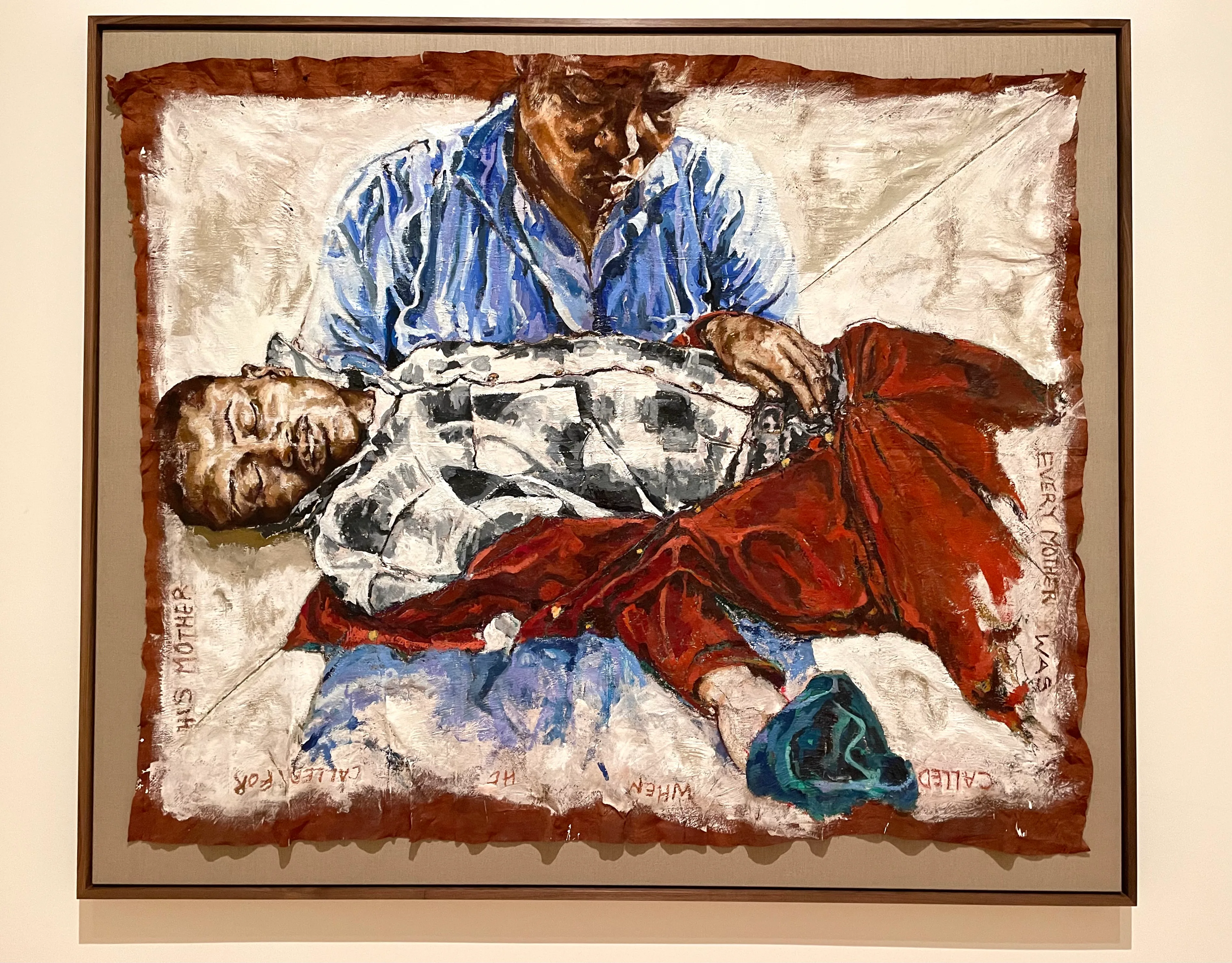 2020年、アメリカで黒人男性が白人警官の暴行により死亡したジョージ・フロイド事件をモチーフにした《Pietà》(2024) では初めて樹皮布を支持体として利用するなど、いまだに新しい制作方法の研究に余念がない。ファイナリストの中では最年長者であるが、進化する作家であり続けている。