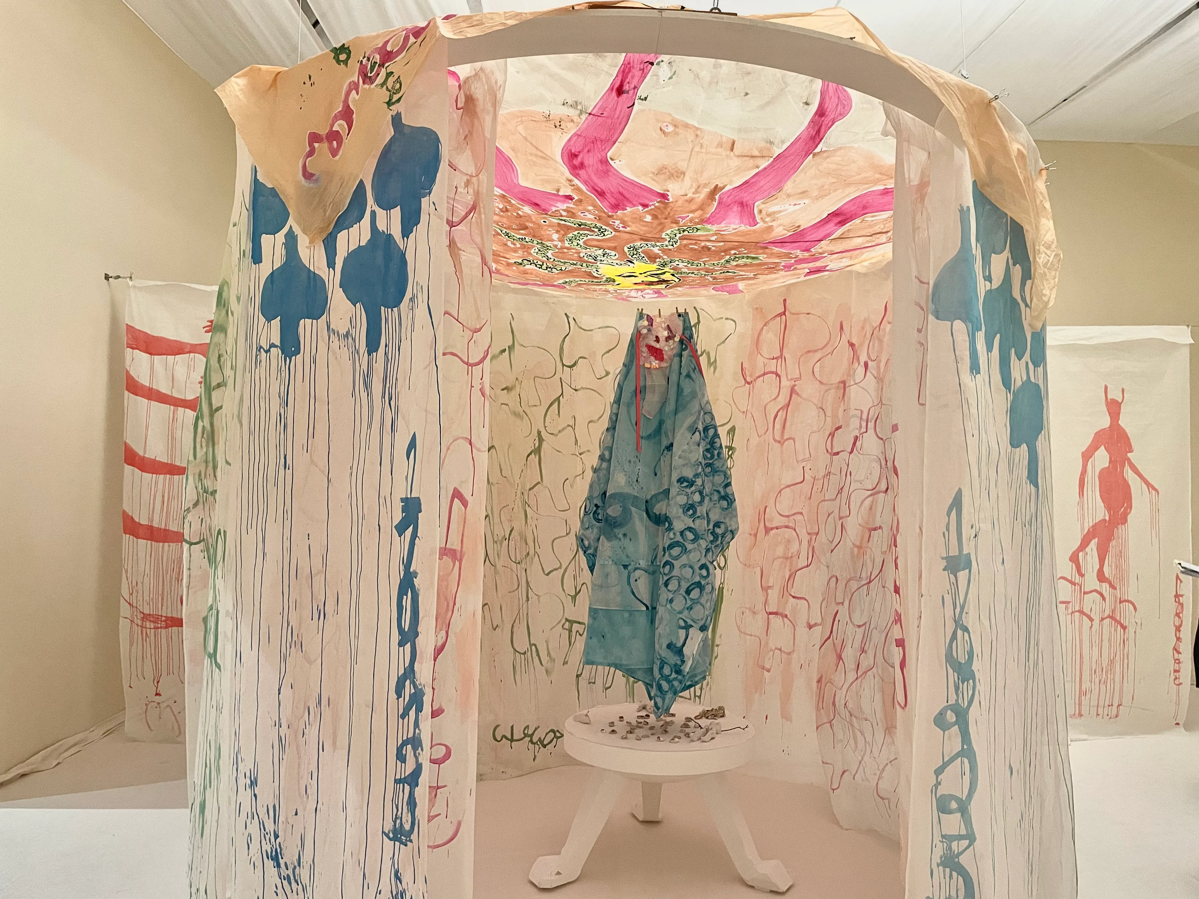 第3の部屋「上昇(Ascension)」は、巫女の足跡に招かれ、神殿へ辿り着く。カラフルで明るいペイントと、軽やかに揺れるオーガンジー生地は、死を受け入れ、再出発へと向かう明るい希望を感じさせる。