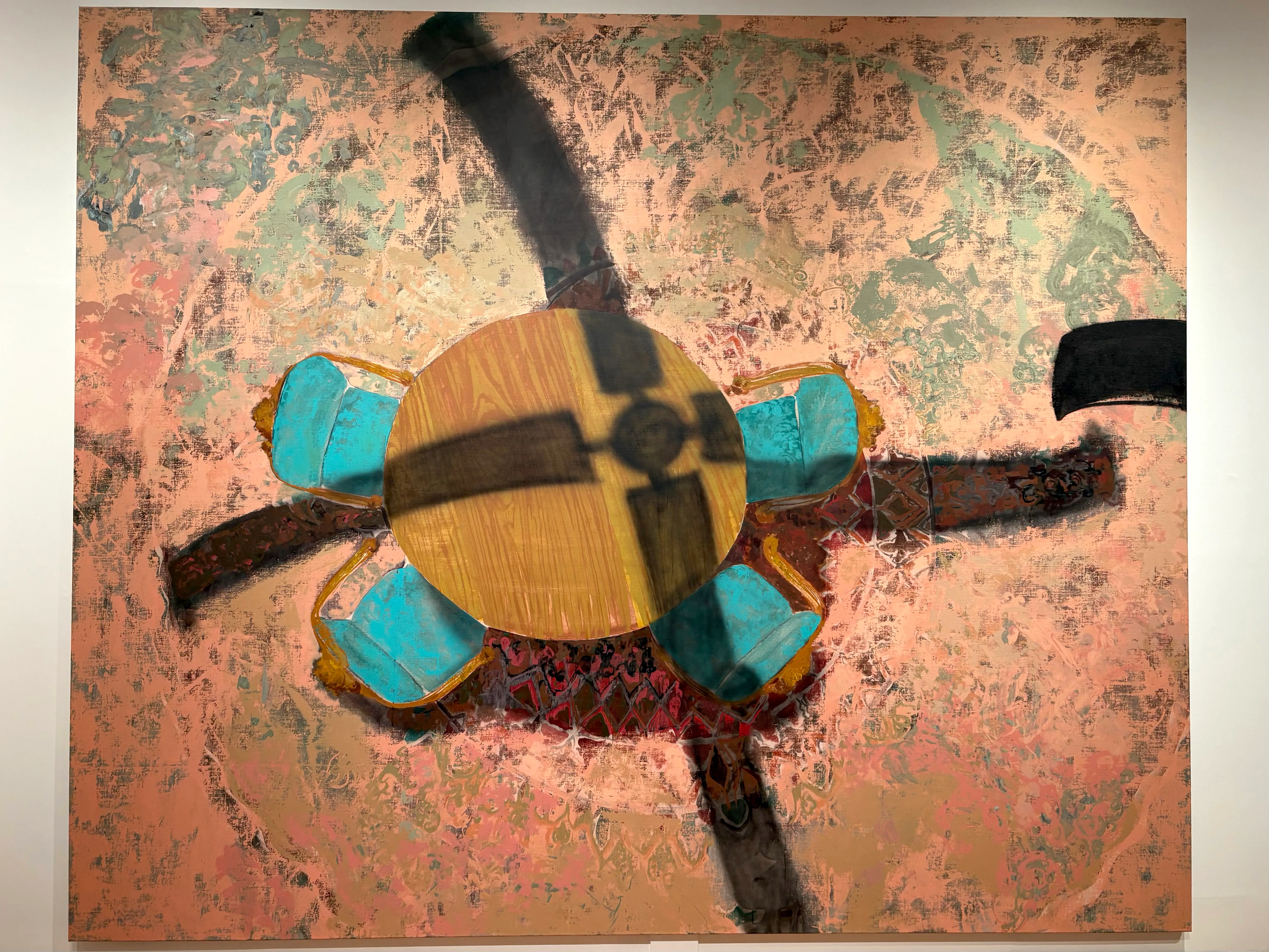 たとえば、《The Grinder》では、円卓と四脚の椅子がドローン視点のように俯瞰され、不穏な影——シーリングファンか、ヘリコプターのブレードか、あるいはまったく別の何か——が旋回している。かつては美しいモザイクタイルであっただろう床は砂埃をかぶり、ところどころに残された足跡によって幾何学模様が断片的に姿を現す。その足跡は、この情景が何かが起こったあとの痕跡なのか、あるいは嵐の前の静けさで逃げた人々が息を潜めている状況なのかを曖昧にしている。