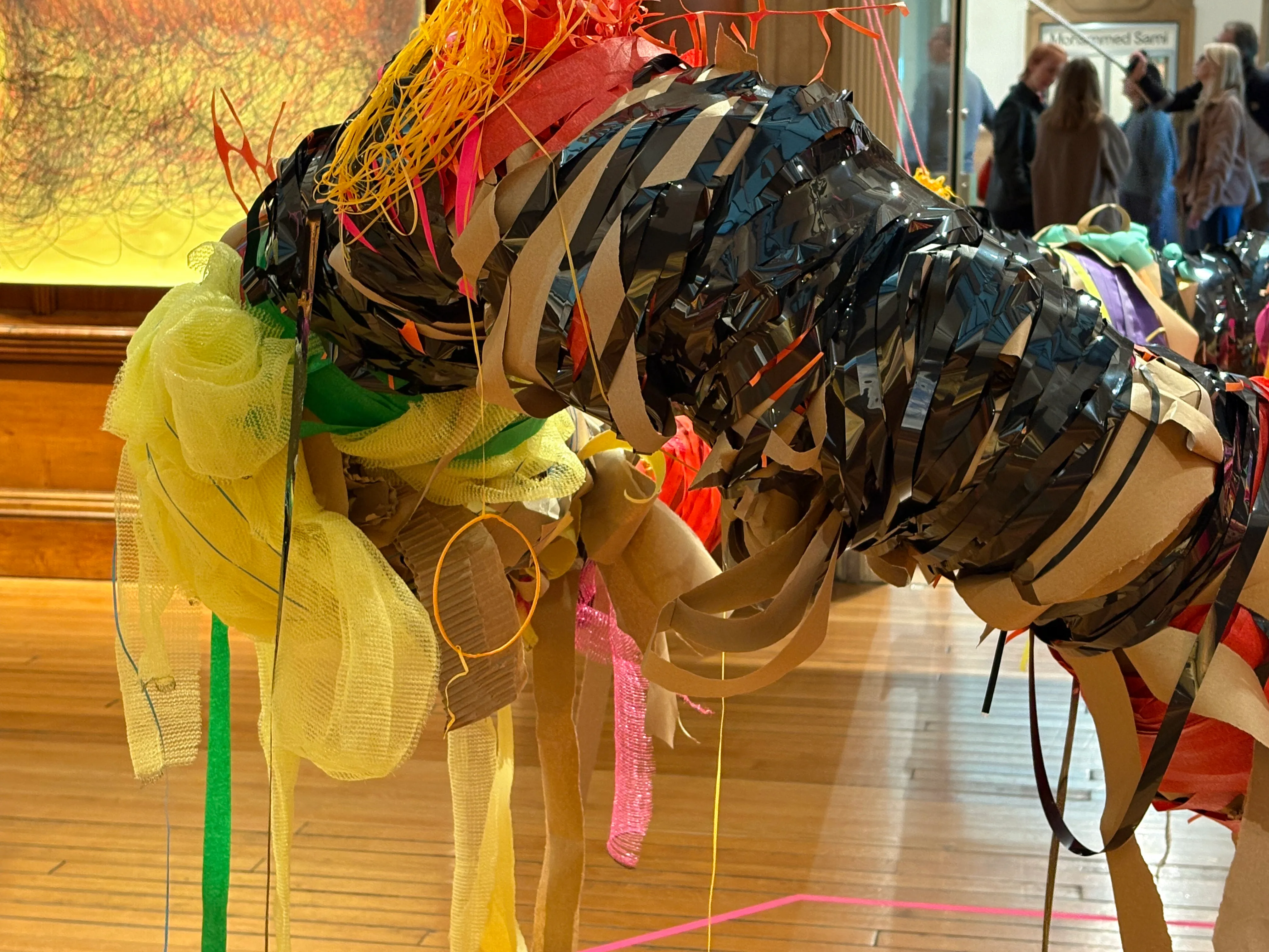 カルーは、プラスチックのダクトホースを素体に、布、ロープ、ビニールテープ、ラップ、紙、VHSテープなど身近な素材をぐるぐると巻き付けることによって、カラフルで有機的な立体作品を生み出す。その形態は、まるで人間が捨てた有り合わせの人工物で親鳥が作る巣のようで、彼女にとっての心理的な安全領域を象徴しているように感じる。と同時に、言語でのコミュニケーションが極めて限定的なカルーにとって、制作と発表は世界と関わるための手段であり、同時にセルフケアでもあるのだと強く意識させられる。作品から垂れ下がった素材は、人が通るたびに風に揺れ、作品が鑑賞者と非言語のコミュニケーションを試みているようにも思えた。