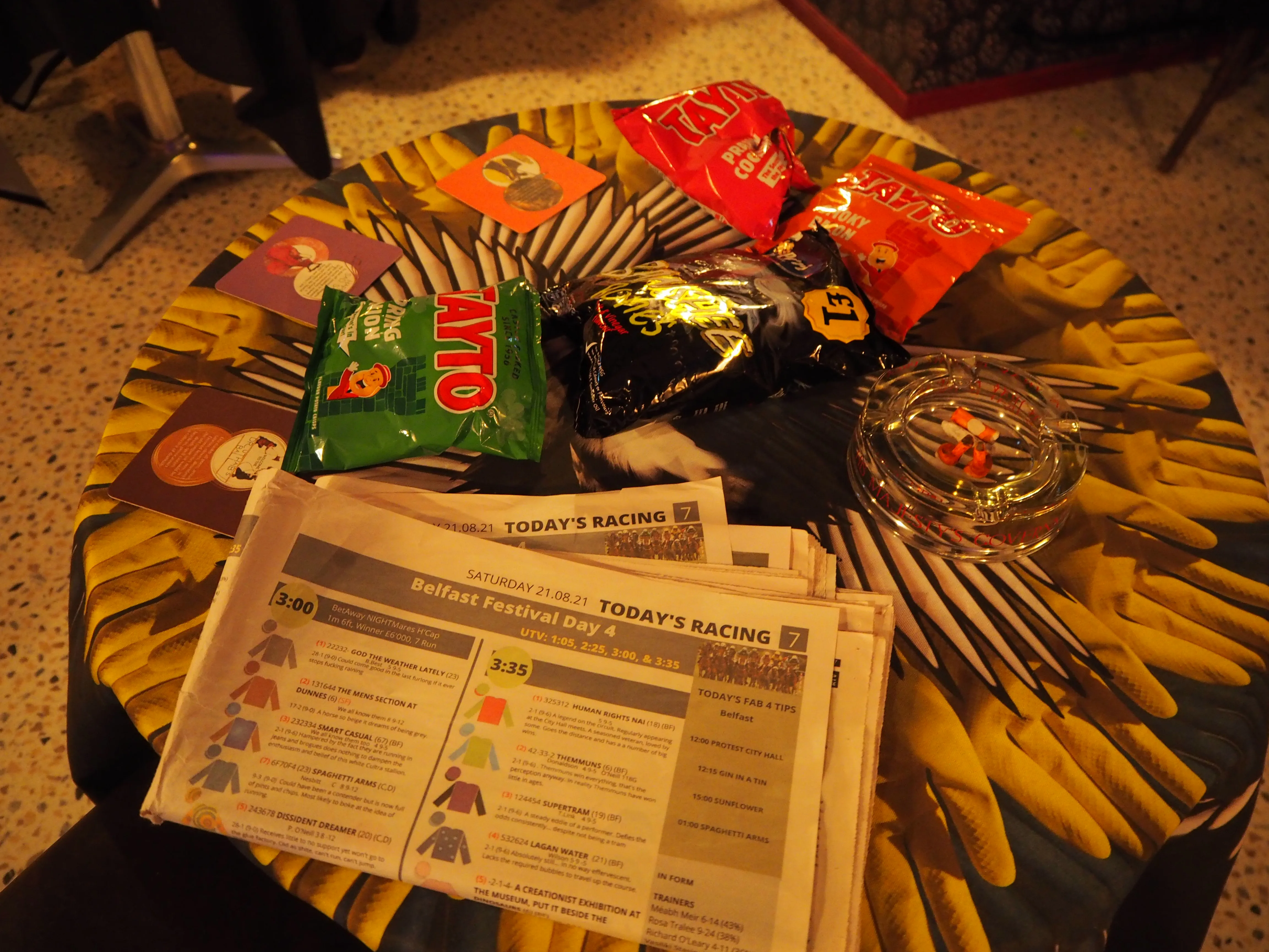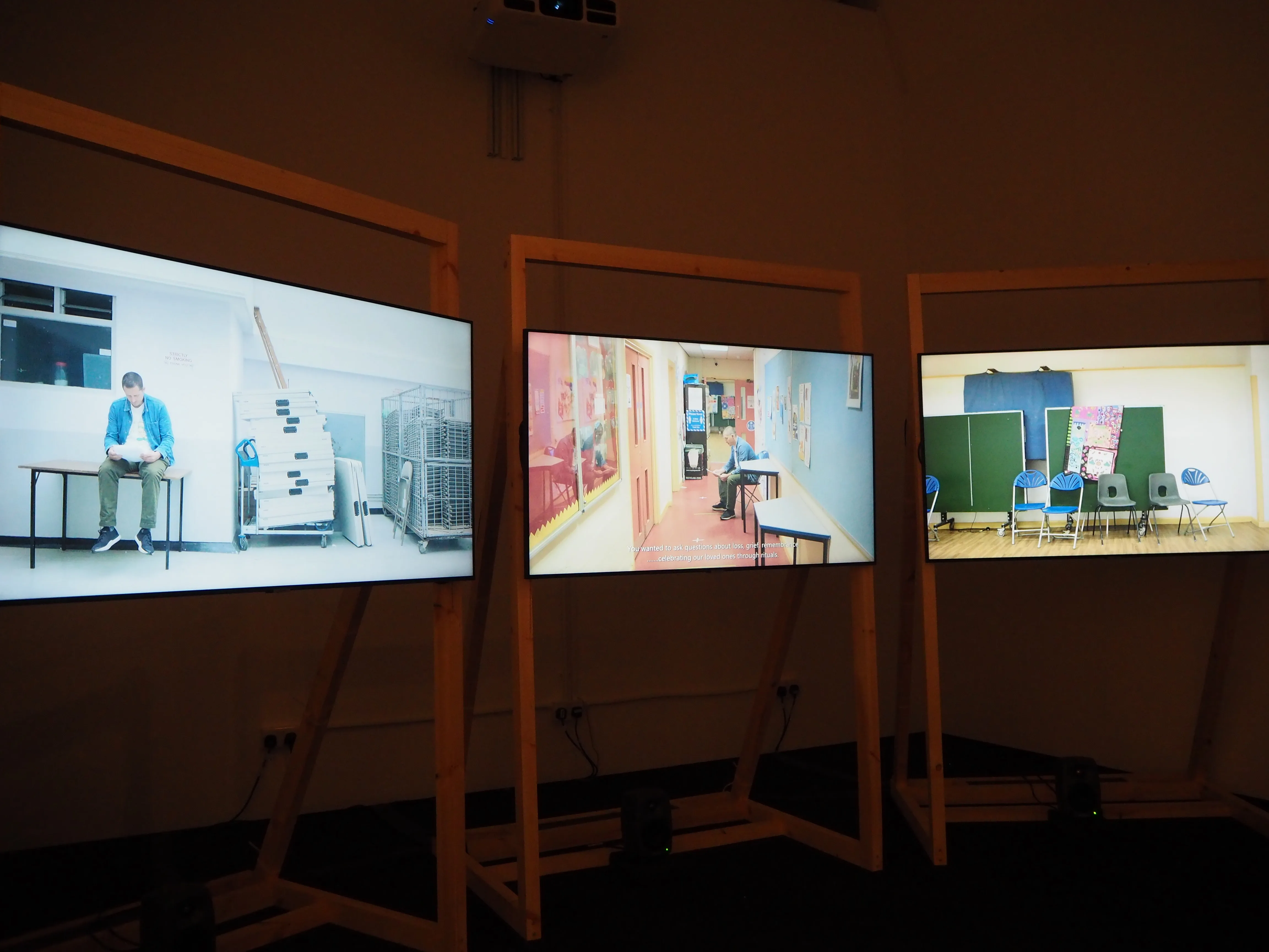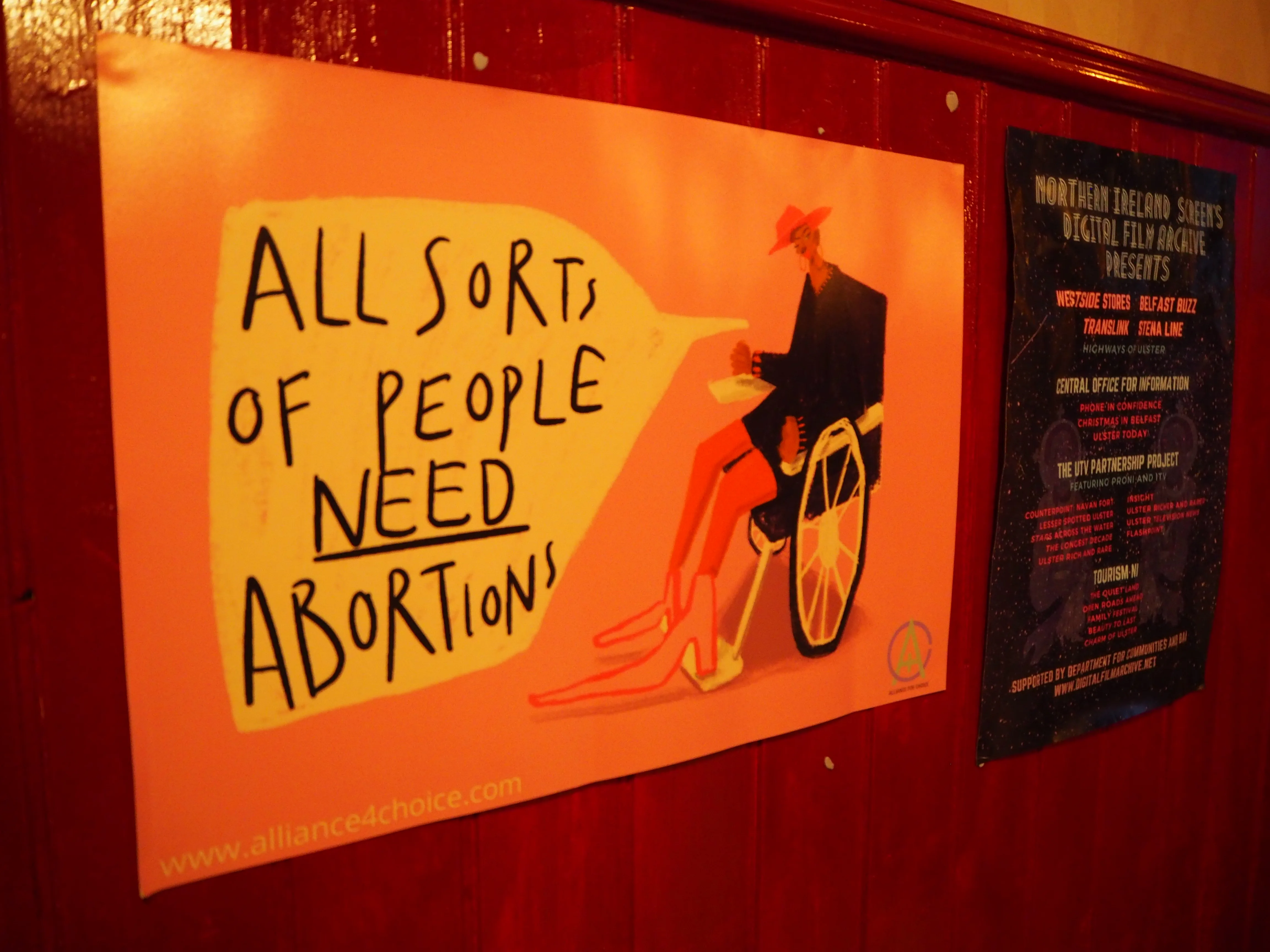 次に見えてくるのは、ベルファストを拠点とするアレイ・コレクティヴによるインスタレーションである。アレイ・コレクティヴは11人のメンバーから成り、北アイルランドでの妊娠中絶の非犯罪化を支援するパブリックアートなど、地元での社会的問題に対してアートの視点からアクションを展開している。彼らが用意する体験型インスタレーションは、まるで小型のパブのようだ。この空間は、アイルランド地方で「síbín」と呼ばれる、無許可でアルコール販売を行う仮設の居酒屋を模して造られている。鑑賞者はバーカウンターにもたれたり、ソファに腰掛けたりしながら映像作品を鑑賞することができた。
