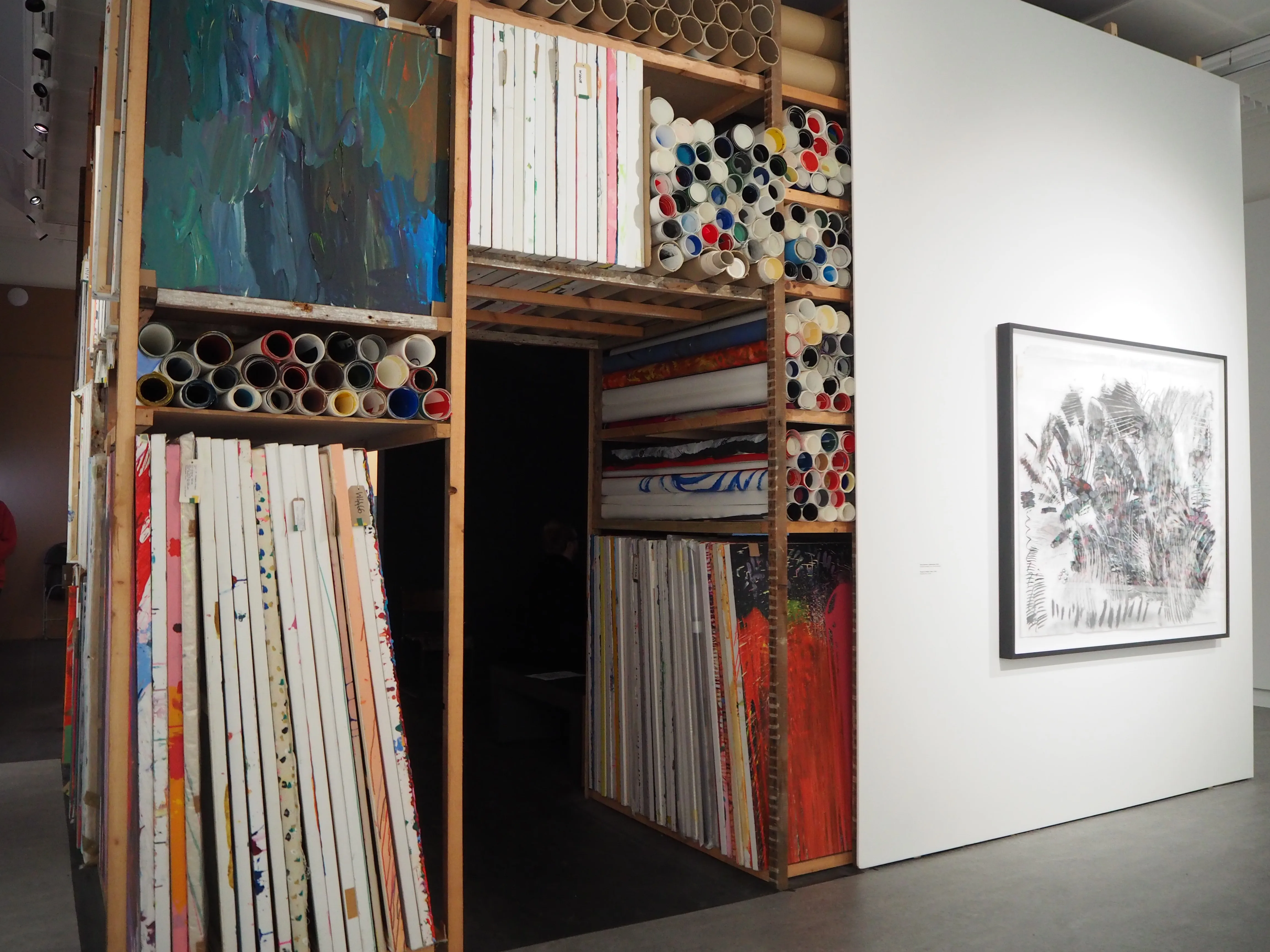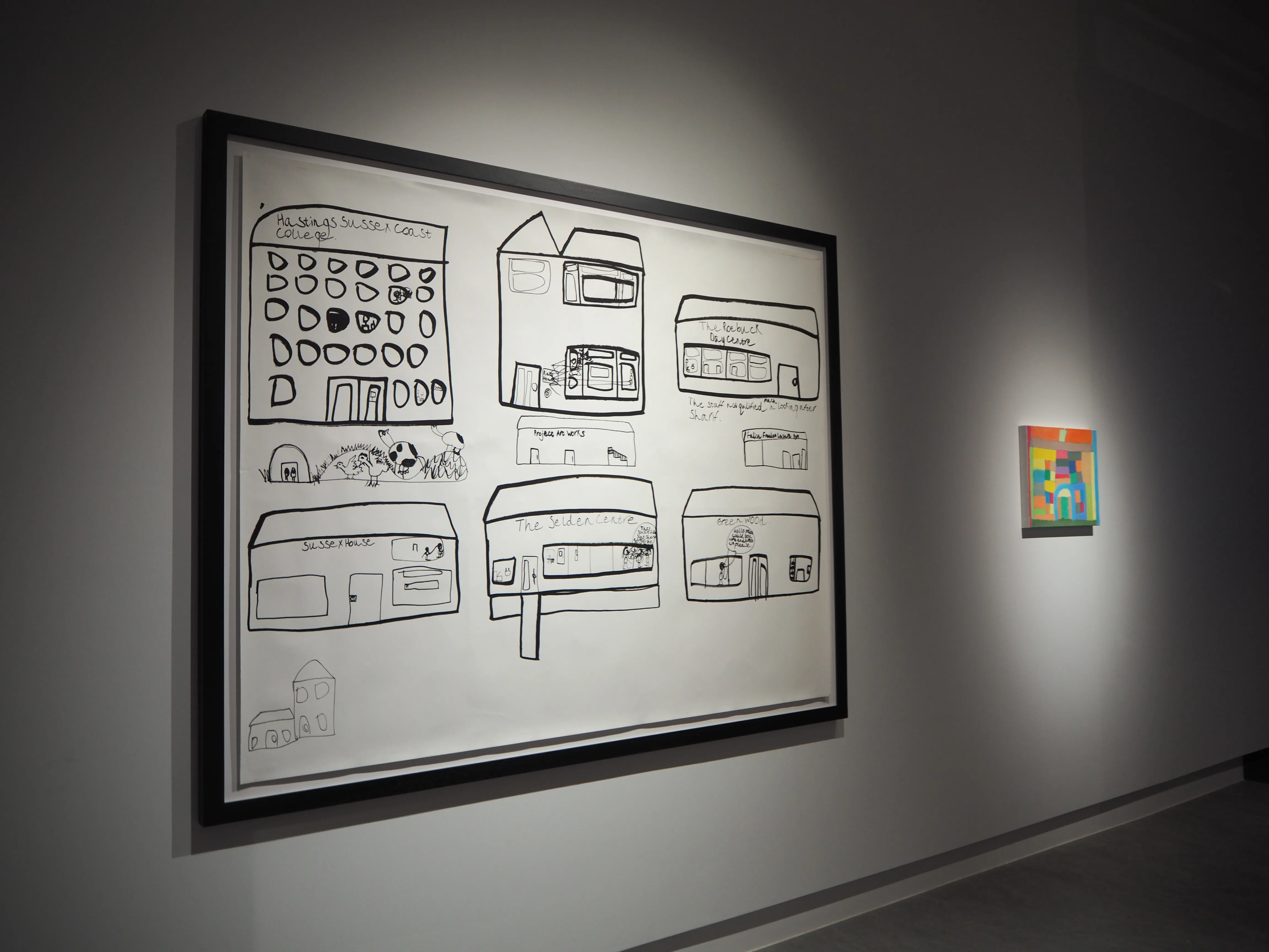 暗幕を抜けた先に見えてくるのは、プロジェクト・アート・ワークスの展示空間。とりわけ、会場中心に設置されたスペースをかたち作る大量のキャンバスや大型の絵画作品が鑑賞者の目を惹く。イギリス南東部のヘイスティングを拠点とするプロジェクト・アート・ワークスは、ニューロダイバーシティ(*1)のアーティストたち、およびアーティストの介助者たちと協働し、4000点を超える作品をこの空間にアーカイブした。展示空間の奥にはアトリエが再現され、実際にアーティストがどのように作品を描いたのかを記録したドキュメンタリーフィルムが上映されている。