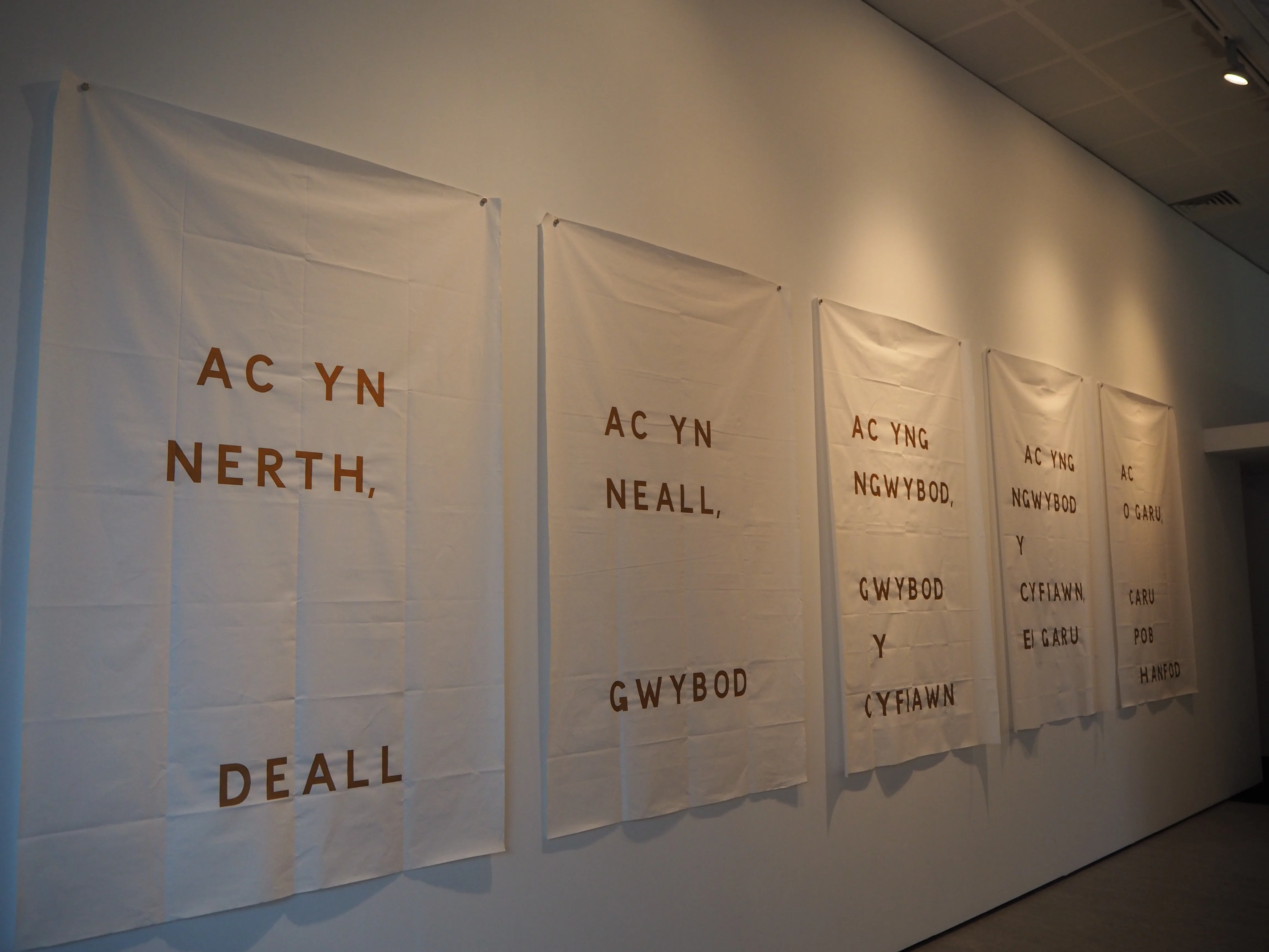 展覧会会場に入るとまず、鑑賞者は6枚のテーブルクロスからなるインスタレーションに出会う。これはジェントル/ラディカルによる作品の一部で、綴られているのは、18世紀に書かれたケルト民族の祈りの言葉だ。カーディフを拠点とする彼らは、アーティストのみならず文筆家やコミュニティワーカー、活動家たちの集団であり、ケアと親愛のネットワークを通じて共同体により豊かで平等な暮らしをもたらすことを目標としている。