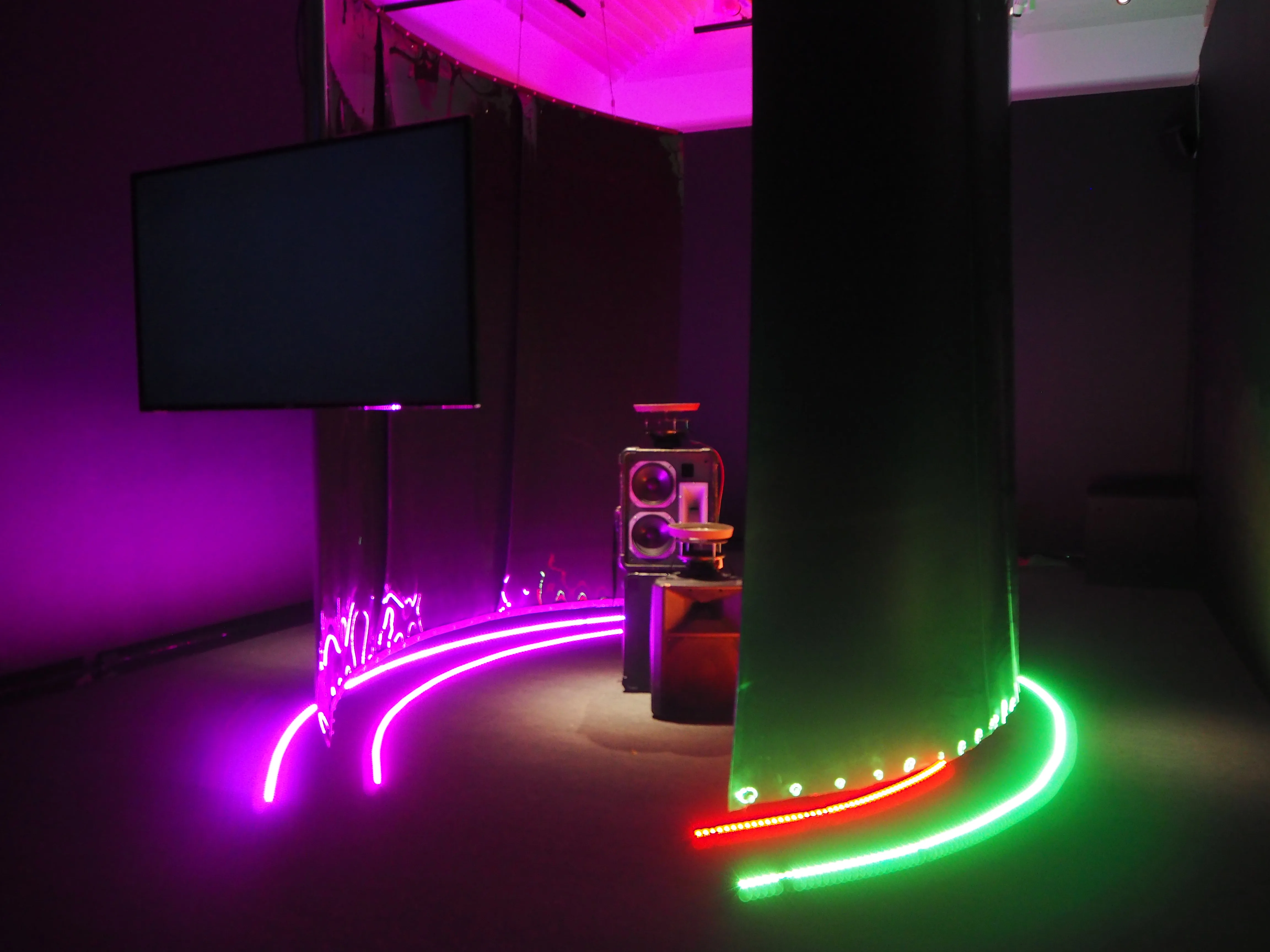 第2の空間には、スタジオスペース横の廊下を通って入場できる。ここに展示されているのは、映像、ライティング、サウンドスコアなどを組み合わせた没入型のインスタレーション《The Only Good System is a Sound System》だ。英国における抑圧と差別の歴史を背景に、周縁化されてきたグループの団結をテーマとしたこの作品は、2021年のリバプール・ビエンナーレにも出品されていた。B.O.S.S.は、部屋の中央に置かれたスピーカーを、人間に集団的な喜びと癒しをもたらす神聖な空間を作り出すための象徴的なアイテムとみなしている。