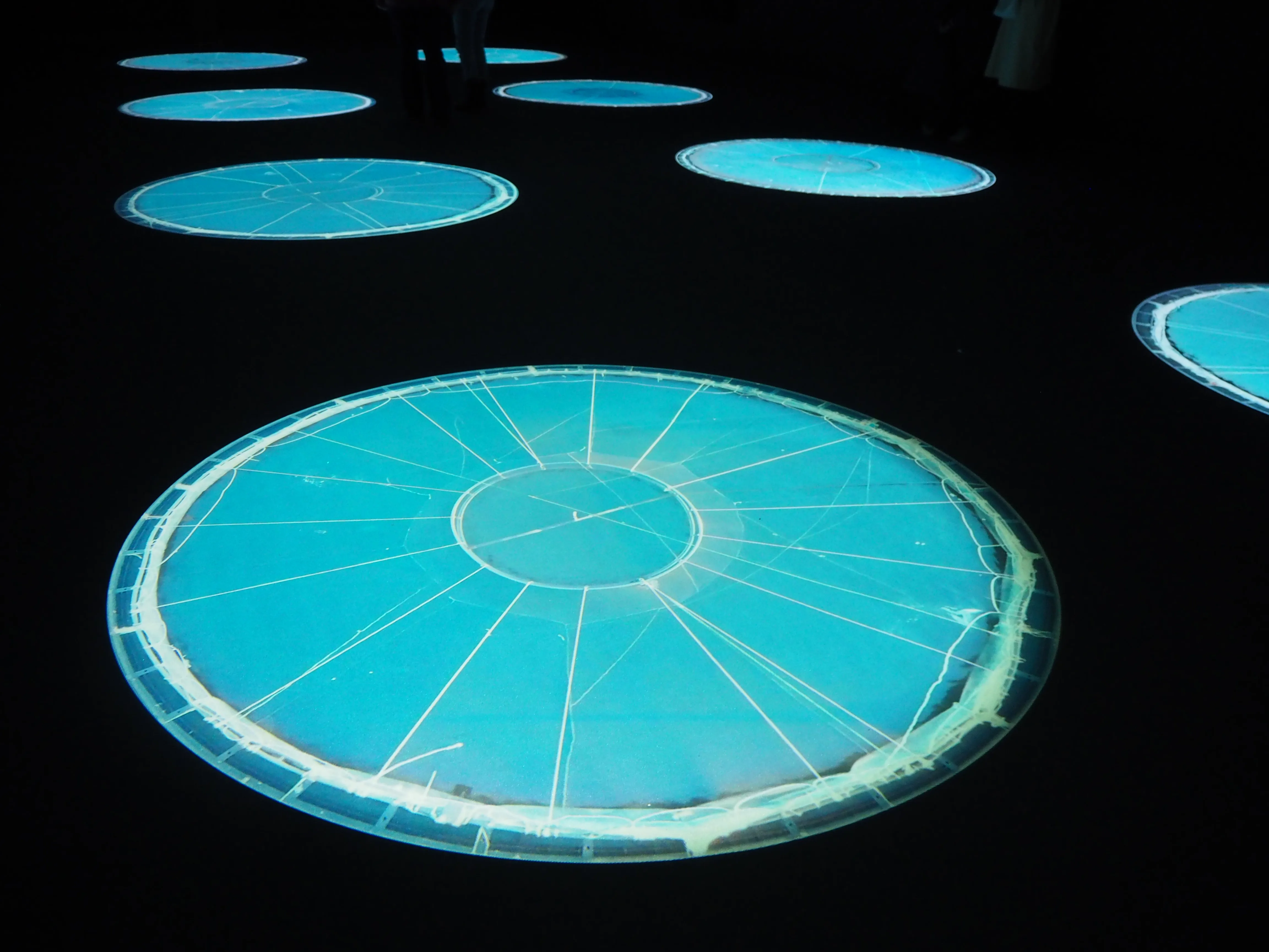 クッキング・セクションズは、展示室床面へのプロジェクションマッピングとオーディオパフォーマンスによって空間を構成した。ロンドンを拠点に活動するアーティスト・デュオである彼らは、「食」の視点から社会への問いを投げかける。床に投影される8つの円は、サーモンの養殖場を空中からとらえたイメージだ。アーティストたちは、養殖サーモンの製造過程に生じる水域汚染を問題視し、安価な食事と引き換えに膨らみ続ける環境コストに警鐘を鳴らす。