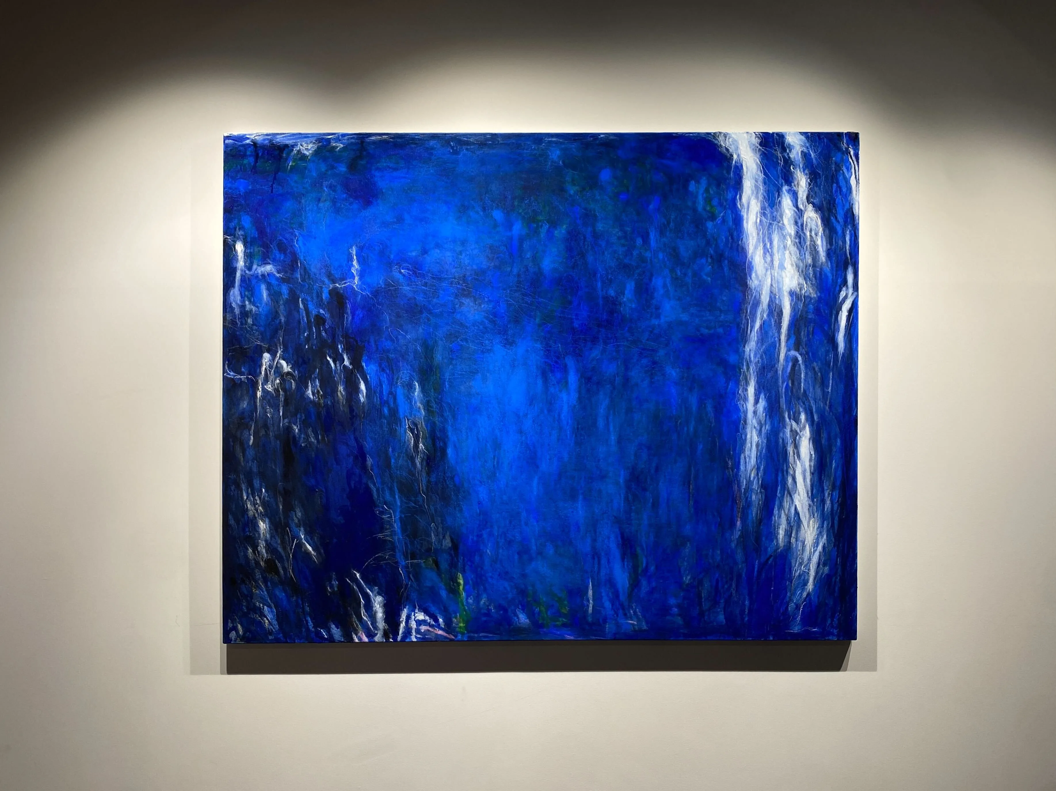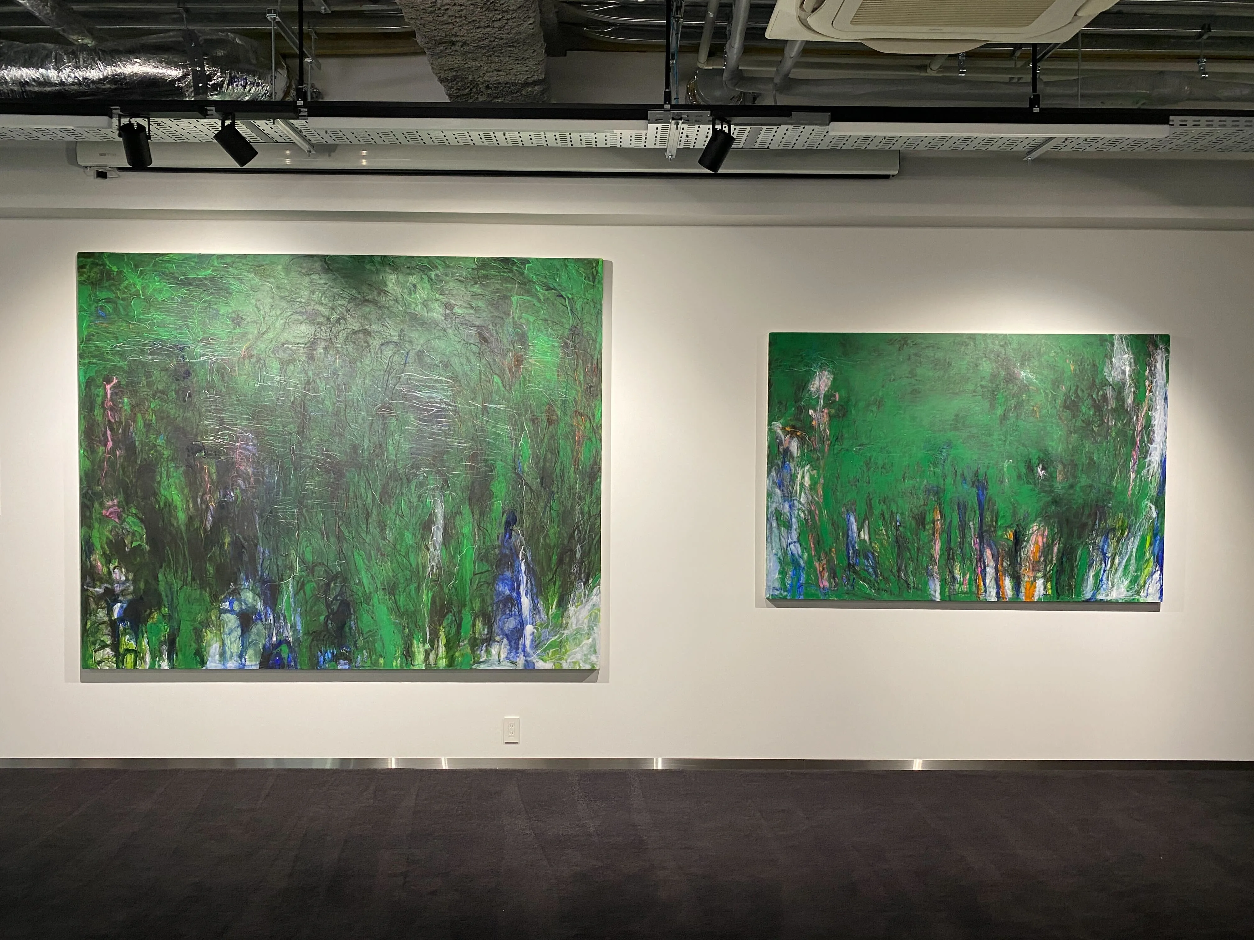 5階では長きにわたって活動を行う日本人アーティスト、松本陽子の絵画をテーマにした展示が行われていた。アメリカの抽象表現主義の作品や山水画などに影響を受けながら、当時は油彩が中心であった日本の抽象表現のなかで、アクリル絵具を用いた表現の可能性を切り開いてきた松本。80歳後半を超える今なお制作を続ける彼女は、1980年~90年代にかけて確立していたピンクを主色調にした抽象画のスタイルから一転して、近年は他の色を用いた抽象絵画も制作している。本展ではピンク、緑、青を主色相として用いた絵画を一挙に鑑賞できる機会となっており、キャリアの長いアーティストが、時代に応じてどのように表現の幅を広げていったかという意味での「同時代性」も感じられるだろう。