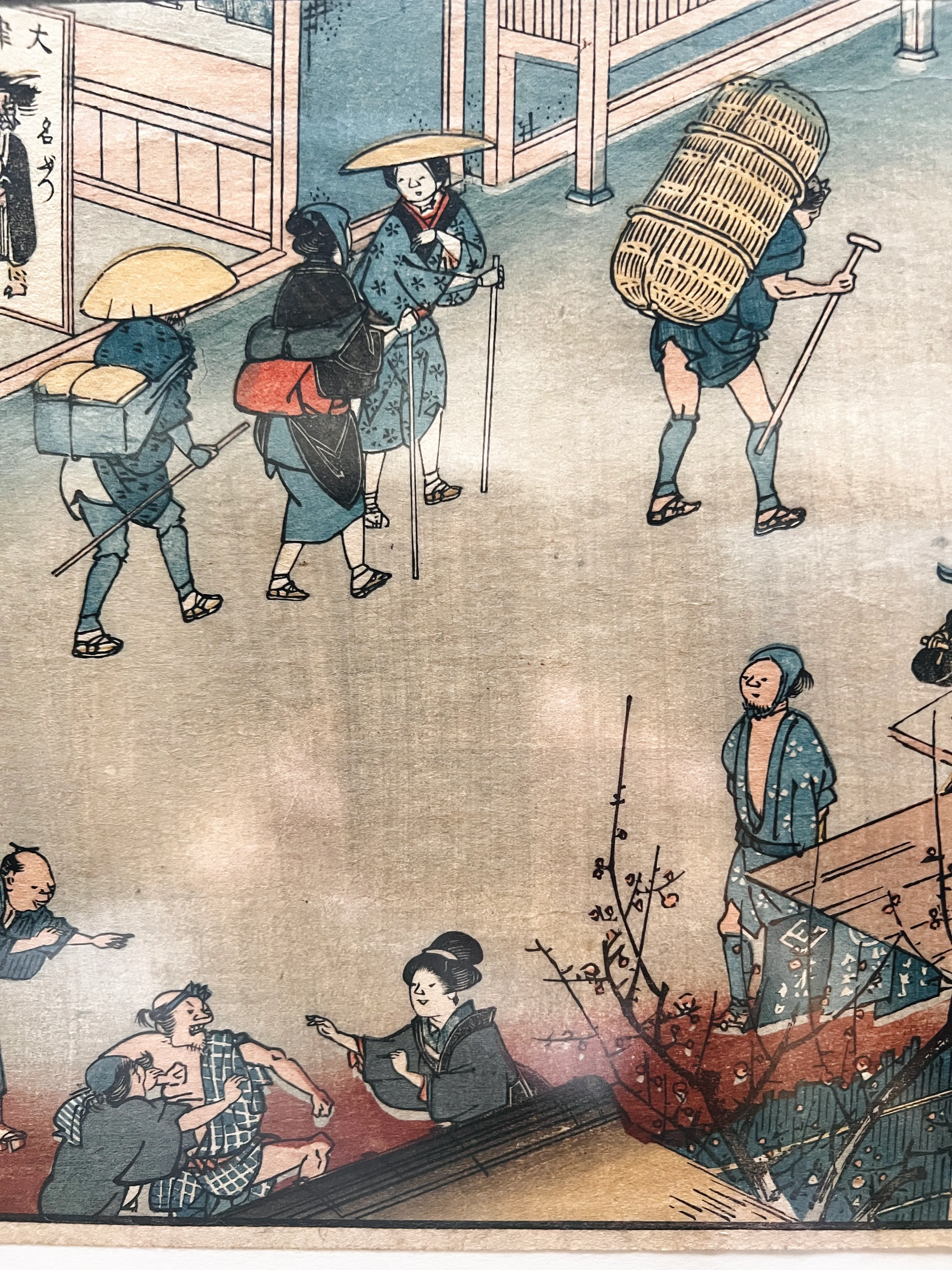 またそうした細部に絵師の個性が現れています。浮世絵というのは、その時代ごとの流行の変化を受けて、画風も変わっていきます。浮世絵師は普通、(美人画の人物など)メインのモチーフに注力しますが、風景画の背景の人物は、そうした流行とは一歩離れて、リラックスして描かれているように見える。そうした描写に、絵師たちの日頃からの観察力や、(技量の)蓄積が現れます」(渡邉)