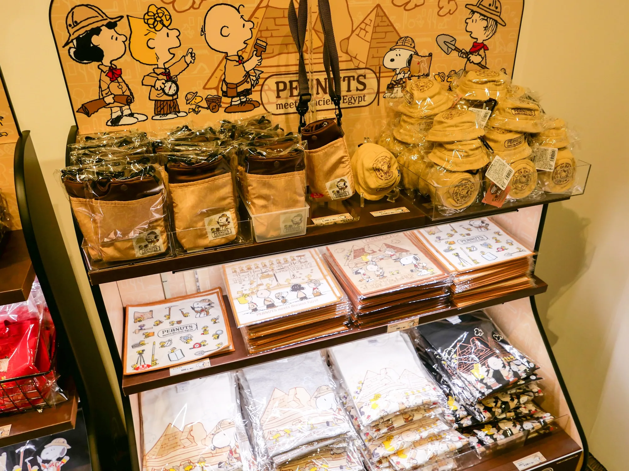 人気キャラクターPEANUTSとのコラボレーションが実現。スヌーピーやウッドストックといった仲間たちがピラミッドの発掘調査隊に扮したデザインで、ぬいぐるみやキャンディ缶、マグカップ、トートバッグなど多彩なアイテムが揃う。