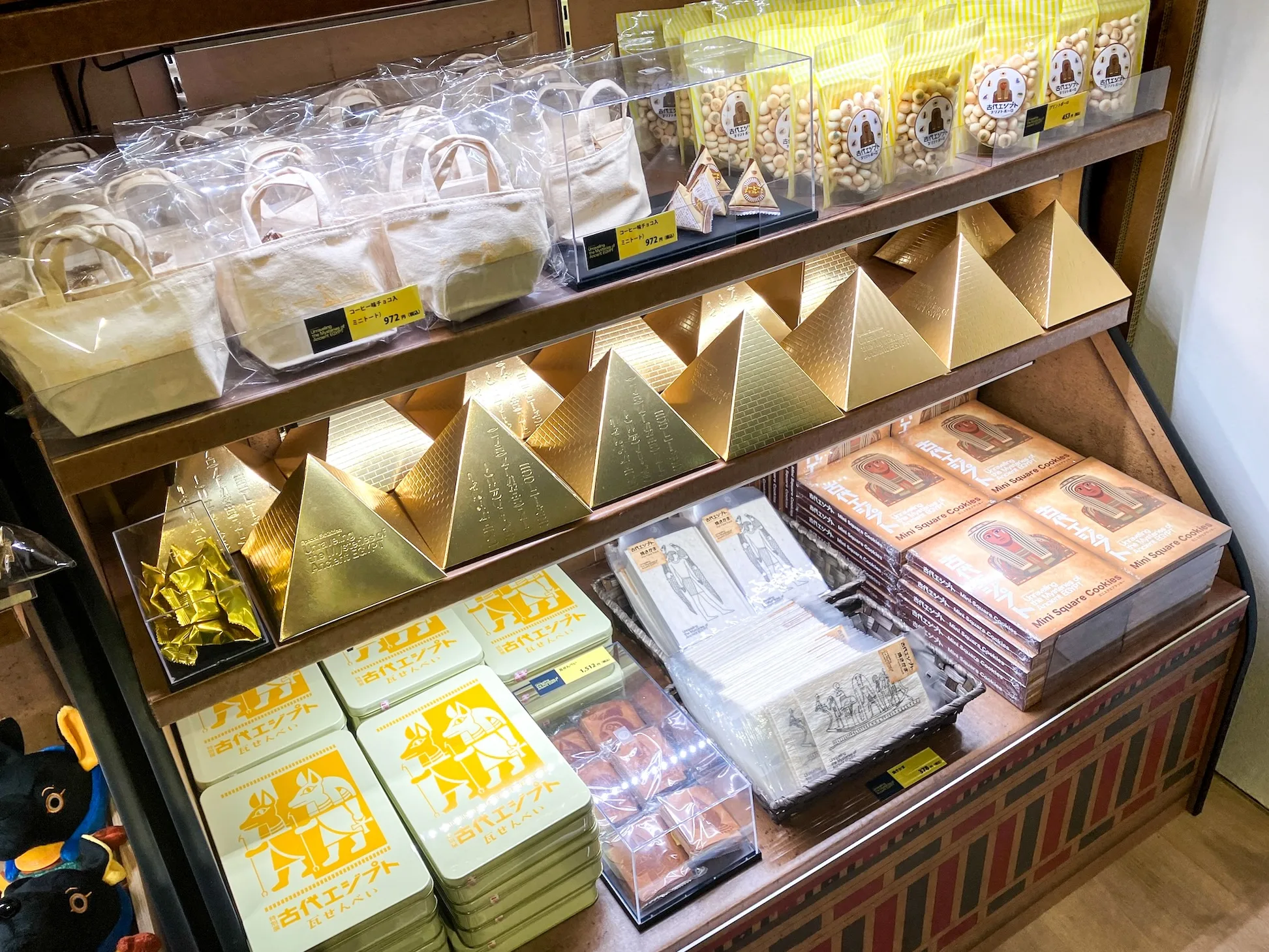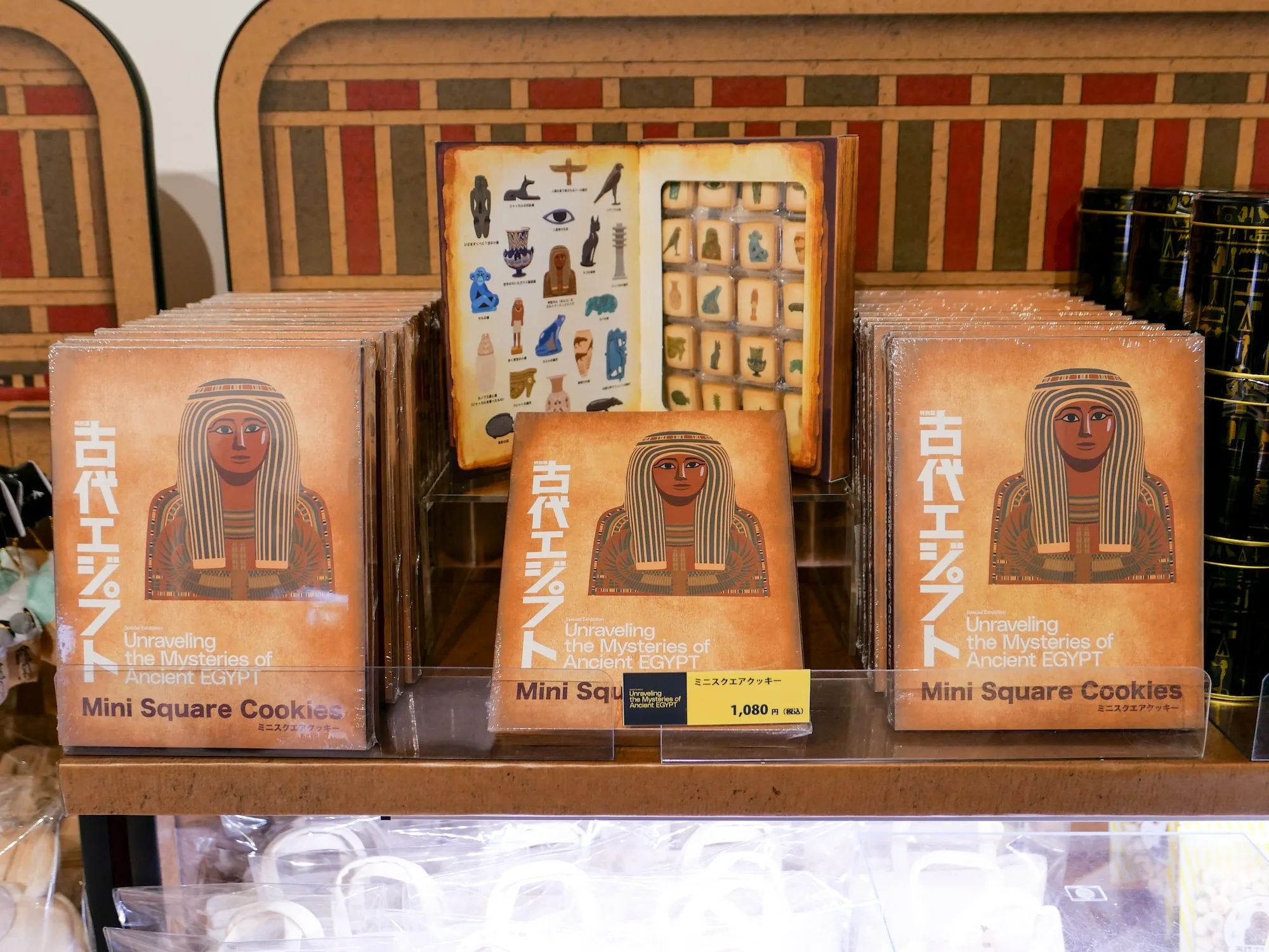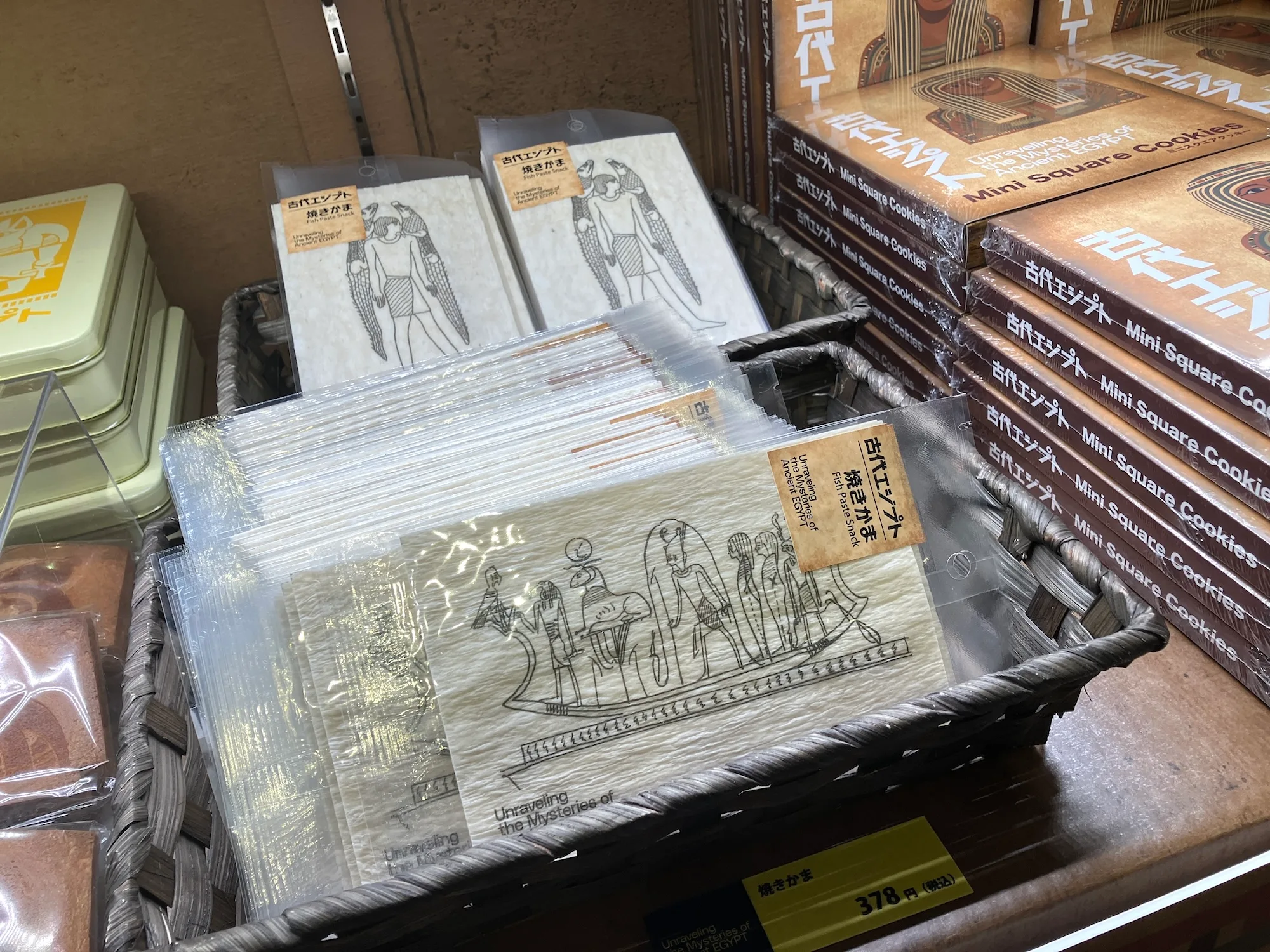 本展ならではの様々なグルメ商品がラインナップ。壁画のような瓦せんべいは1512円(税込)。ブック型のパッケージに入ったミニスクエアクッキーは1080円(税込)。なかにはパピルスのような焼きかま(税込378円)というユニークな商品も。
