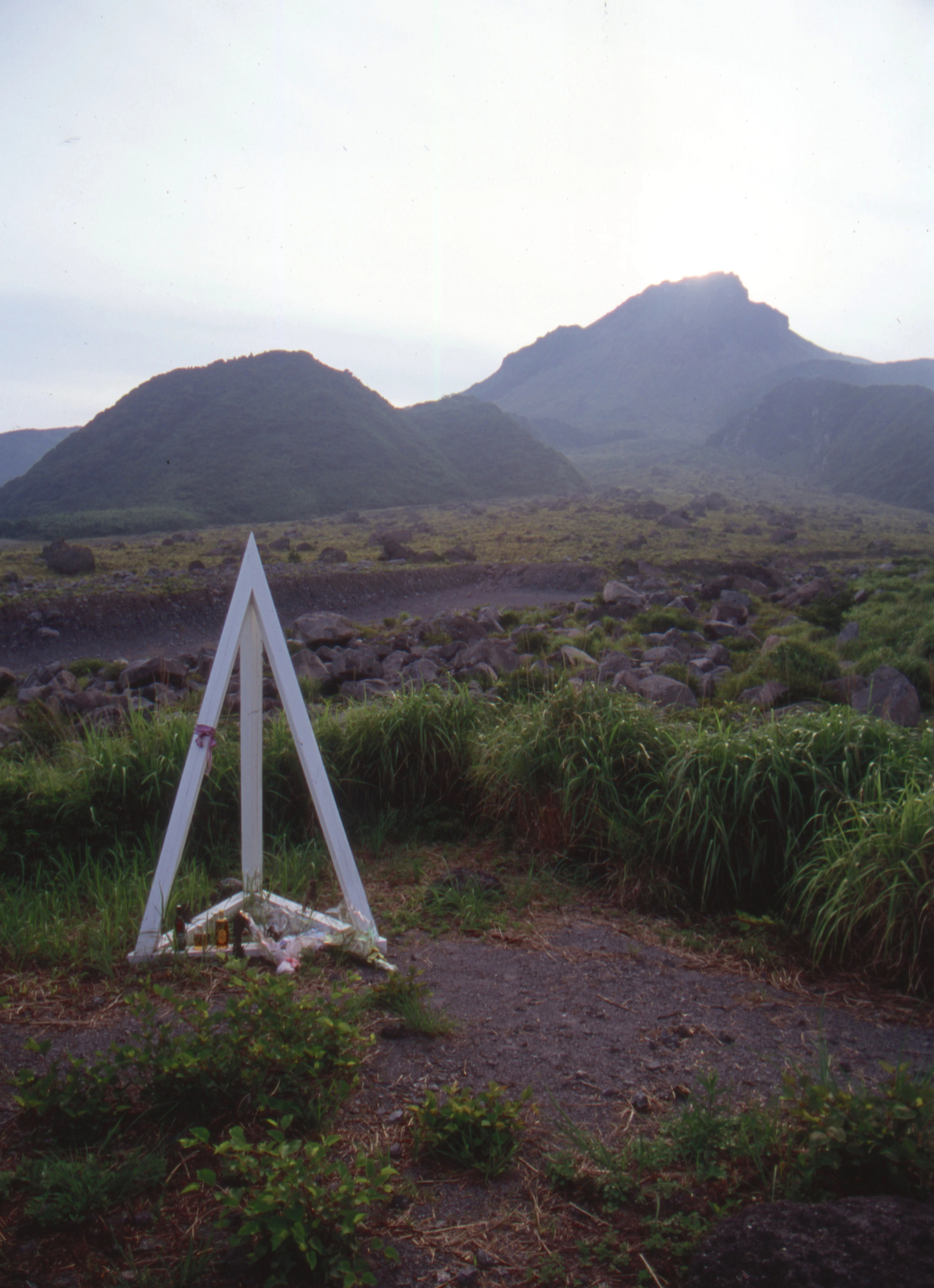 当時、取材陣がより良い条件で撮ろうとカメラを立てた場所は「定点」と呼ばれた。6月3日の大火砕流はその「定点」を飲み込んだ。その場所に慰霊碑として素朴な三角すいをつくったのは、市職員として災害対応し、現在語り部でもある松下英爾である。白く塗装したヒノキの角材を、天に向かって手を合わせるように組んだシンプルな形。椹木は語る。