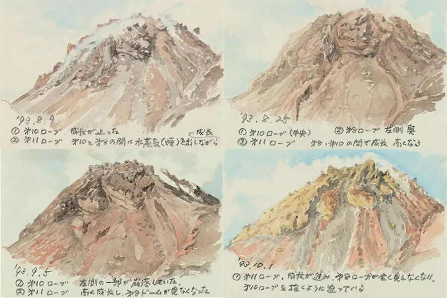 いっぽう、1937年長崎県平戸生まれ、地理を教える高校教師であった満行豊人は、好奇心と使命感から、噴火による日々の山の変化を撮影・記録していった。その定点観測地約7ヶ所の写真と、退職後に語り部をする傍ら、96年の終息から15年を経て写真をもとに描き直した水彩画が展示されている。絵を描くことは好きだったそうだが、専門的に学んだことはない。椹木は出展を依頼した理由をこう語る。