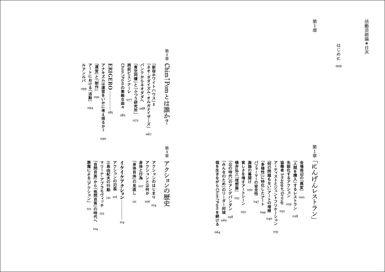 「本書は芸術書である」(p.1)という宣言で幕を開ける『活動芸術論』は、しかし、「芸術書」という括り方ではとうてい収まりきらないほど、多岐にわたるトピックやテーマを含む。本書は、「はじめに」「年表」「参考文献」「謝辞」「索引」を除き、全14章から構成される。読者の数だけ読み方を許容する開かれた書物だが、この書評では、それらを3つのグループに分け、それぞれの価値や可能性を、文化研究・美術史の視座から考察したい。