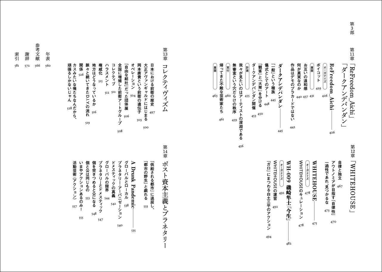次のグループは、第3章、第7章、第13章の3つの章から成立する。これらの章を味読することで、読者は、Chim↑Pomが、そして卯城が、自らの活動や実践を、どのような文脈に位置づけているか、言い換えれば、彼・彼女たち自身のセルフ・アイデンティフィケーションを知ることができる。たとえば、第3章「アクションの歴史」では、日本やアメリカの戦後前衛芸術の流れをさらいながら、身体や肉体を媒体とする行為の可能性、さらには、「Qアノン」や「9・11」の例を引きながら、その裏面として、「アクションすること」の両義性が論じられる。Chim↑Pomは、つねに、その諸刃の剣の「可能性」の側に賭け続けてきた集団である。第7章「芸術実行犯」では、Chim↑Pomもそのカテゴリーのなかに(ときに乱雑な仕方で)放りこまれる傾向のある、「アート・アクティビズム」の先駆者や同時代者への言及がある。そして、Chim↑Pomのアクションが、「法」や「公共」といった概念を、どのように再構成しようとしてきたかが具体例を伴って紹介される。あるいは、第13章「コレクティヴィズム」。この章には、「特に何か一致した趣味があって結成された訳ではない」(p.7)、(メンバーの岡田の言葉を借りれば)「カスみたいな俺たち」(p.528)が、バラバラな個のままでいることを許されながら、それでもなお、いびつな輪郭のまとまりとして力を発揮してきた、その「秘訣」が語られていると評者は解する。