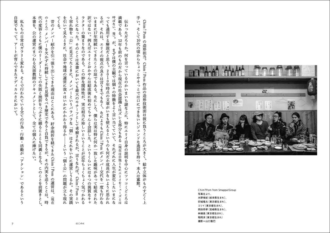 最初のグループは、第1章、第2章、第4章、第5章、第6章、第8章、第9章、第10章、第11章、第12章の計10章を包含する、最大のグループである。これらの各章では、必ずしも時系列順ではないが、Chim↑Pomの結成から現在まで、メンバー6名が実現してきた作品やプロジェクトが、ときにリアリズム絵画のごとく詳細に、ときに表現主義の抽象画のような勢いある筆致で叙述される。それらの叙述は、あくまで卯城の視点ではあるが、他メンバーとの衝突や折衝の過程も記され、資料的価値も担保されている。物議をかもすChim↑Pomの芸術実践は、その論争的性格ゆえ、誤解を招く表現や端的な事実誤認、あるいは感情的要因に基づく「尾ひれ」とセットで拡散されることも多い。評者は、Chim↑Pom(卯城)の活動に敬意を抱いているが、当然ながら、その「盲目的信奉者」ではないし、いつも批評的まなざしを彼・彼女たちの実践に向けていたいと考えている。真の意味でChim↑Pomの「批判者」たりえるには、その作品やプロジェクトに関して、不正確な情報に基づく臆見を排し、そのうえで「忖度」なしの批判的記述をめざすことが不可欠である。その意味で、『活動芸術論』は、Chim↑Pomについて(現在、あるいは将来的に)思考し、論述する、すべての研究者や批評家にとって必携の一次資料となる。