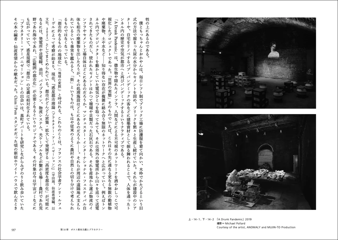 最後のグループに話を移そう。といっても、このグループに含まれるのは、ただ1つの章(第14章「ポスト資本主義とプラネタリー」)のみである。この章には、Chim↑Pomの「これから」が予示的に語られている。気候変動や疫病の定期的蔓延などを包摂するグローバルな「エコロジー危機」、「フェイク・ニュース」の跋扈(先述した「Qアノン」は、その直接的結果である)などに代表される情報をめぐるエコノミーのドラスティックな変化……。『活動芸術論』のトリを飾る本章では、こうした激動の時期にあたる現在(歴史を振り返れば、人類はいつも「激動の時期」の渦中にいた気もするが、それは措く)、その不確定性や予測不可能性を十分に認識しつつも、Chim↑Pomが、そして卯城が思い描く未来のビジョンを垣間見ることができる。