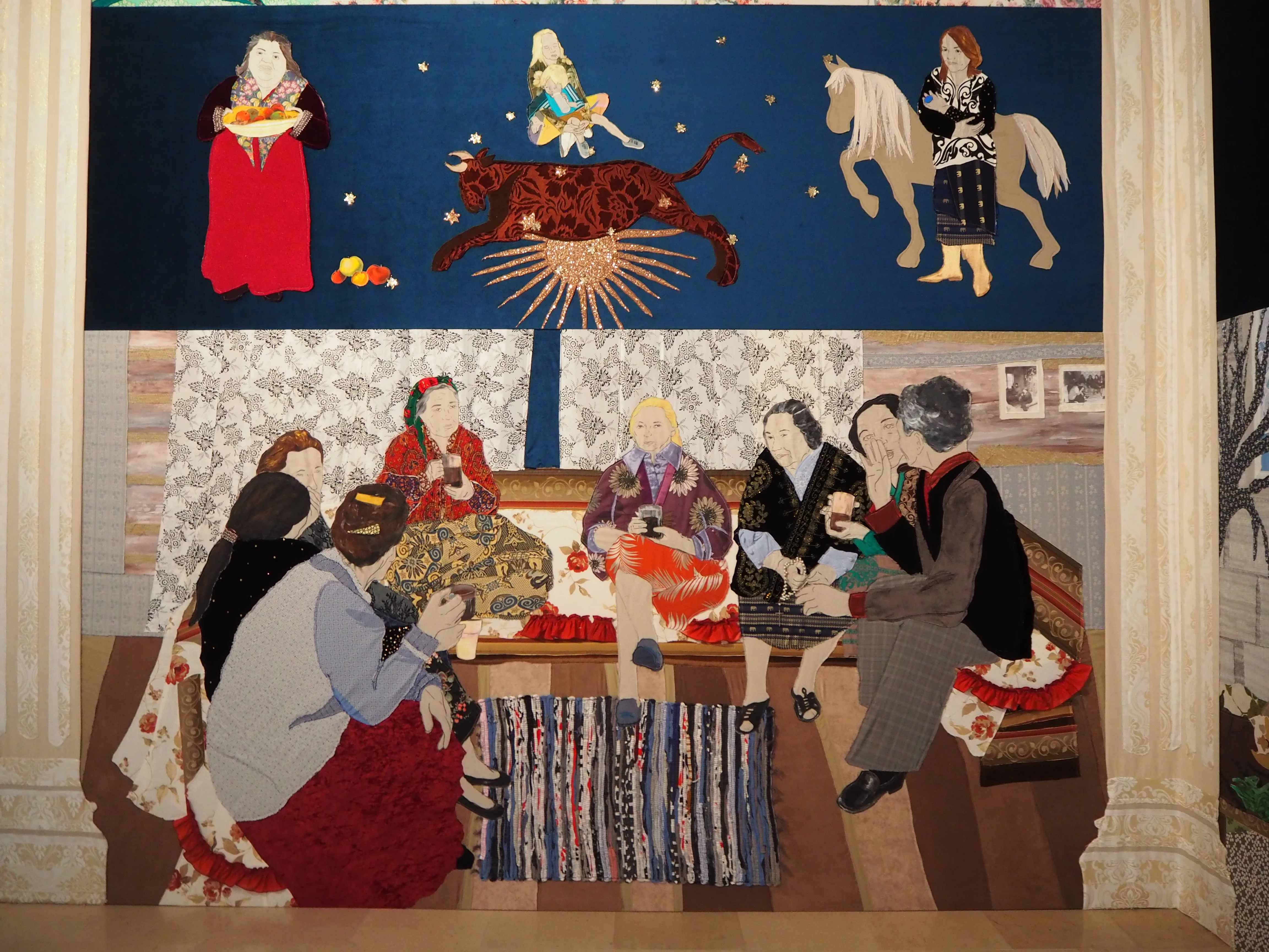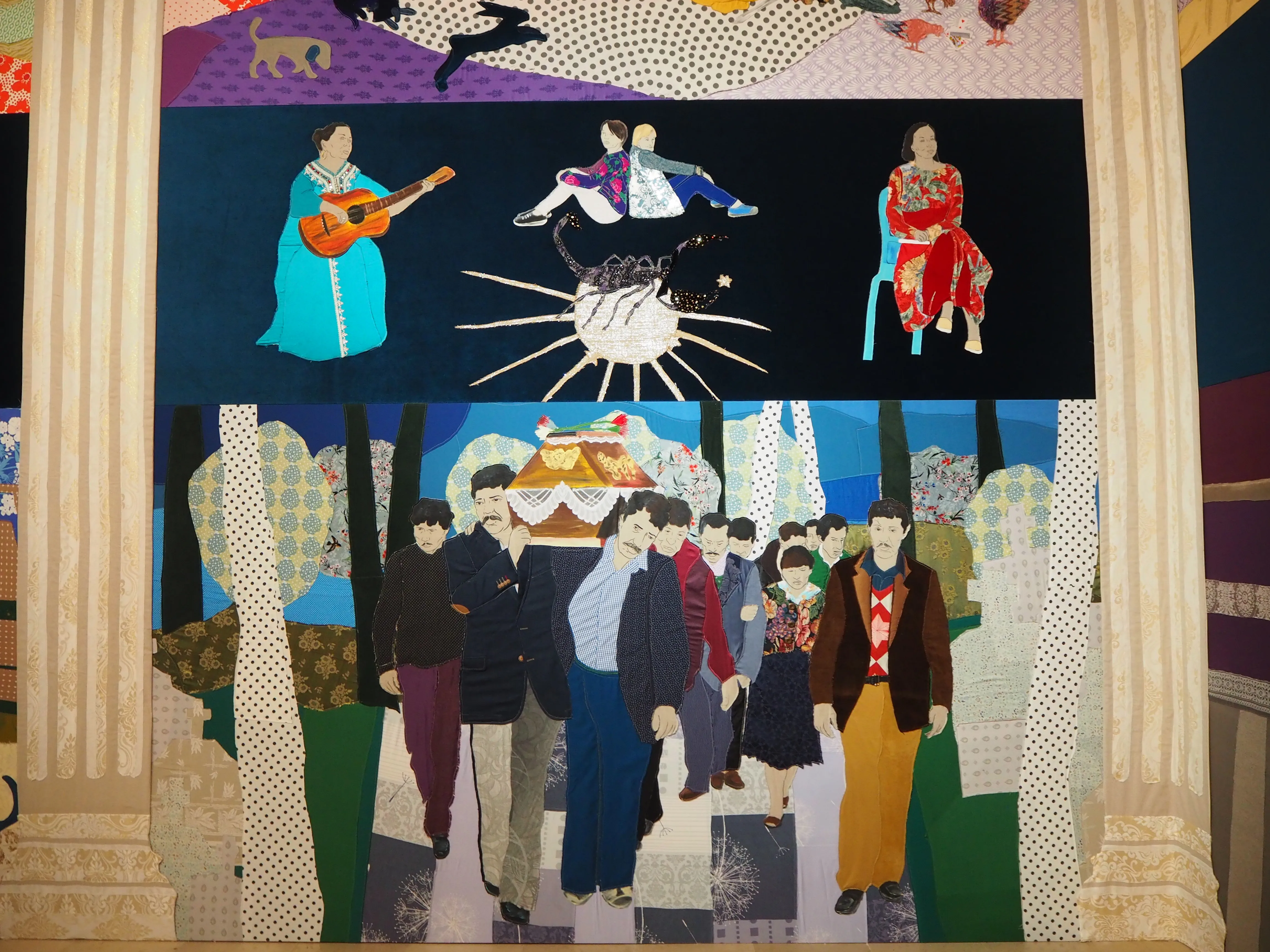 *2──パッチワークという表現方法には、男性中心的な美術史へのアンチテーゼという意味も込められているだろう。歴史的に、絵画と彫刻は芸術分野のなかでも上位に位置するとされ、それらの作り手は男性の「巨匠」に占められてきた。対して、刺繍やパッチワークといった手仕事は下位の芸術とされ、名もなき女性たちが担ってきた。いかにも「ヨーロッパ的」なフレスコ画が色とりどりのパッチワークによって換骨奪胎されることで、私たちは自らが内面化してきた「美術史」の誤解と偏見を認識することとなる。