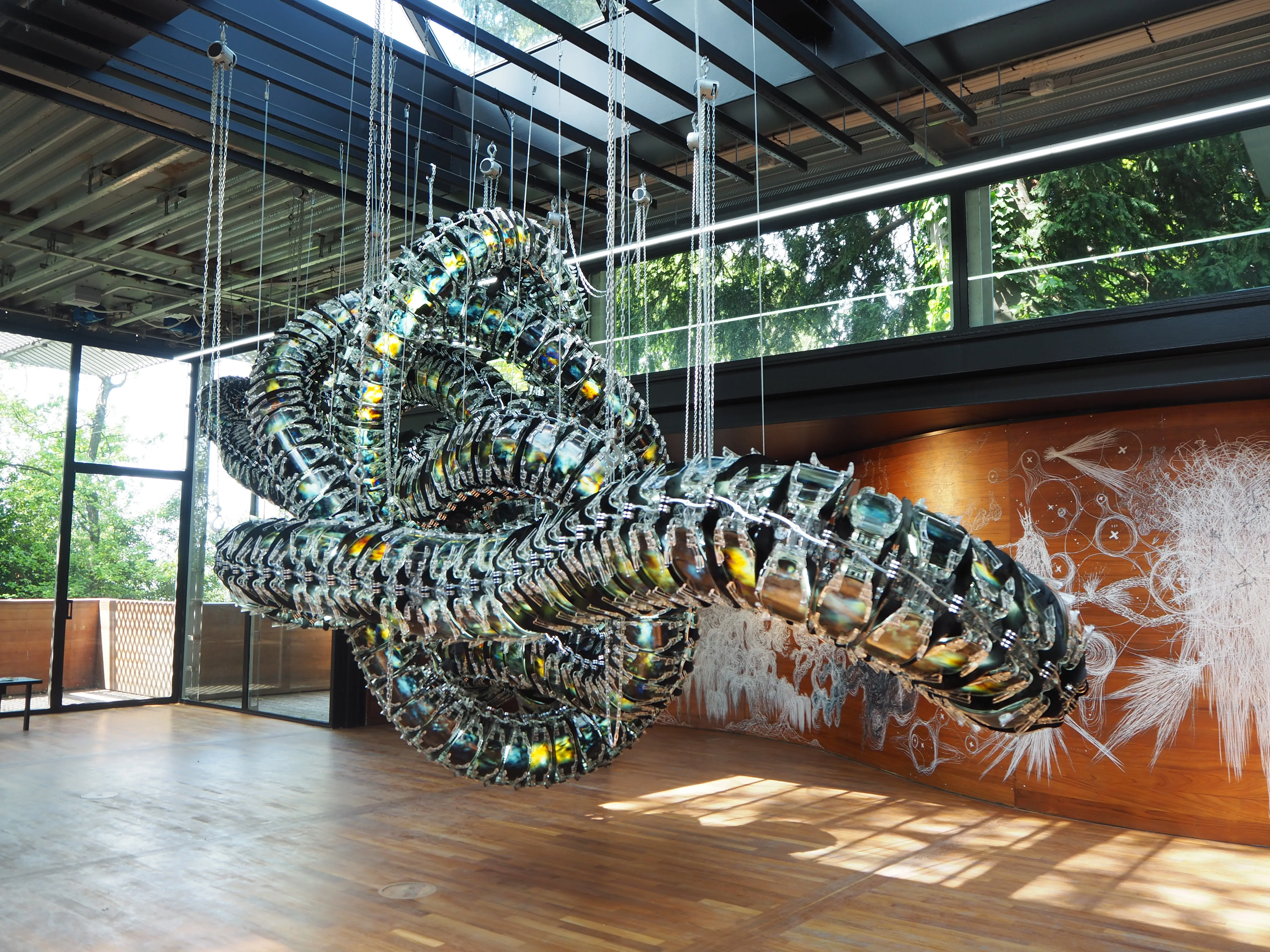 今回展示された5つのキネティック彫刻は、自然と機械、有機物と無機物の境界線を曖昧にする。なかでも会場中央に設置された《Chroma V》は、明るさと色の変化がアルゴリズムによって生成される巨大なコイルで作られており、その表面はまるで呼吸しているかのように膨らみ、血が通っているかのように脈打つ。5mにも及ぶこの生き物/機械は、私たちにある種の畏敬の念すら抱かせる存在である。