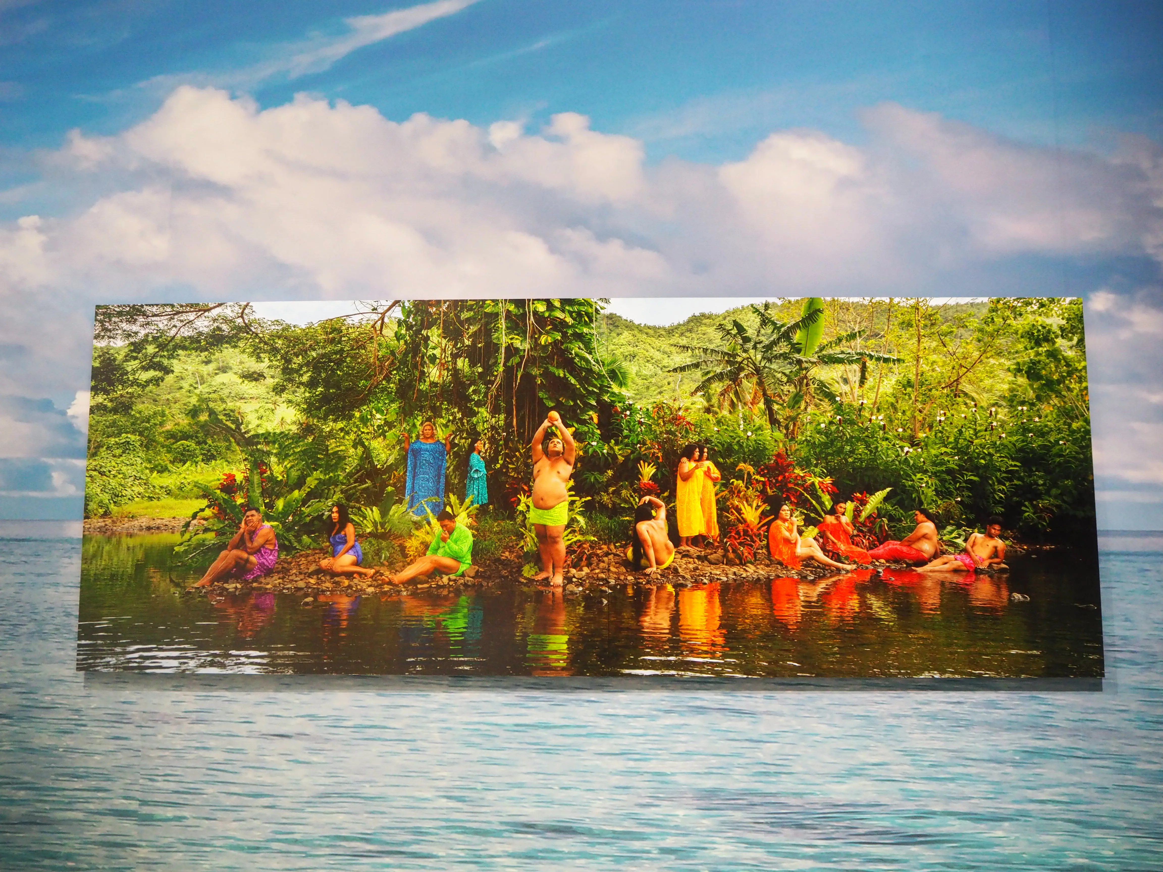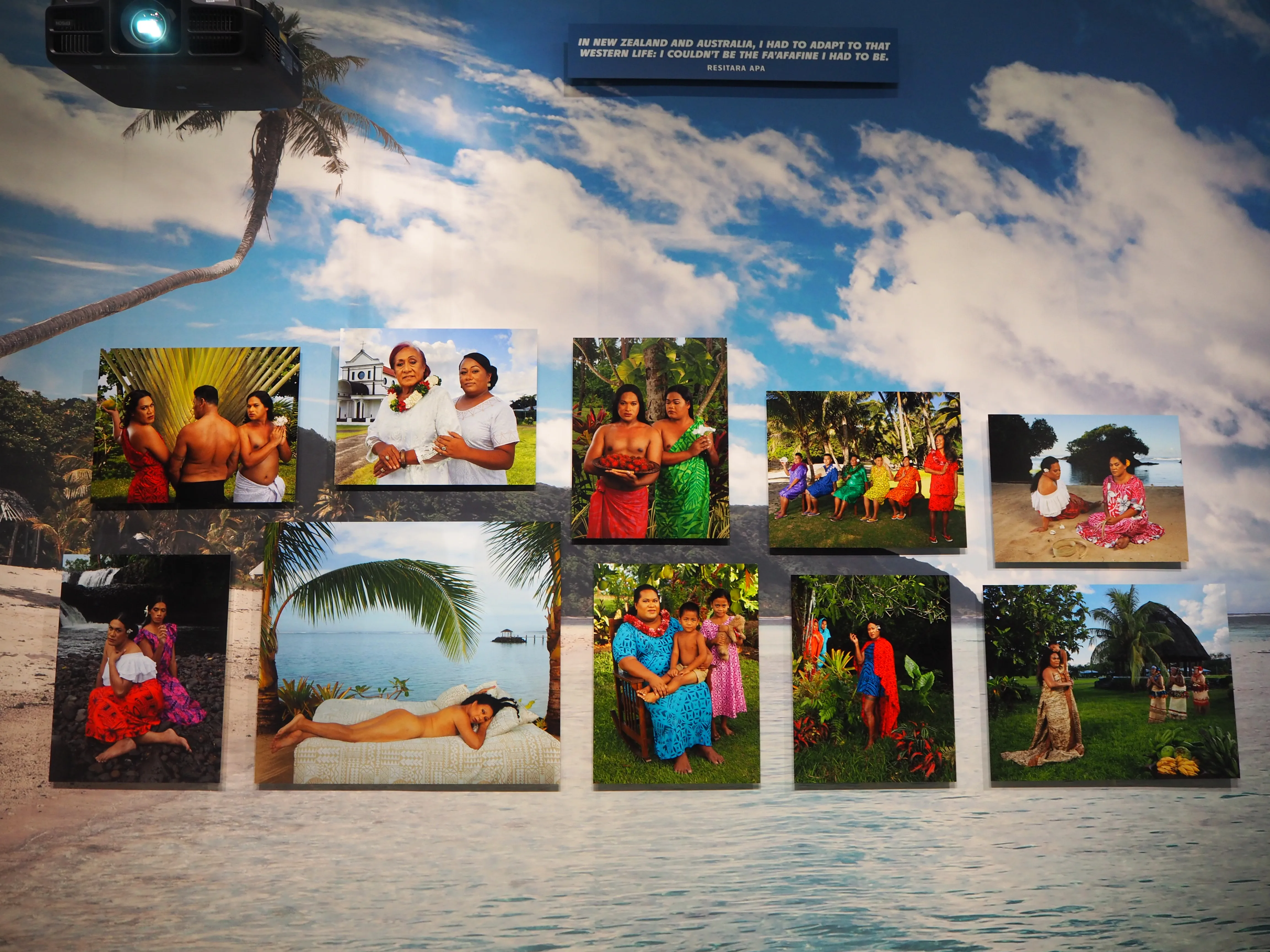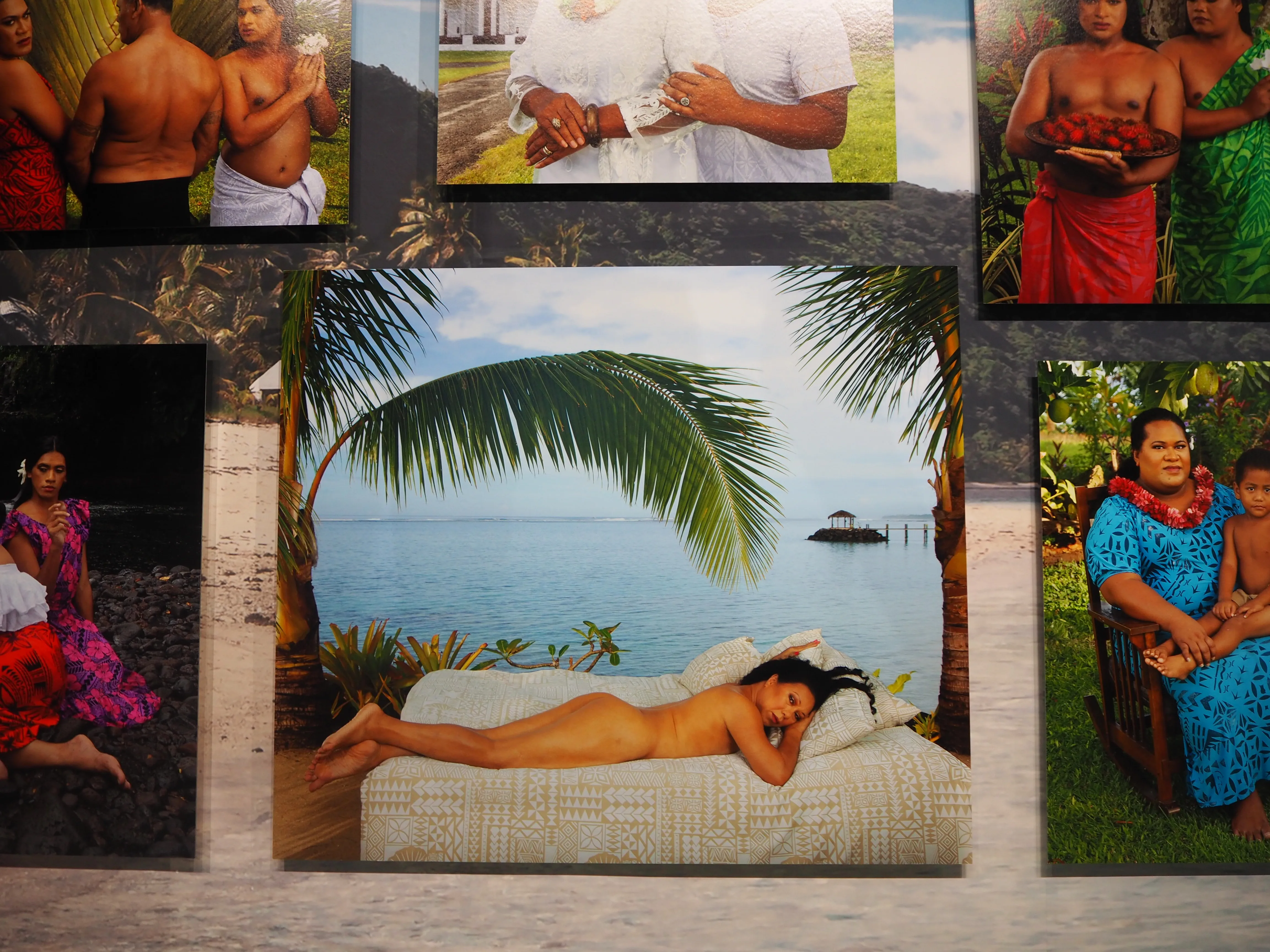 いっぽうで、反対側の壁にはポール・ゴーギャンの有名な絵画を批判的に再解釈したシリーズが並ぶ。写真のモデルをつとめるのは、「Fa'afafine」のコミュニティの仲間たち。スクリーンに上映された映像作品のなかでは、ゴーギャンのような西洋美術史の「巨匠」が、太平洋諸島先住民の身体をエキゾチックなものとして客体化してきたことが、ユーモアを交えながら指摘される。展示の雰囲気は明るく軽妙だが、これは「南国らしい」雰囲気で鑑賞者を喜ばせるためというよりむしろ、欧米メディアによって作り出された太平洋諸島に対する単一的なイメージを揶揄しているかのようだ。