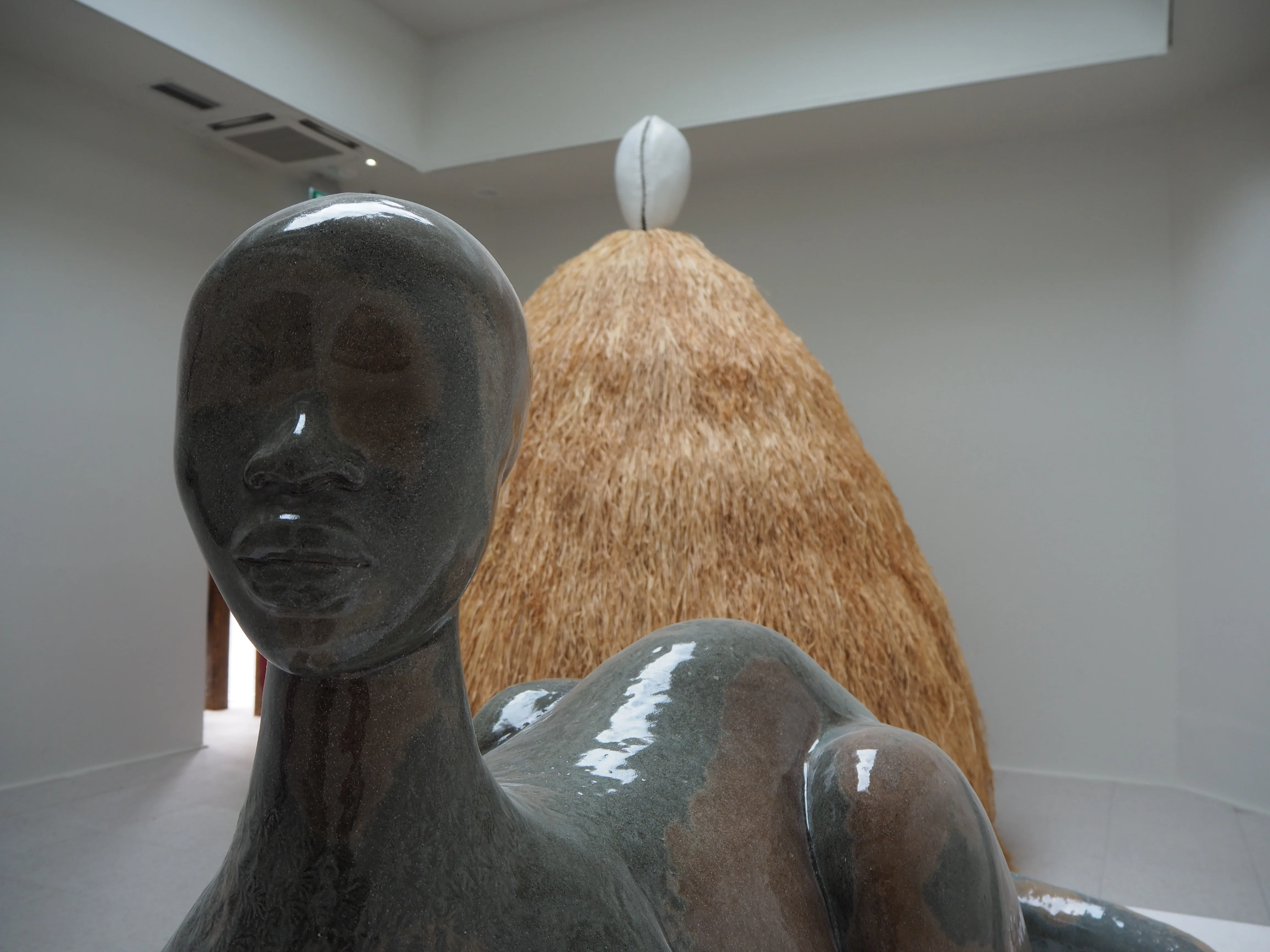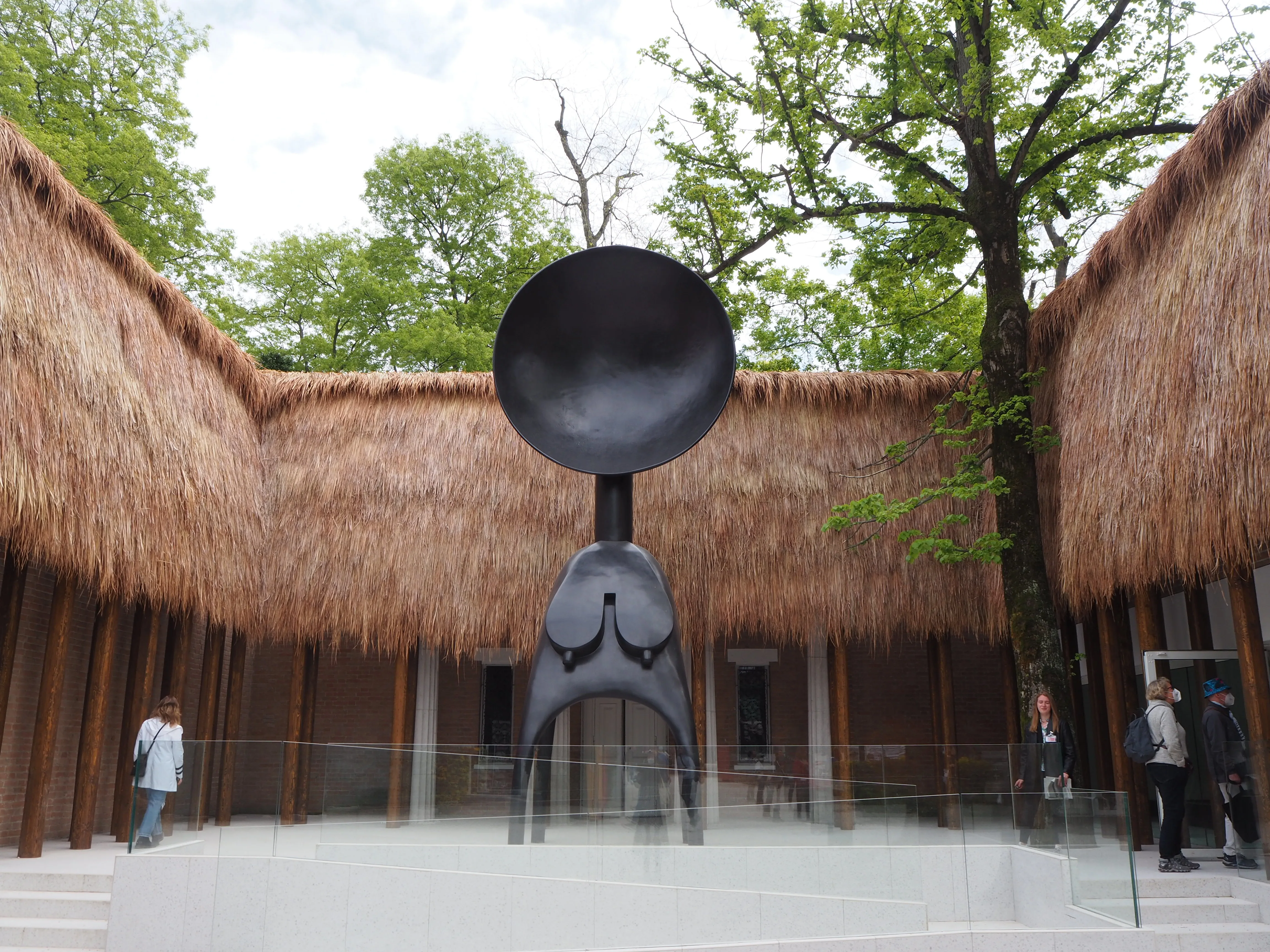 ビエンナーレの企画展「The Milk of Dreams」(レポートはこちら)で金獅子賞を受賞したシモン・リーは、アメリカ館初の黒人女性として同国の代表アーティストに選出されてもいた。ビエンナーレのアメリカ代表にとって、このパビリオンそのものがすでに大きな課題である──なぜなら、この建物は第3代アメリカ大統領トーマス・ジェファーソンが奴隷プランテーションを築いた新古典様式の邸宅、モンティチェロにそっくりの建築だからだ(*1) 。リーは、パビリオンの正面を1930年代の西アフリカの家を思わせる木製の柱と茅で覆い、中央に巨大な女性像を配置することで、その外観をがらりと変えた。