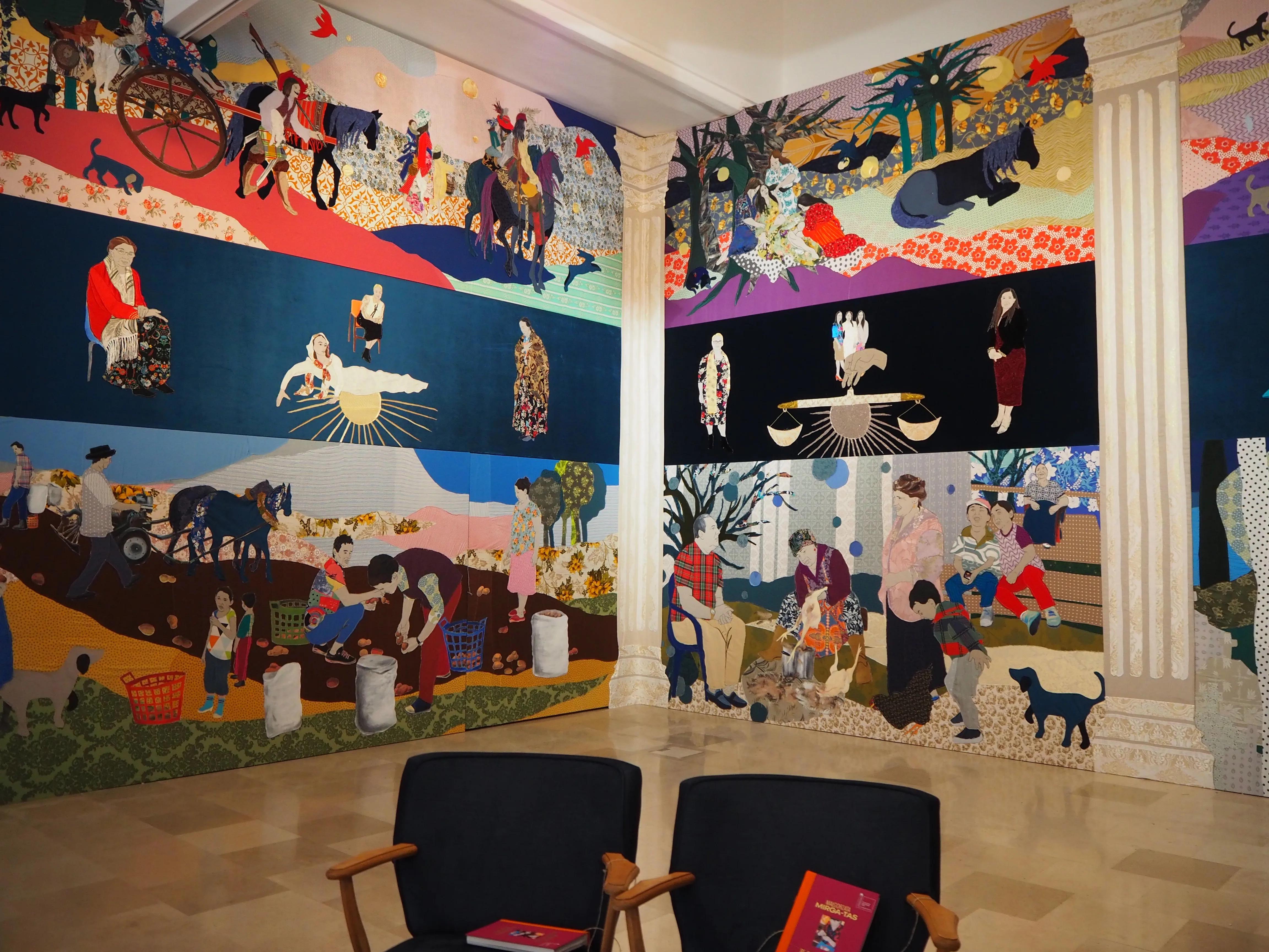 今回のヴェネチア・ビエンナーレに繰り返し登場したテーマのひとつに「ロマ」がある。日本では馴染みが薄いかもしれないが、ヨーロッパで最大の少数民族だ。ロマはジプシーとも呼ばれる移動型民族であるが、古くからいわれなき差別の対象となり、しばしば非人道的な迫害の対象ともなってきた。ミルガ=タスは、ロマにルーツを持つアーティストとして初めてビエンナーレの国家代表として選出された。彼女は、フェラーラのスキファノイア宮のフレスコ画を再解釈し、ロマの人々の生活を描いた12枚のテキスタイルで空間を埋め尽くす。これは、大文字の「美術史」からこぼれ落ちてきた少数民族の文化を、彼女自身の手で取り返す試みでもある(*2) 。