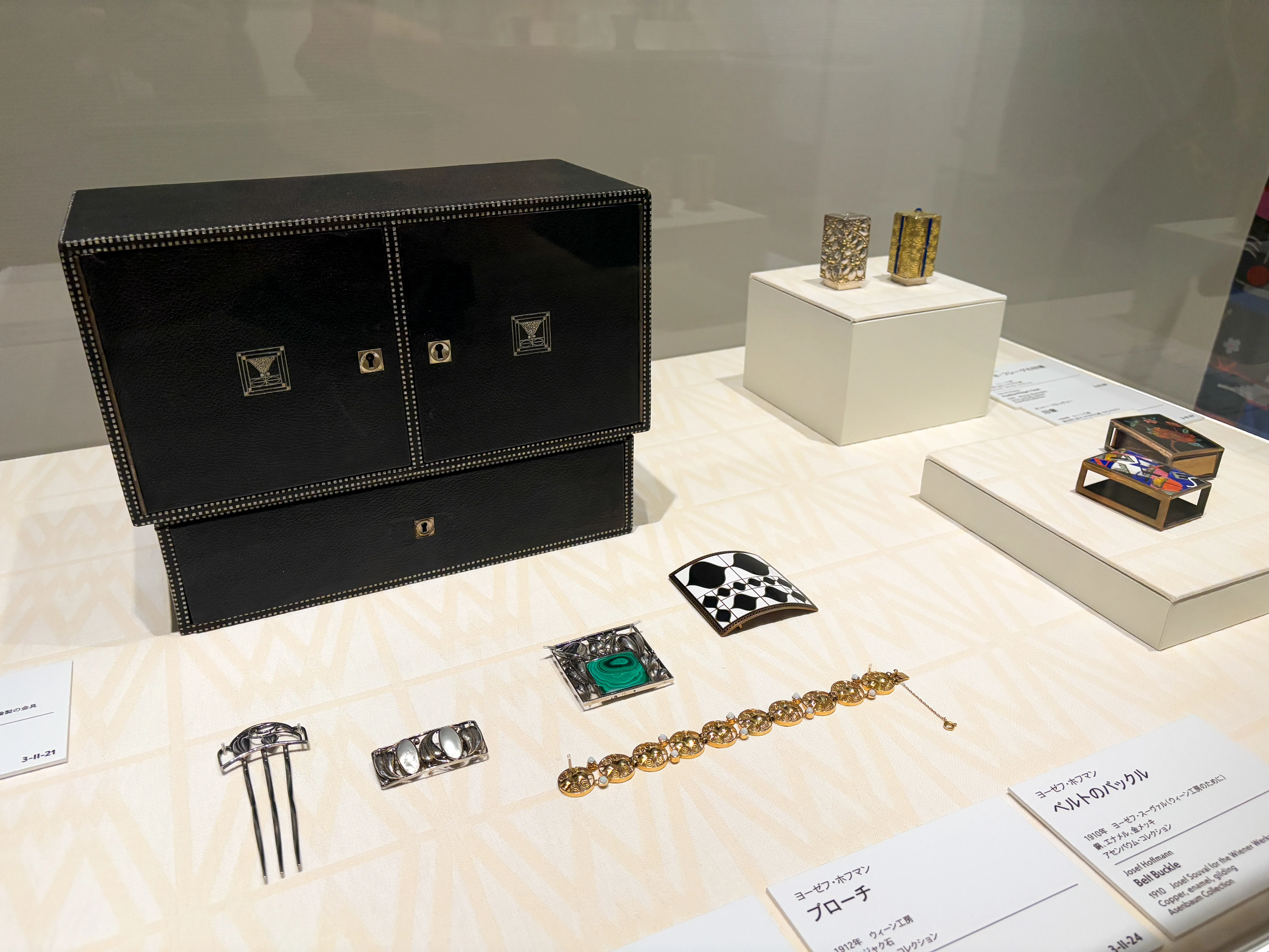 また、ウィーン工房は建築や家具のみならず、ドレスやジュエリーなどの作品も手がけていた。最初は、手頃な価格で売買できるという理由から制作されていた服飾用品だが、戦争による人手不足をひとつの契機に女性の職人が工房での地位を高めると、その重要性はますます高まっていった。