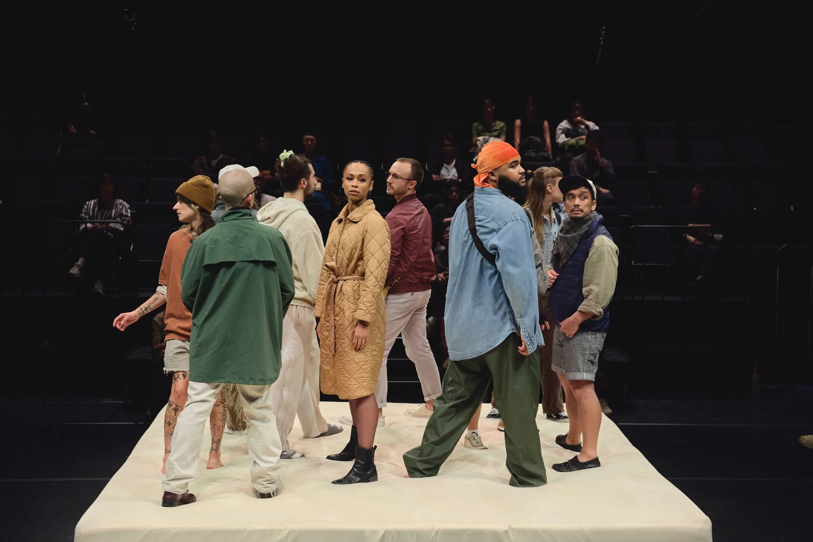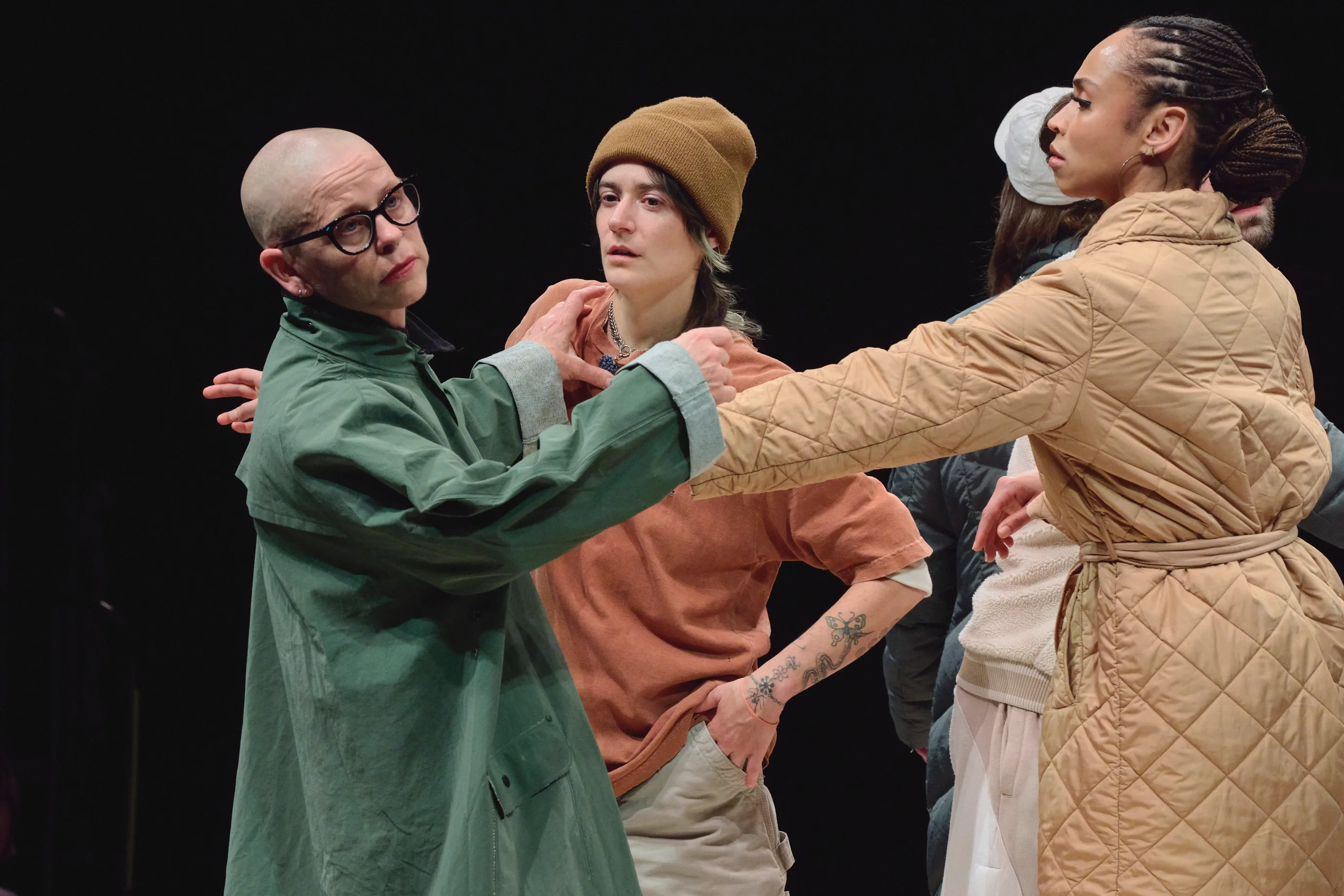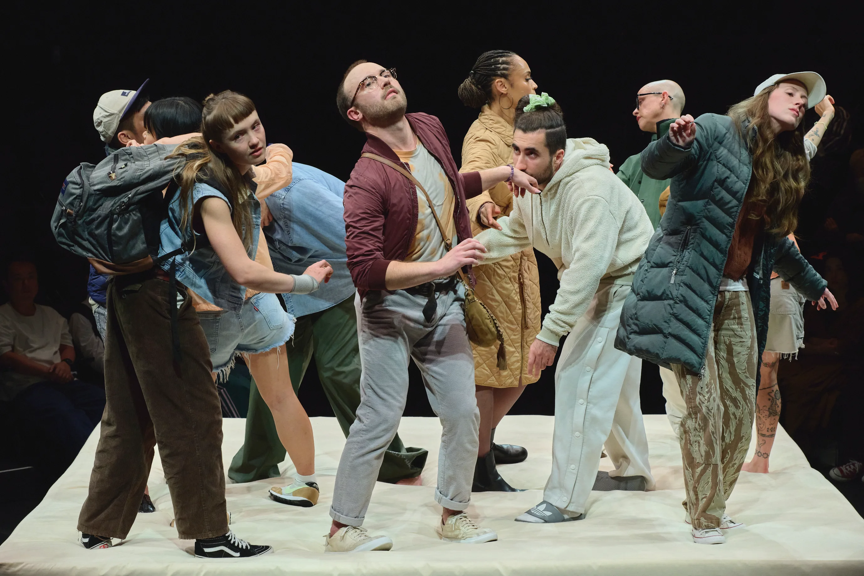 Skin......Teeth......Tongue......Vein......Blood.......不穏なコーラスとともに入場した10人によって、活人画のようなパフォーマンスが幕を開ける。舞台となる中央の白い大きなマットレスは、目算で3m×3m、高さは50cmほど。四方をロの字型の客席に囲まれている。「活人画のような」とはいったものの、その柔らかい足場は明らかに、ポーズをとって静止するのには向いていない。初秋のニューヨークを歩いていそうな老若男女が、不安定なベッドのうえに脚を震わせて立ち並ぶ。観客に悟られないようさりげなく動き、ちょっとよそ見をした隙に次々とポーズを変え、いつのまにかそこかしこでコンタクトを始めている。禁欲的で端正な絵作りには、ゲーム的な緊張感が漂う。企みに満ちた目線の動き、無理な姿勢を保持する筋肉の収縮と息遣いは、どこか「だるまさんが転んだ」を思わせる。