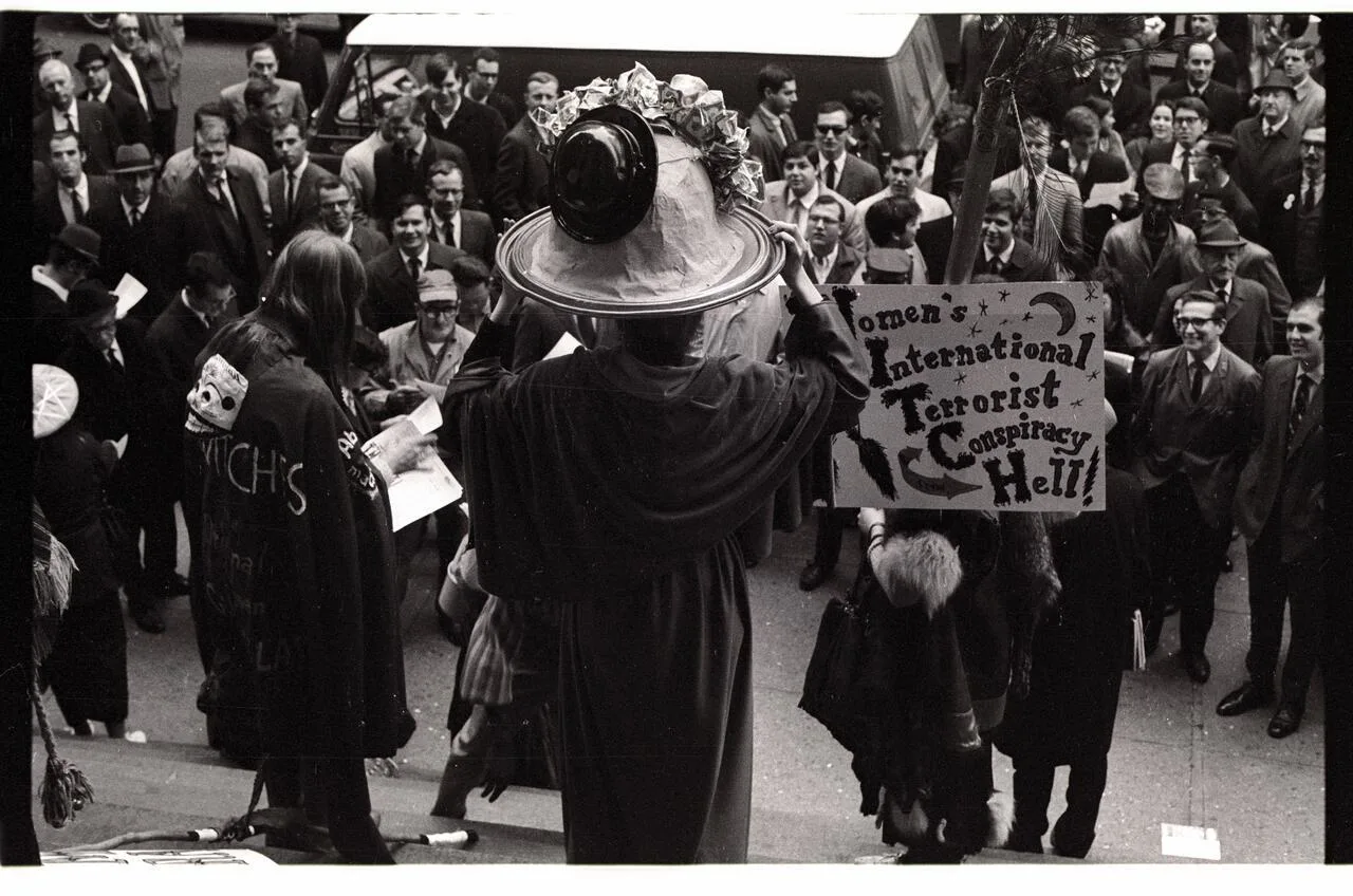 もちろん、街頭に繰り出す魔女たちの活動は新しいものではない。1968年にニューヨークに登場したW.I.T.C.H.(Women’s International Terrorist Conspiracy from Hell:地獄からの女性国際テロリスト陰謀団の頭文字からなる)は、ホウキをもって、黒い三角帽をかぶり、ニューヨークからバークレー、シカゴまで、ウィットに富んだ様々な抗議活動を繰り広げ、物議をかもした。彼女たちはバレンタインデーの翌日に結婚式場に押し入って非人間的な制度に罵倒を浴びせ、ハロウィーンには皆で集ってウォール街の証券取引所に陰謀を企てた。