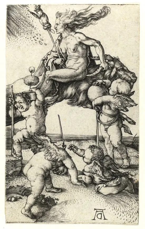 ところで、魔女はなぜホウキに乗って空を移動しているのだろうか。というのも、魔女はホウキがなくても飛ぶことができる。デューラーの絵では雄ヤギにのって空を飛んでいた。逆にいえば、空飛ぶホウキがあるわけではないのだ。