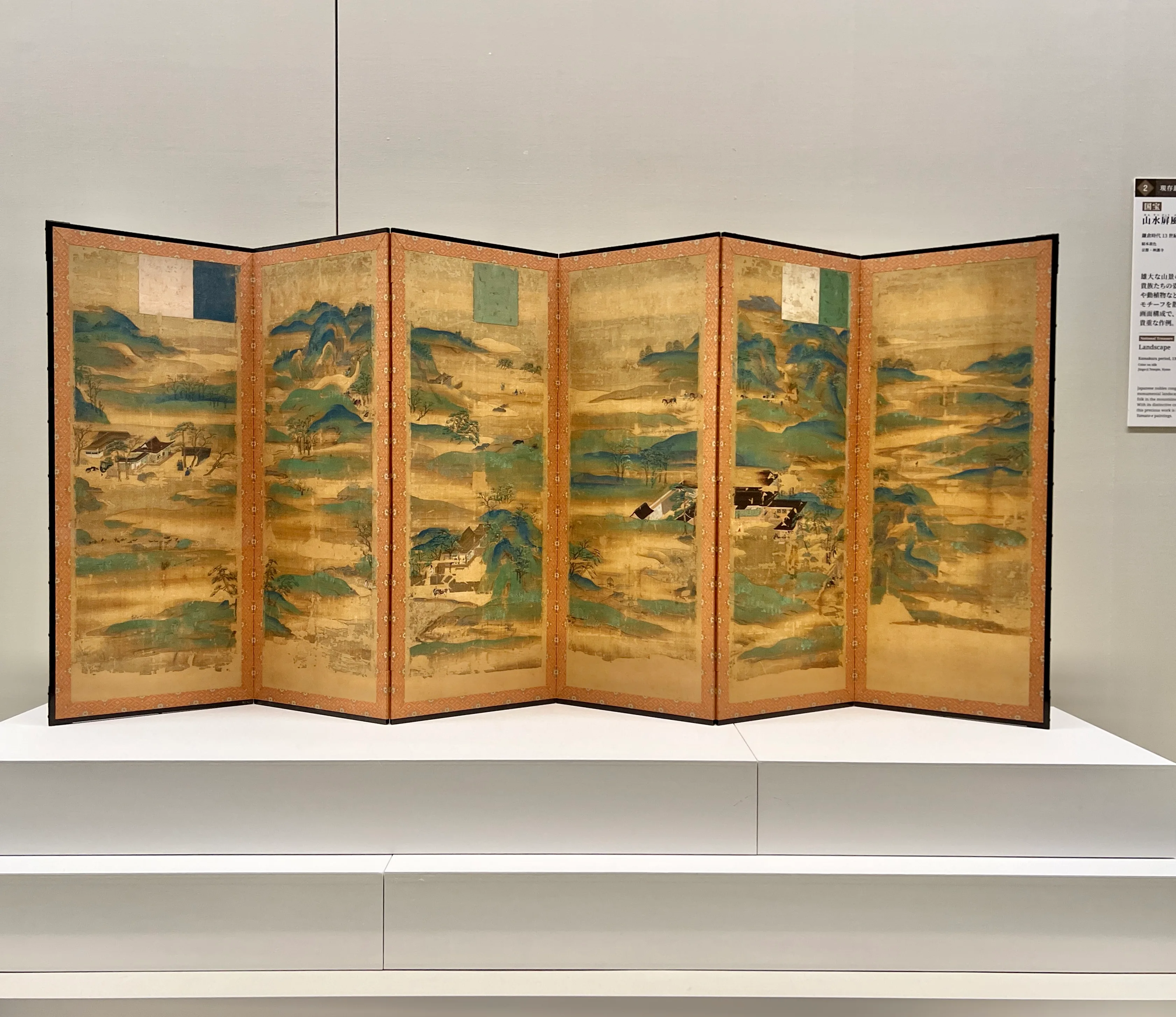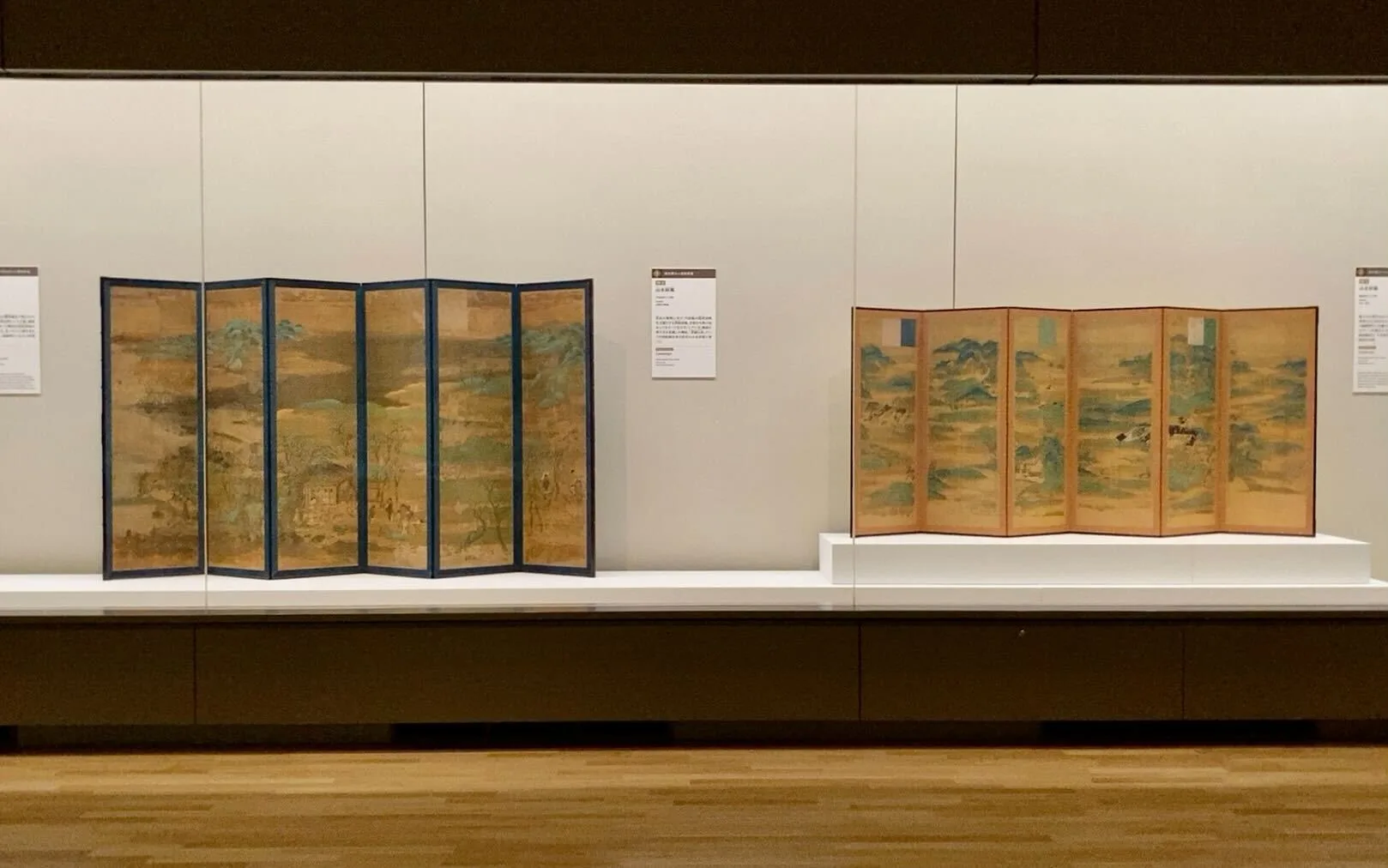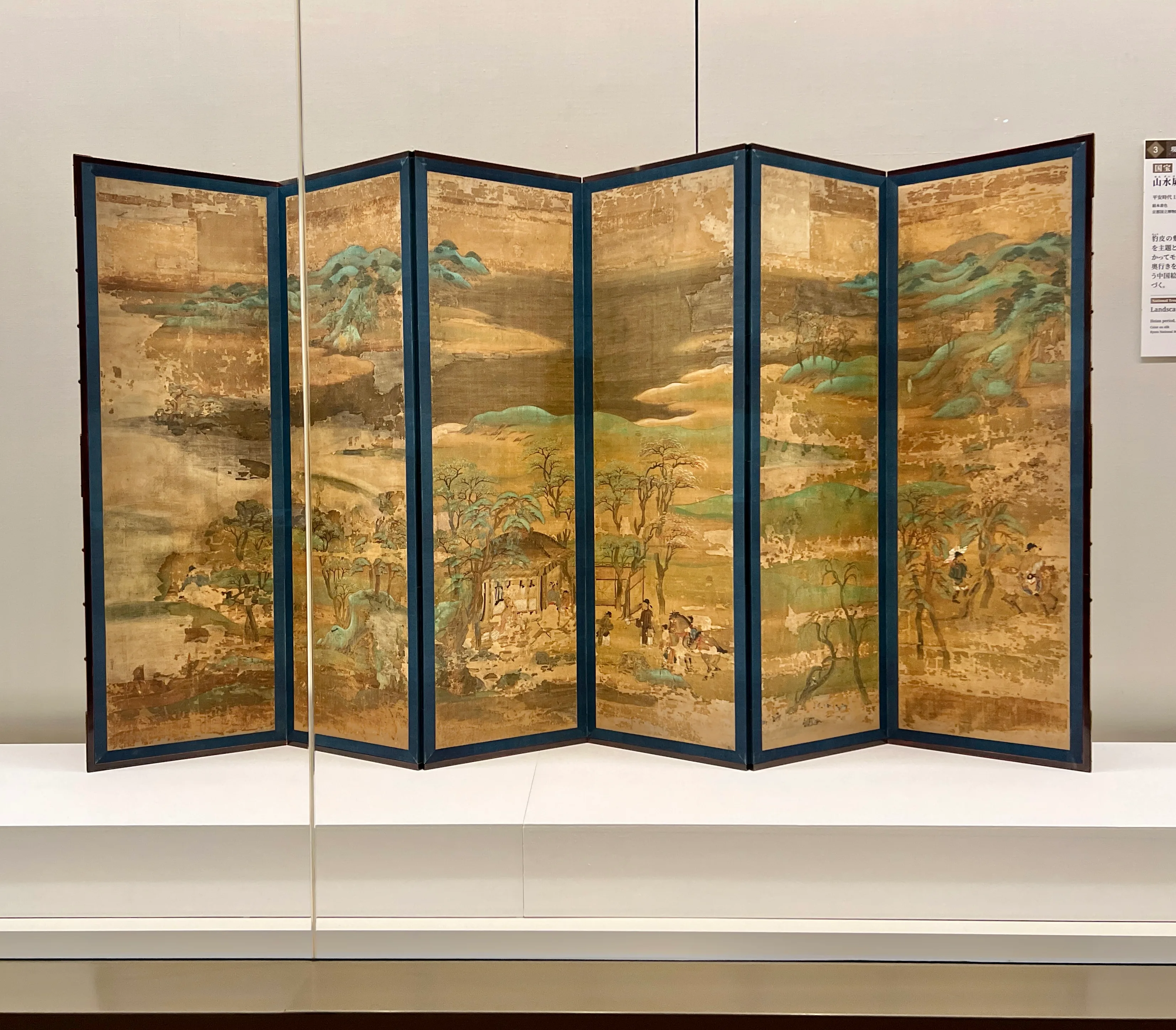 その中で最初に鑑賞することになるのが、数点の《山水屛風(せんずいびょうぶ)》である。山水(さんすい)の風景を描いたものを「せんずい」と読むのは、仏教行事で用いることによる慣例とされる。まずは、そのひとつである京都国立博物館蔵の《山水屛風》(以下「京博本」とする)を眺めてみた。《山水屛風》としては、現存最古の作品と聞く。