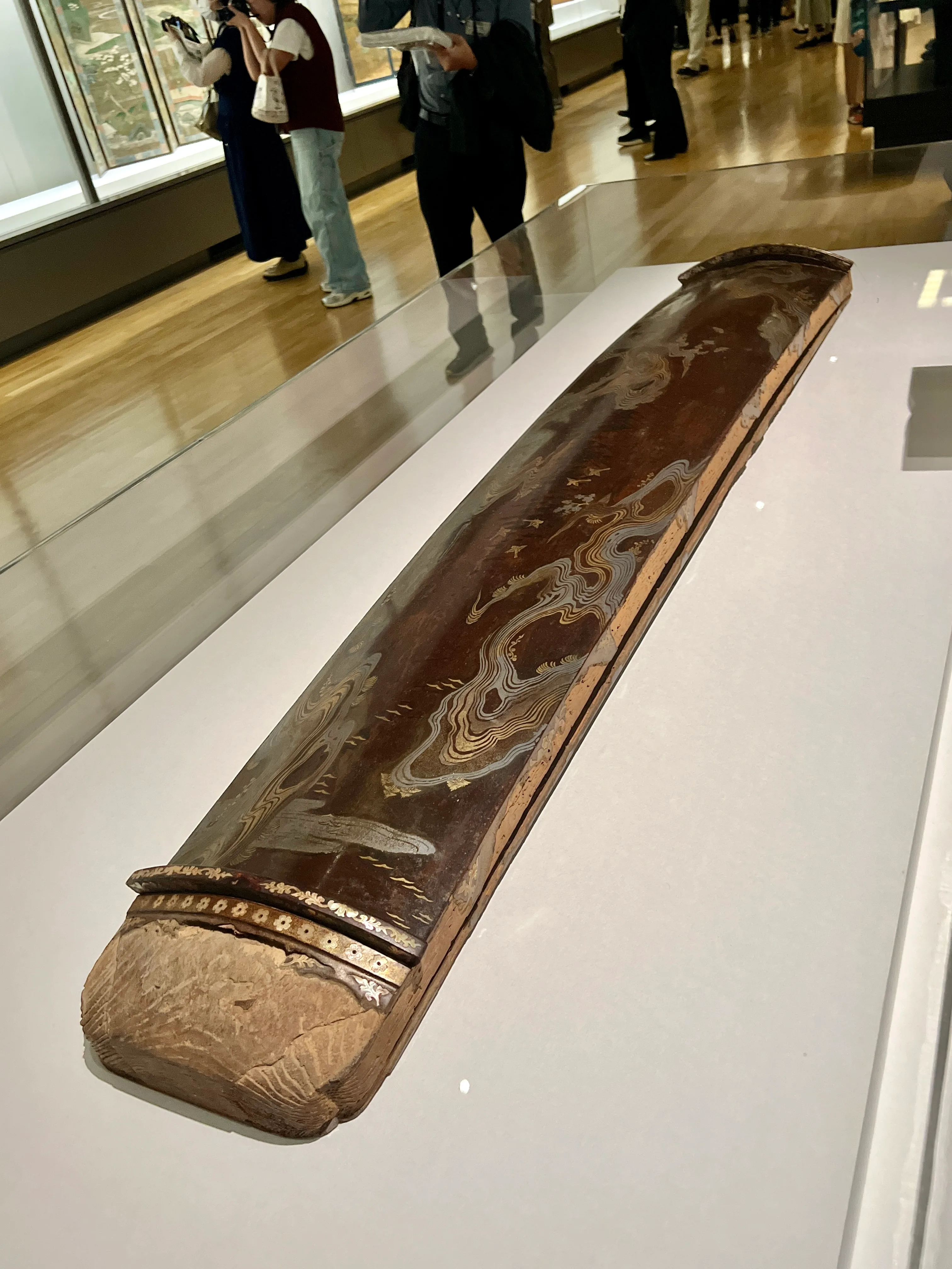 奈良県の春日大社に古神宝として伝わった楽器というが、蒔絵で表現された山水の流麗さがたまらない。自然に対する慈しみや親しみが感じられる。鳥のあしらいなどを含めて、デザインの視点で見ても秀逸である。実際には楽器としては使われなかった可能性もあるという。だが、美しい楽器からは美しい音が出るものである。流れ出る音を聞いてみたいと思わせる逸品だ。