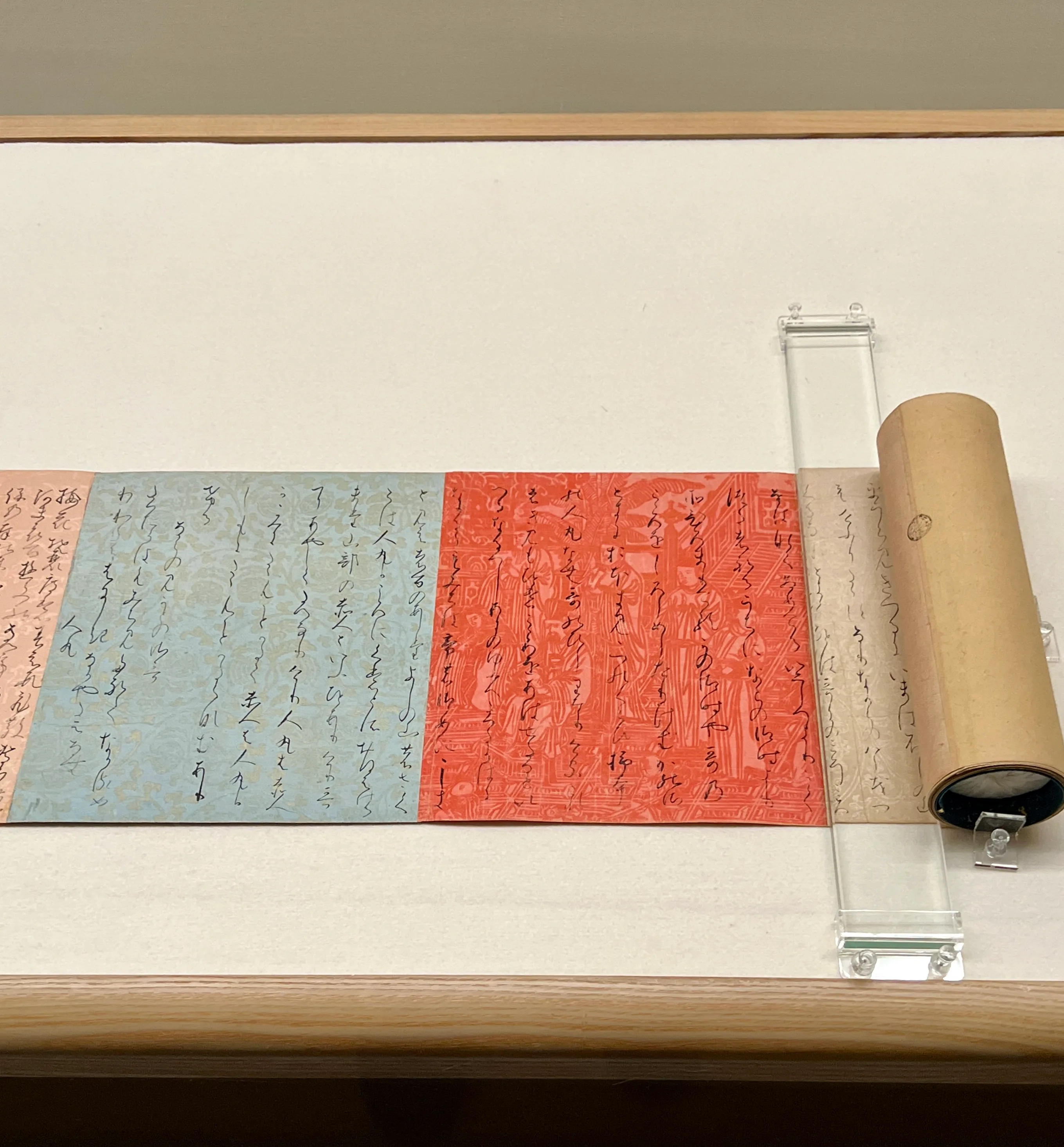 巻物にたくさんの和歌が書かれている。目を引くのは、媒体である料紙が数種類の色のついた紙で継がれていることだろう。その紙をよく見ると、人物などが描かれていることがわかる。赤い料紙に描かれているのは、唐風の衣装を着た人物のように見える。どうやら、ここにも中国の影があったようだ。しかし墨でしっかりと書かれた和歌は、十分な「やまと」を表現している。