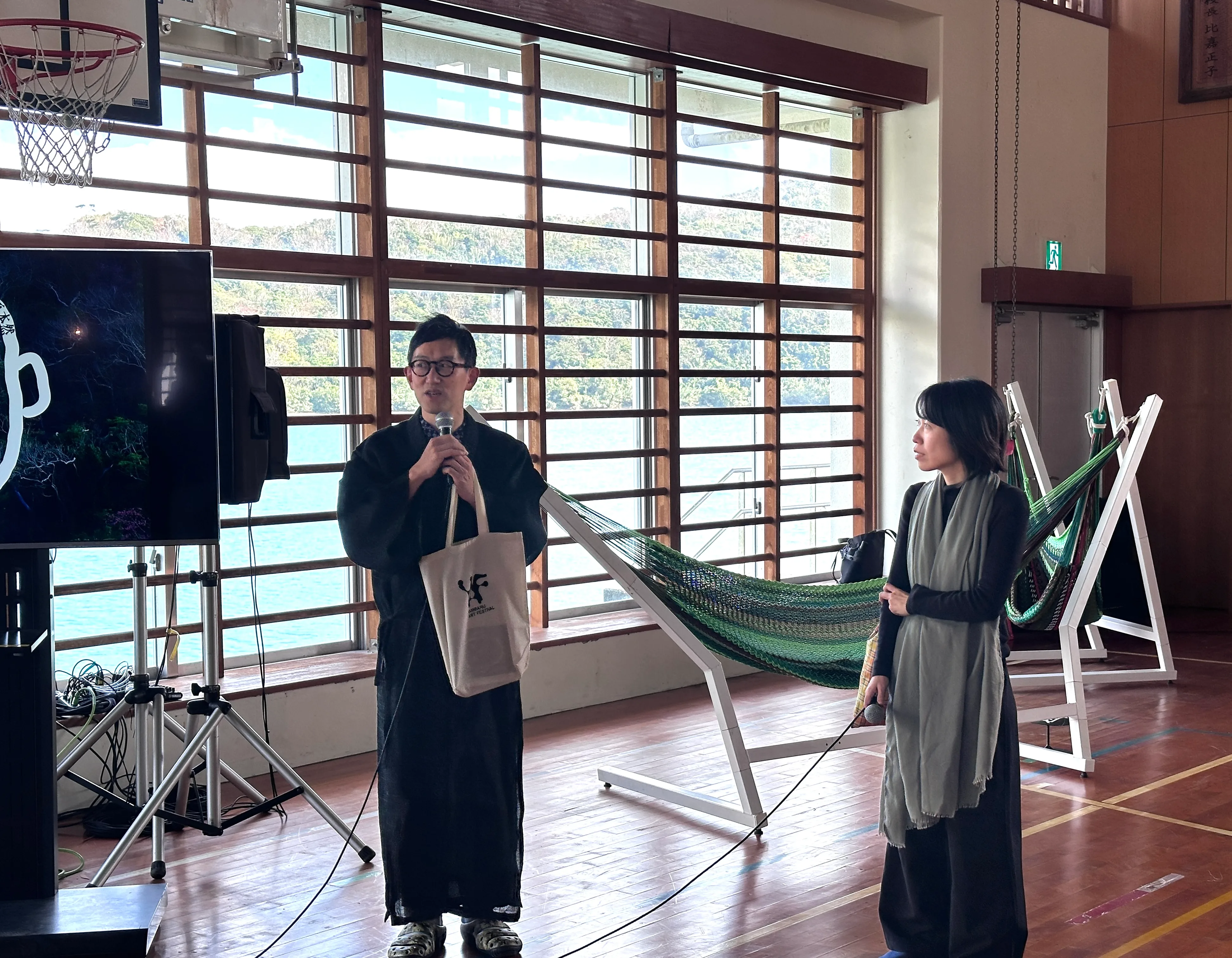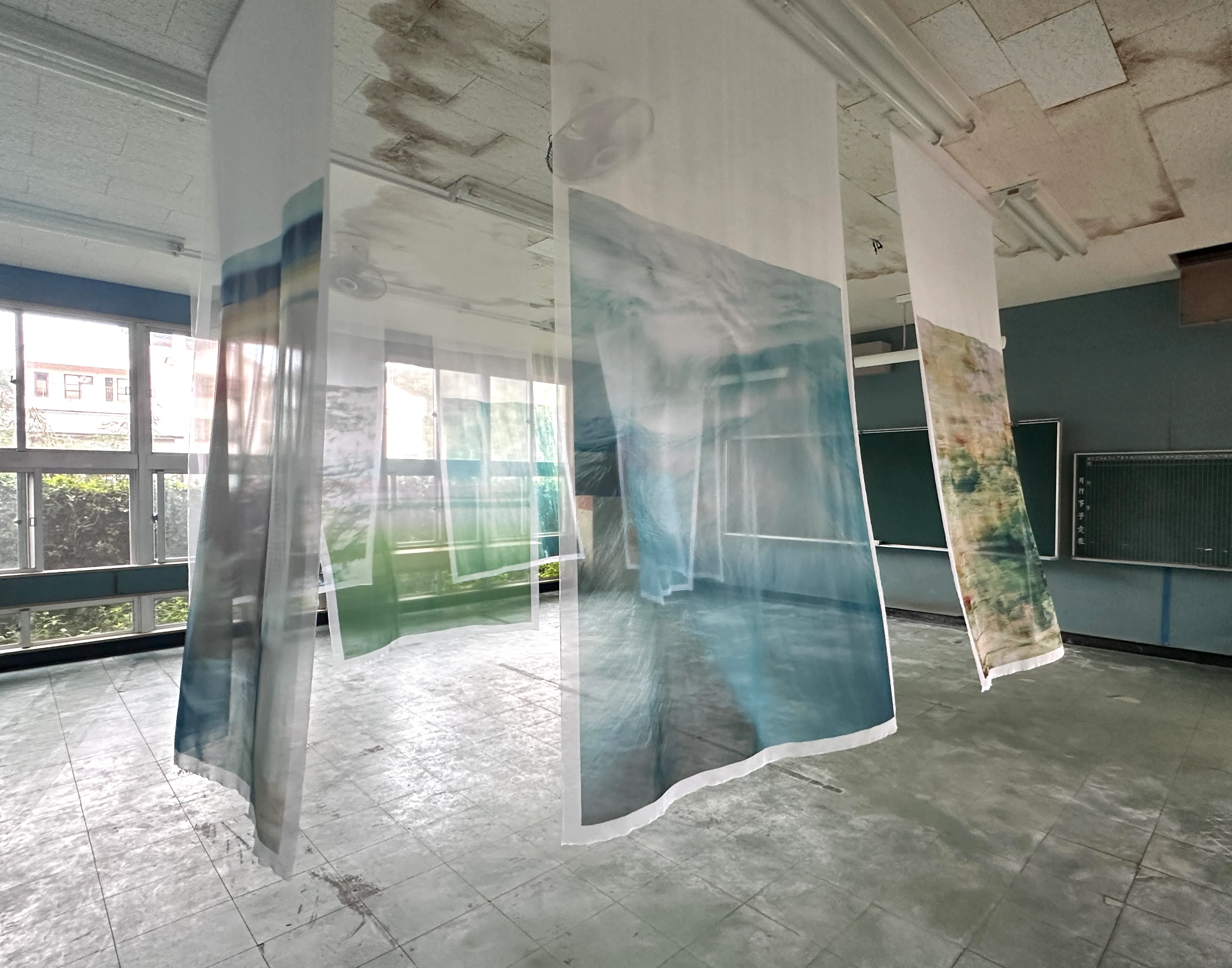 映像作家、写真家の林響太朗とミュージシャンのRyu(Ryu Matsuyama)からなるKYOTARO HAYASHI x Ryuは、海風がそよぐロケーションにぴったりのインスタレーション《カタチをあたえる。》を出品。Ryuによる心地よい音楽が流れるなか、林の写真がプリントされた布が風をとらえて絶え間なく形を変える本作について、「やんばるでしか見えない風を再現できたと思う」とRyuは自信を見せる。