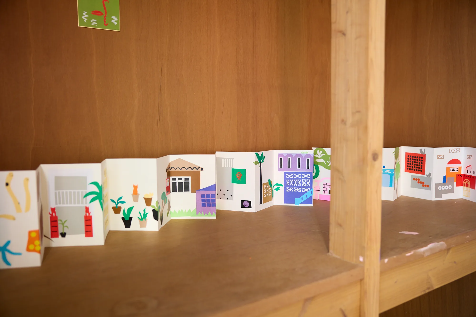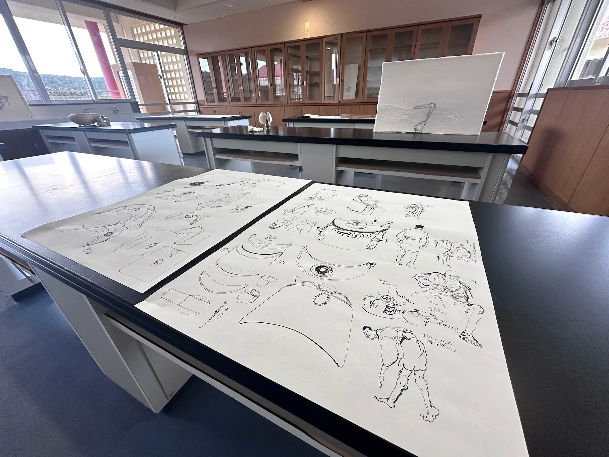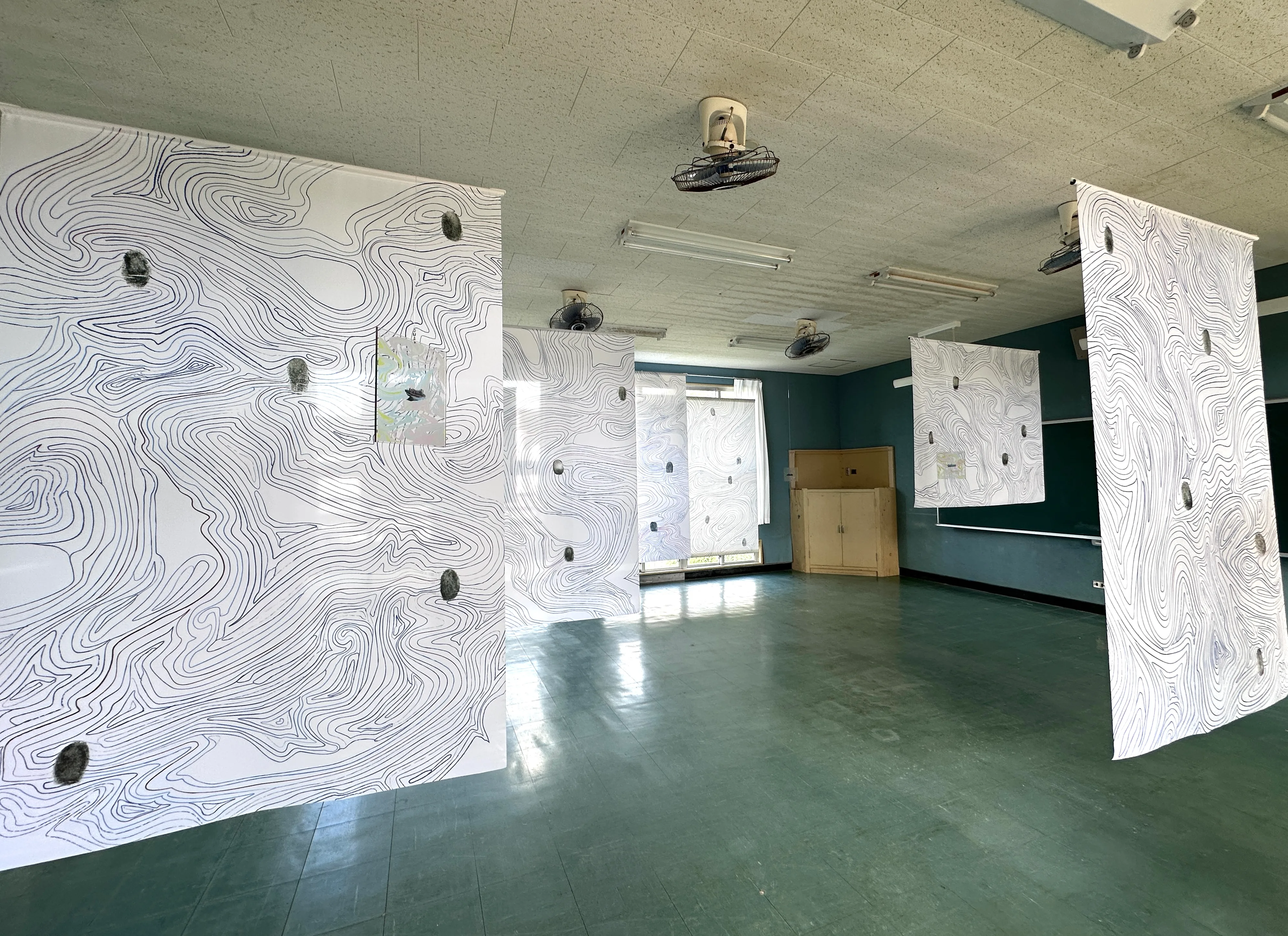 中澤ふくみは、沖縄における「人間と道具」の関係性をモチーフに作品を制作。今回は短く繰り返すアニメーション映像を教室内に投影し、和紙に描いたアニメーションの原画をすべてのりで貼り合わせたものを、「物質的身体」として展示している。
