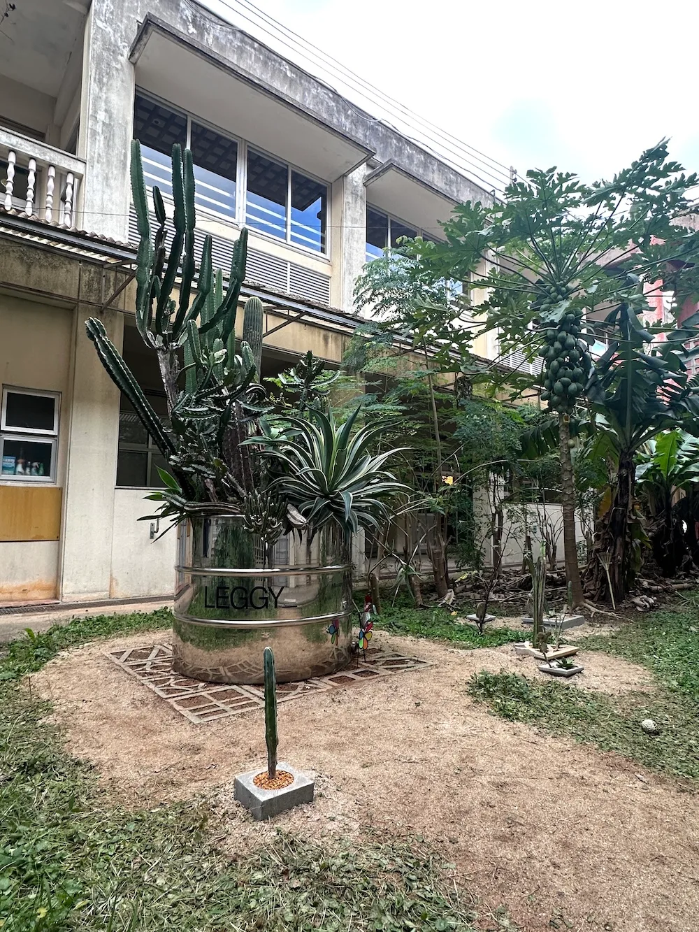 Chim↑Pom from Smappa!Group のメンバーの林靖高と稲岡求、アーティスト西村健太による園藝プロジェクトのLeggy_は、7日間沖縄を北上しながら米軍基地、市場、歴史資料館などに立ち寄り素材を集め、海岸の漂流物や黙認耕作地の土を用いて給水タンクに植える「寄せ植え=チャンプル植え」を庭にインストール。展覧会期後も継続して展示され、変容していく。