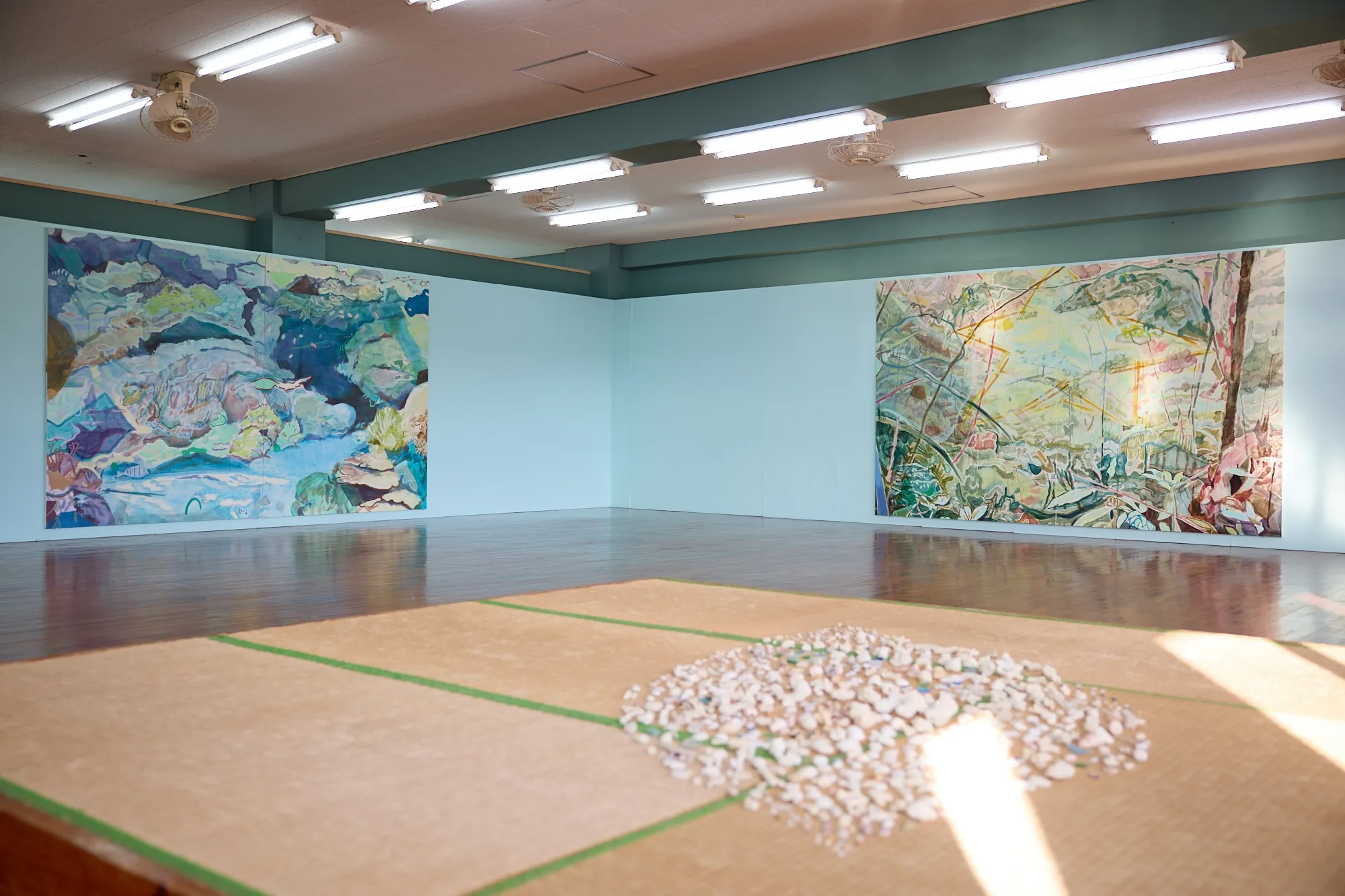 柏原由佳は、沖縄の各地でスケッチをし、様々な記憶を頼りに、南城美術館で3ヶ月滞在制作した227cmx364cmの大型絵画作品や、小作品などを展示。窓の外から見える沖縄の海と絵画とのコントラストが美しい空間が広がる。