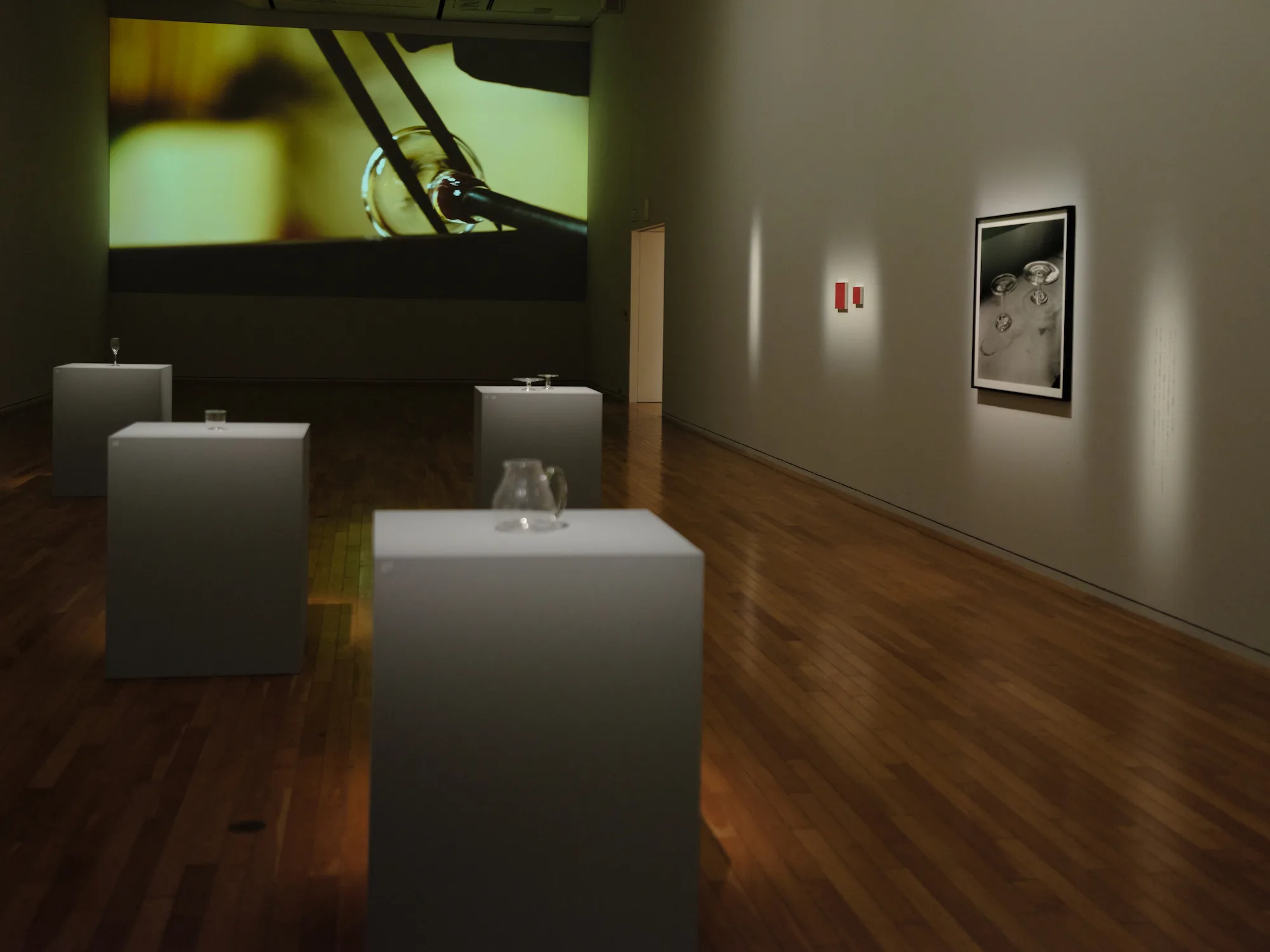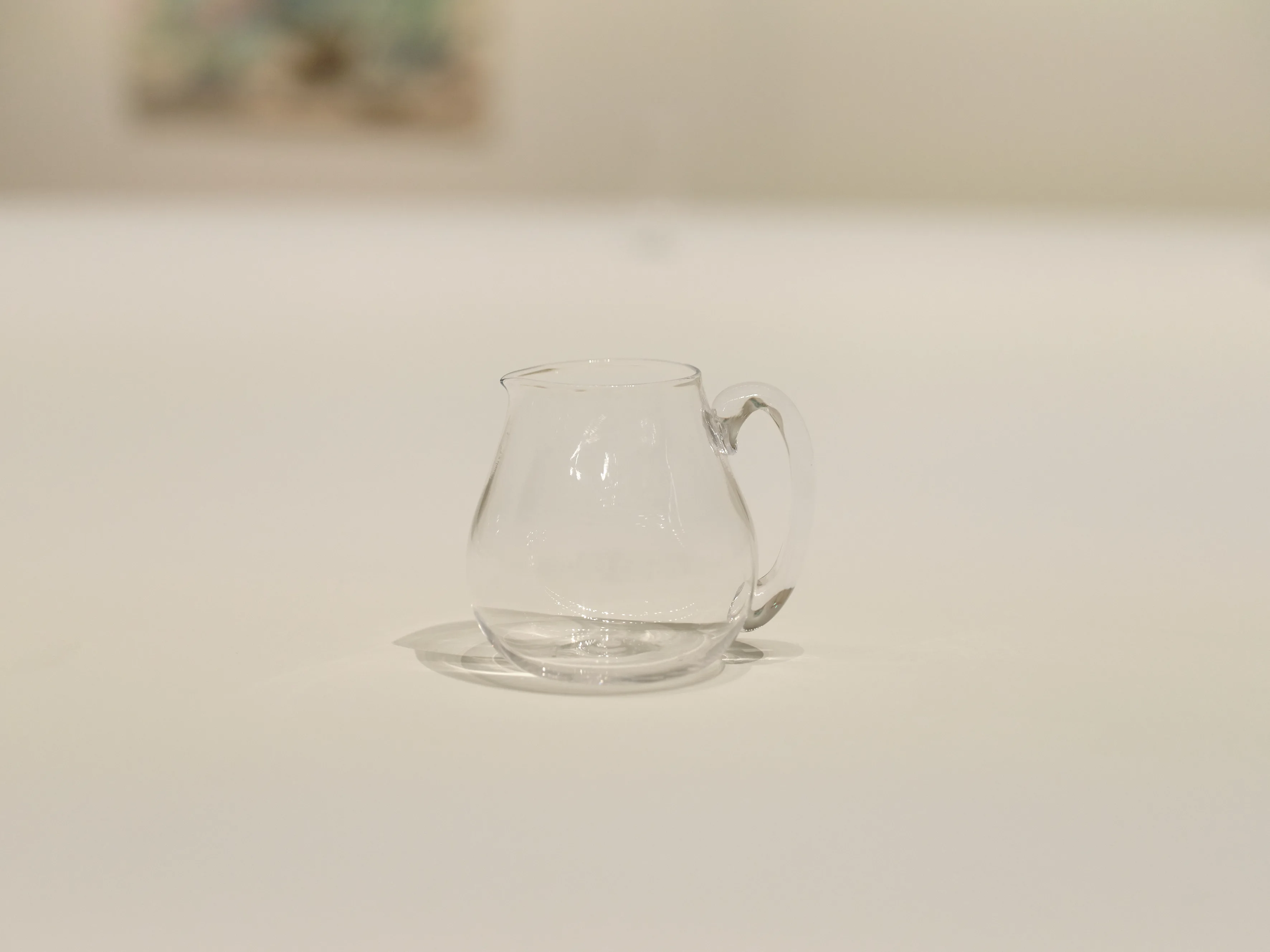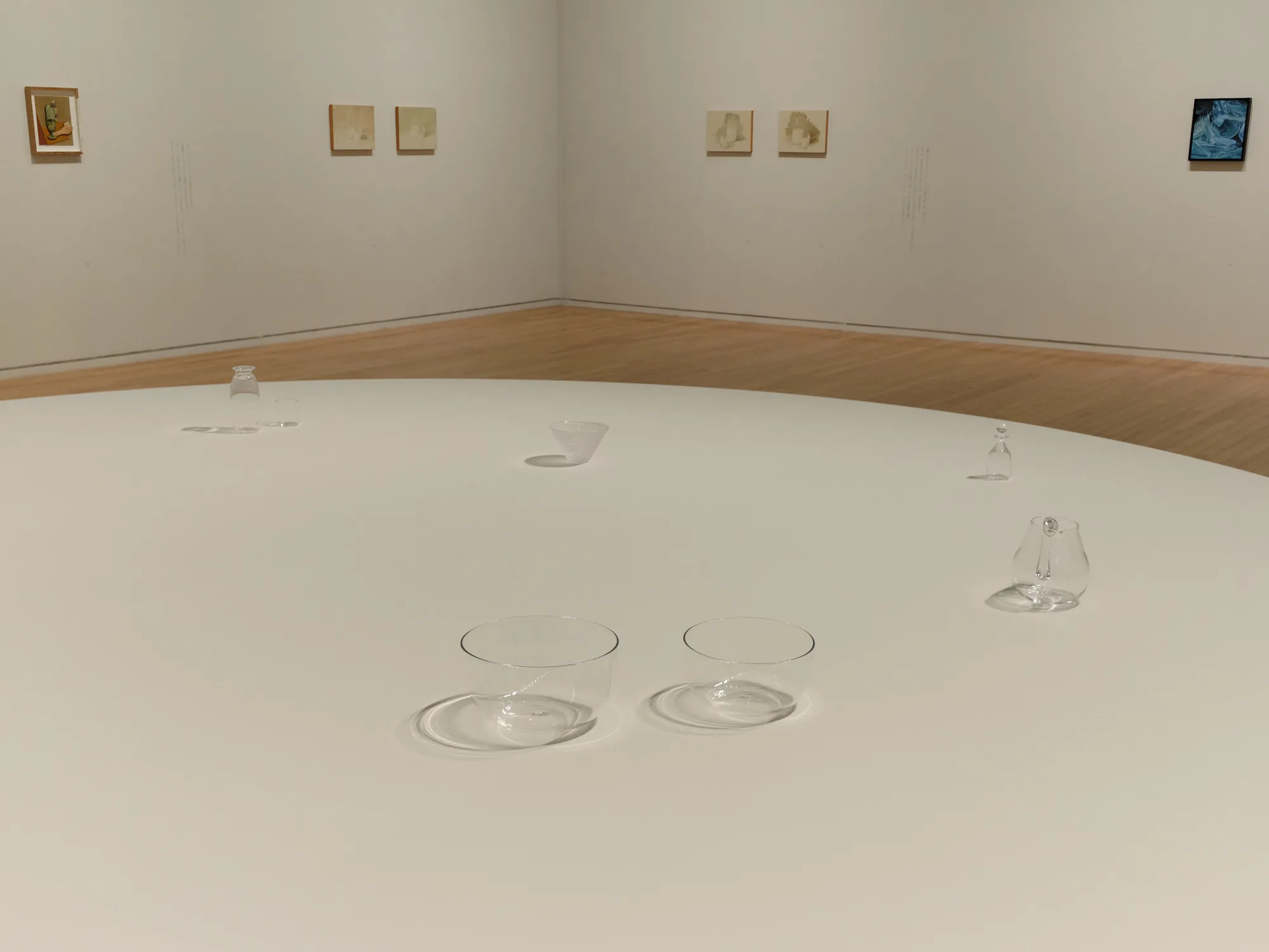会場の入り口には、スウェーデンの画家アンナ・ビヤルゲルの《milk》(2021)が展示されている。ビヤルゲルのリクエストは「牛乳を飲むためのグラス」「小ぶりで、牛乳の冷たさを指で感じられる薄いグラス」というもの。山野は自身の技法を踏まえ、できるだけ薄く、ただし口当たりを意識してちょうどよい厚みをもたせたものを何度も作り直し、ようやく完成させた。展示室に入ると、そこには絵の中で牛乳が注がれていた山野のグラスが置かれ、さらにそのグラスがビヤルゲルのアトリエに佇む姿をとらえた、三部による大判のモノクロ写真を見ることができる。