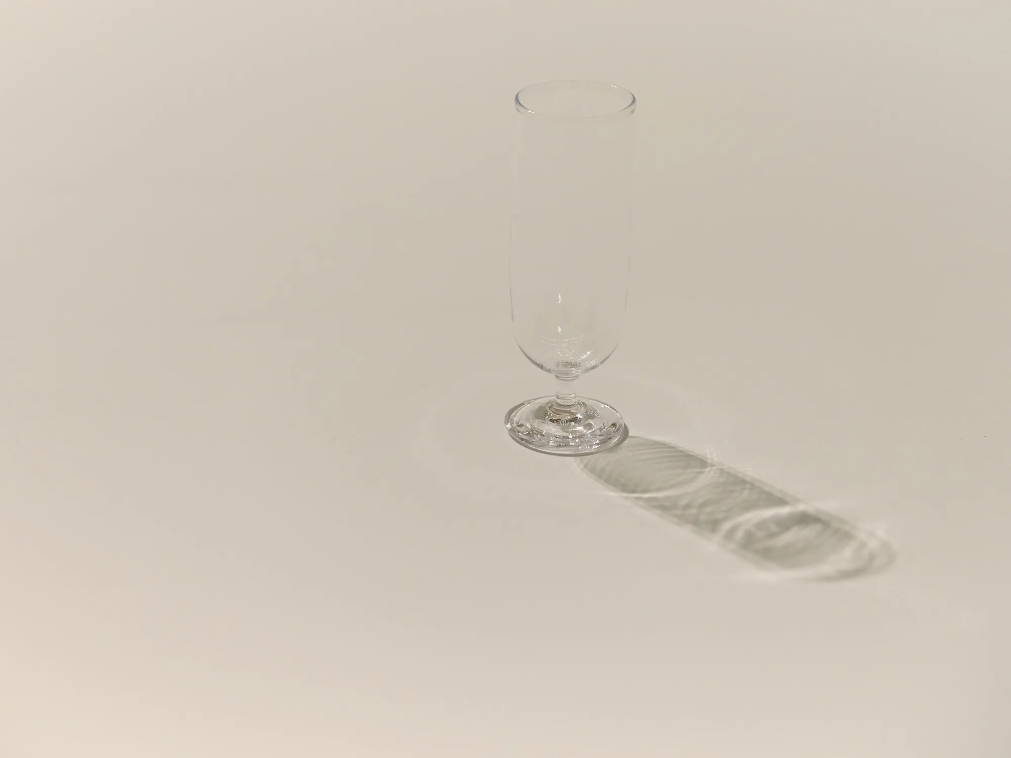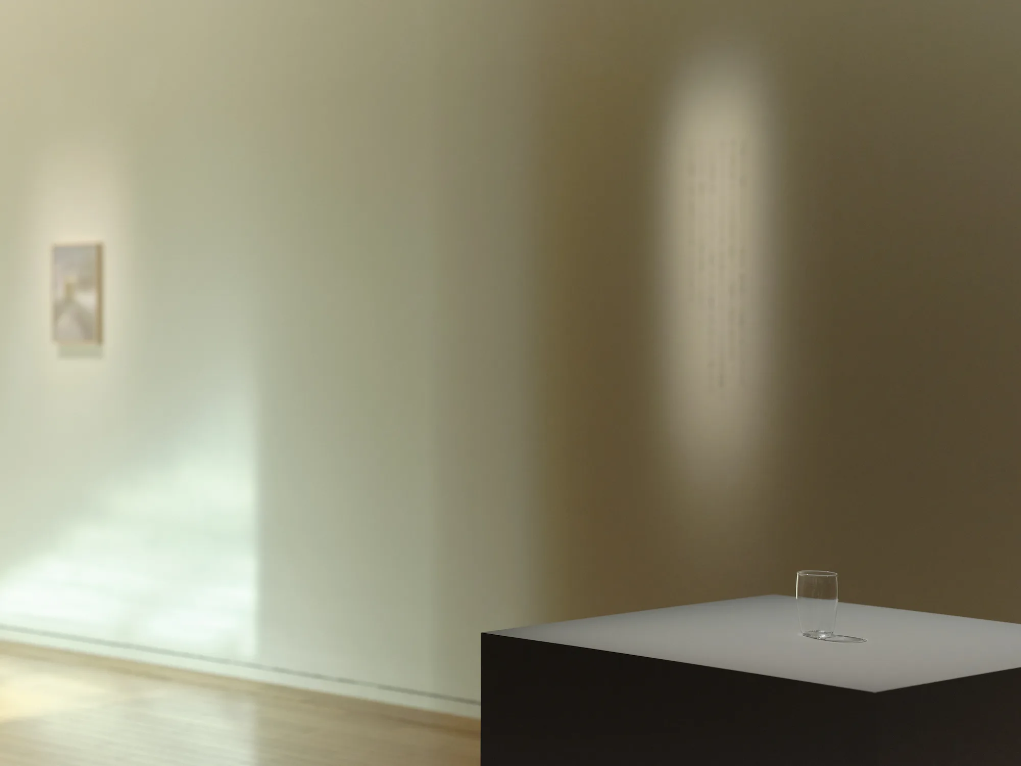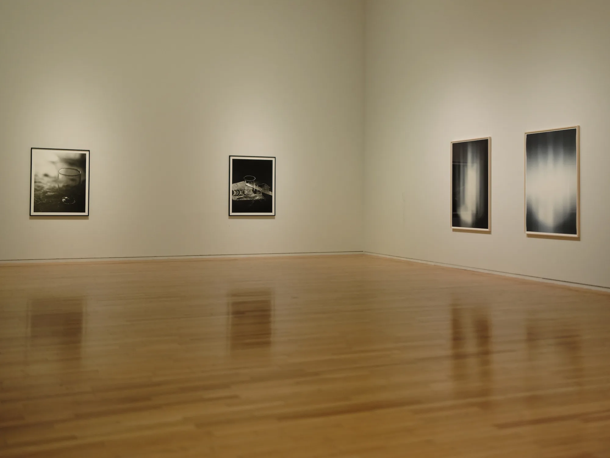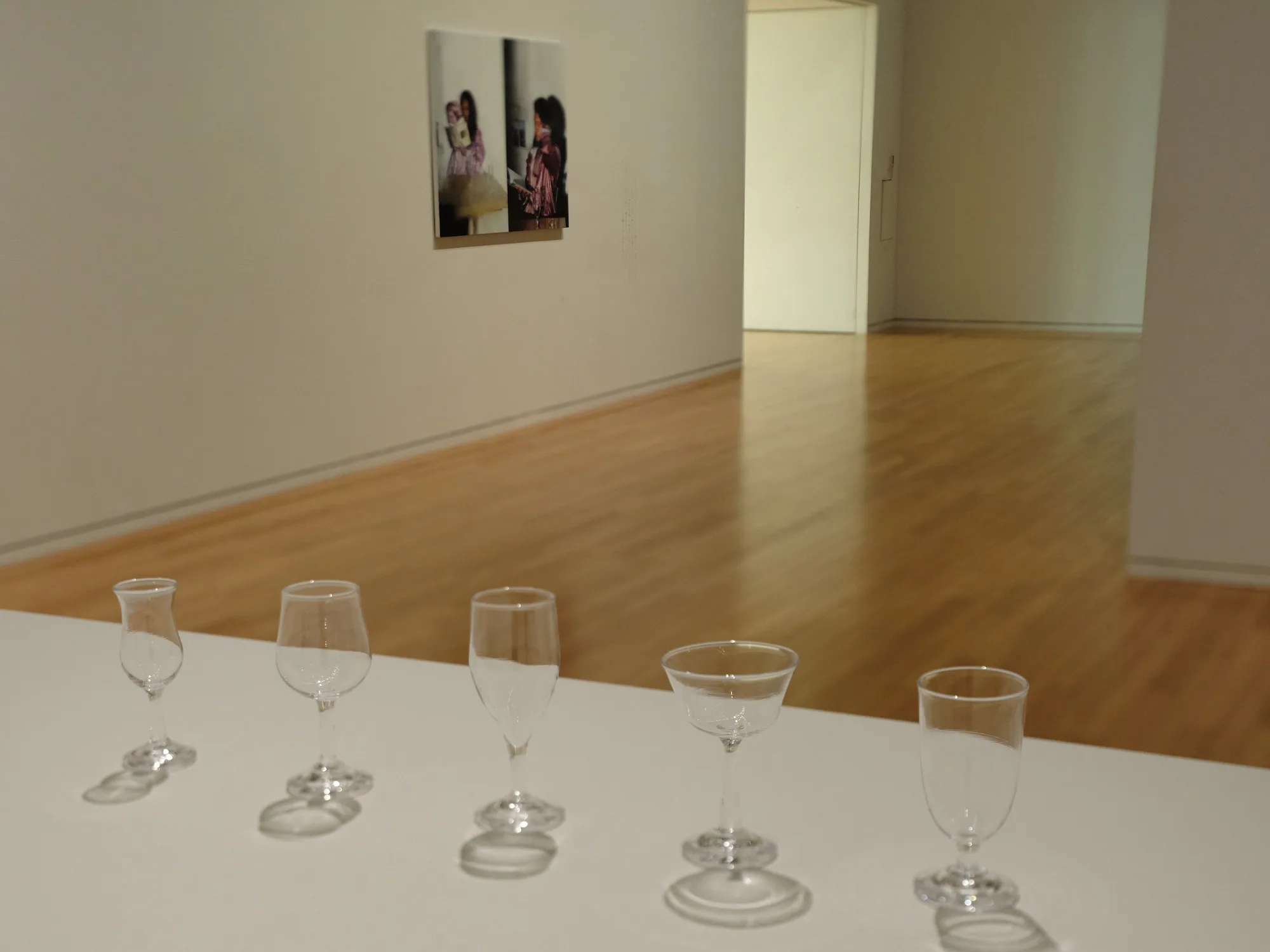 会場の入り口には、スウェーデンの画家アンナ・ビヤルゲルの《milk》(2021)が展示されている。ビヤルゲルのリクエストは「牛乳を飲むためのグラス」「小ぶりで、牛乳の冷たさを指で感じられる薄いグラス」というもの。山野は自身の技法を踏まえ、できるだけ薄く、ただし口当たりを意識してちょうどよい厚みをもたせたものを何度も作り直し、ようやく完成させた。展示室に入ると、そこには絵の中で牛乳が注がれていた山野のグラスが置かれ、さらにそのグラスがビヤルゲルのアトリエに佇む姿をとらえた、三部による大判のモノクロ写真を見ることができる。