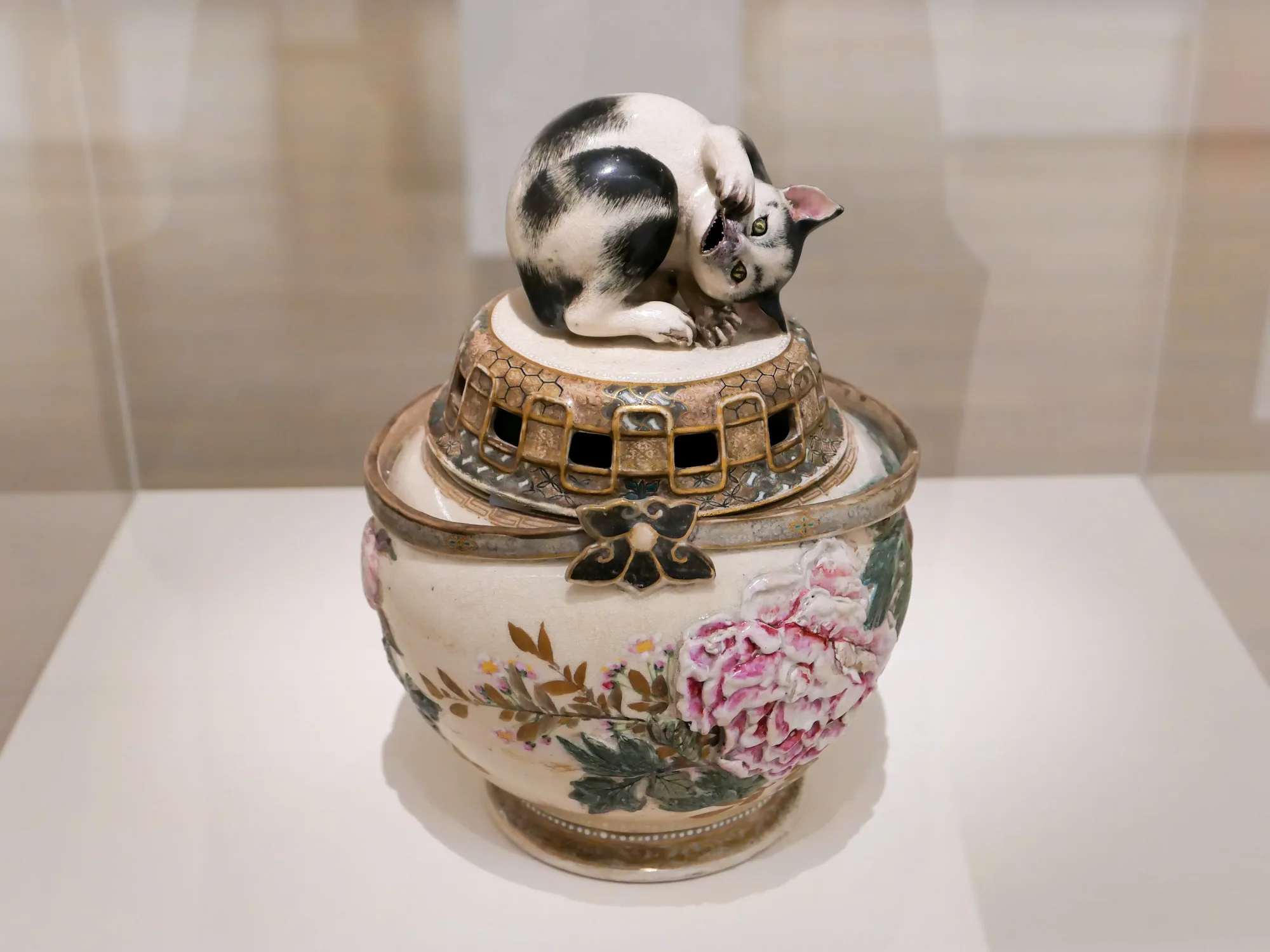 展示室で一際目を引くリアルな猫が上に乗った陶磁器の作品は、1870年に京都から横浜に移り住み、窯を構えた宮川香山の作品。