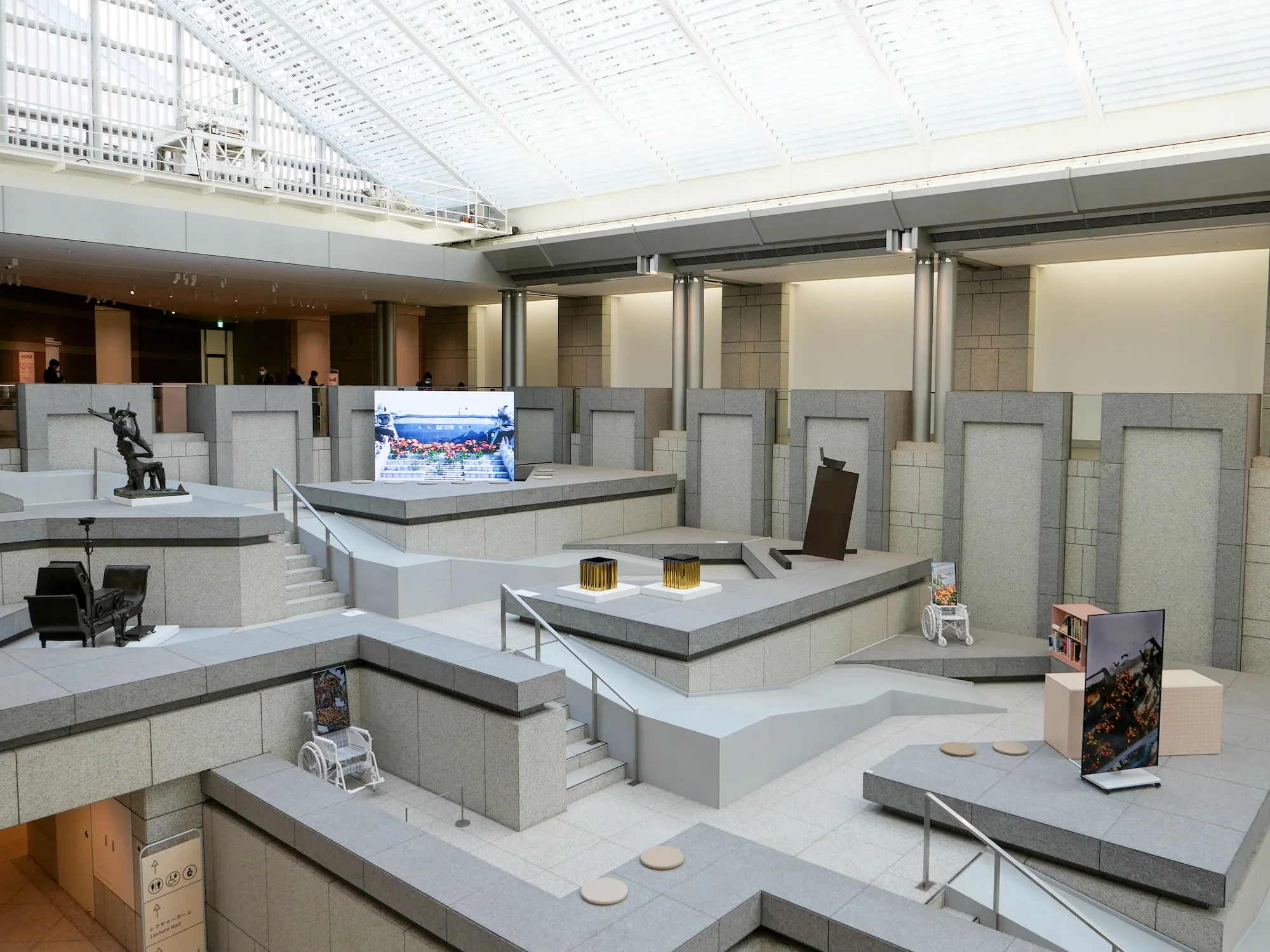 左右対象に広がる階段の踊り場には、それぞれ「丸」と「四角」を切り口に彫刻作品を展示。小さな子供が靴を脱いで楽しめる「くつぬぎスポット」も新設されたほか、館内の授乳室を増やし、調乳器を新たに導入するなど、子供連れの来館者をサポートする設備の充実も。エレベーターも1台新設された。無料エリアは展示室前のホワイエまで拡張され、子供から大人まで自由に過ごせる場所として人々を迎え入れる。