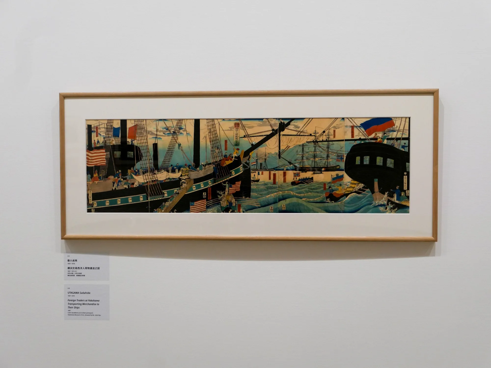 第2章「みなとを、ひらけ」からは、1859年の開港以降の街の姿を伝える。開港前後の横浜の風物を描く「横浜浮世絵」を手がけた歌川貞秀の作品群は、幕府が修好通商条約を結んだ国々の人々が国旗を掲げて行進する様子や、荷物を運搬する西洋の船など、活気のある港の様子を描き出している。このような西洋人の姿や鉄道、西洋風の街並みなどは当時錦絵として流通し、市外の人々の好奇心も満たしていたという。